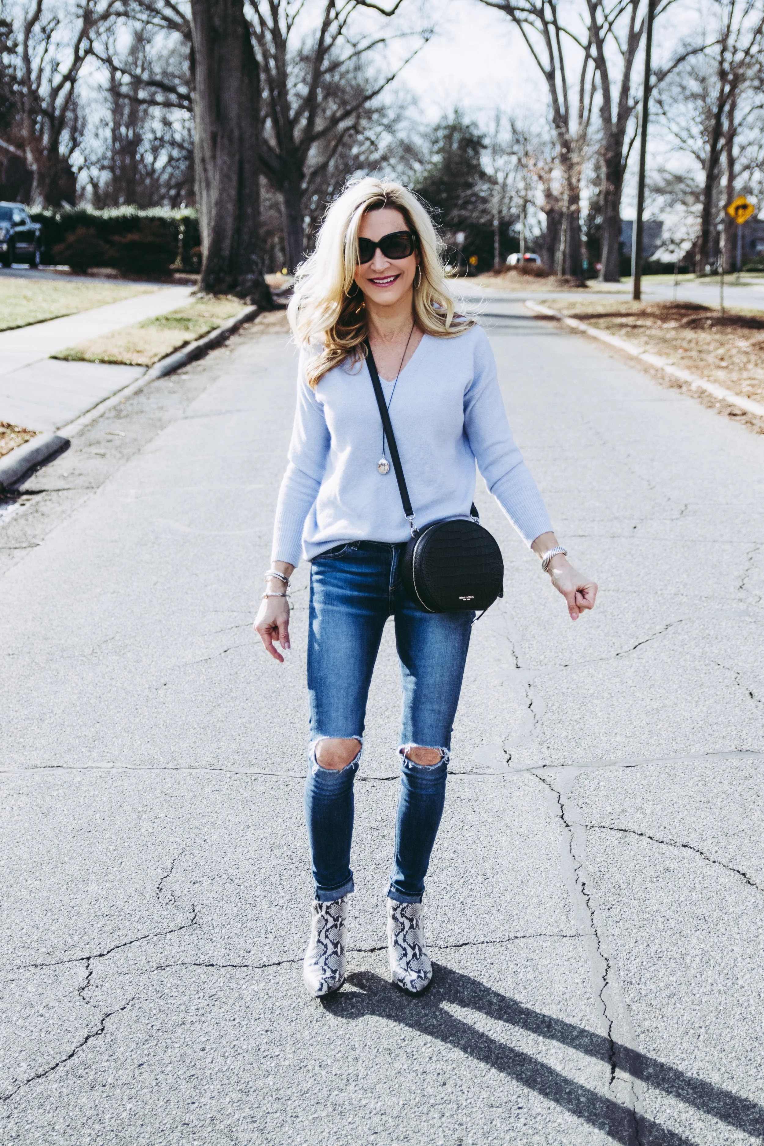 This cute light blue sweater is from Loft and I paired it with some of my favorite Rag and Bone jeans, a round bag from Henri Bendel, and my very comfortable snakeskin Seychelle booties. My locket is by Monica Rich Kossan.