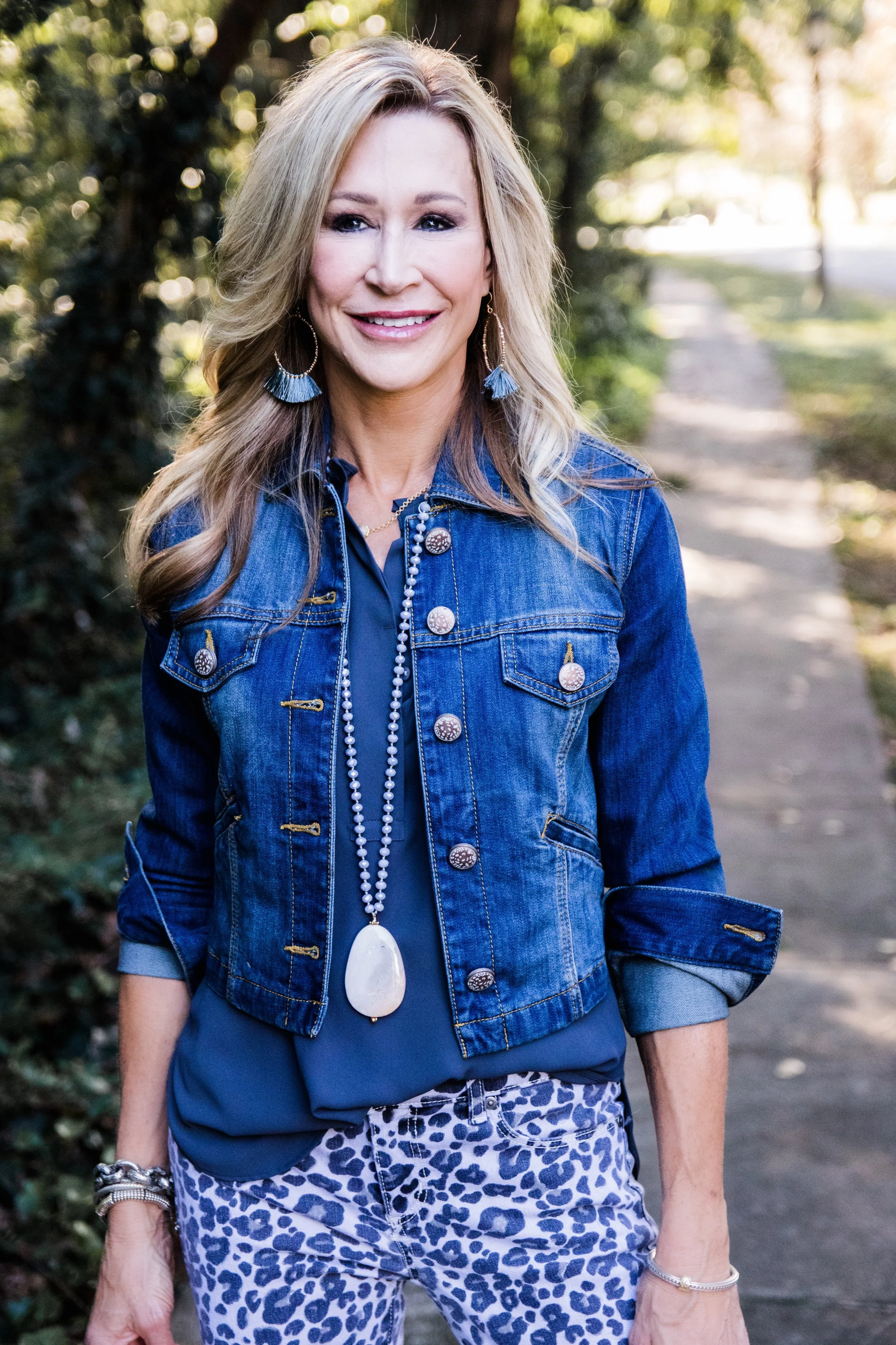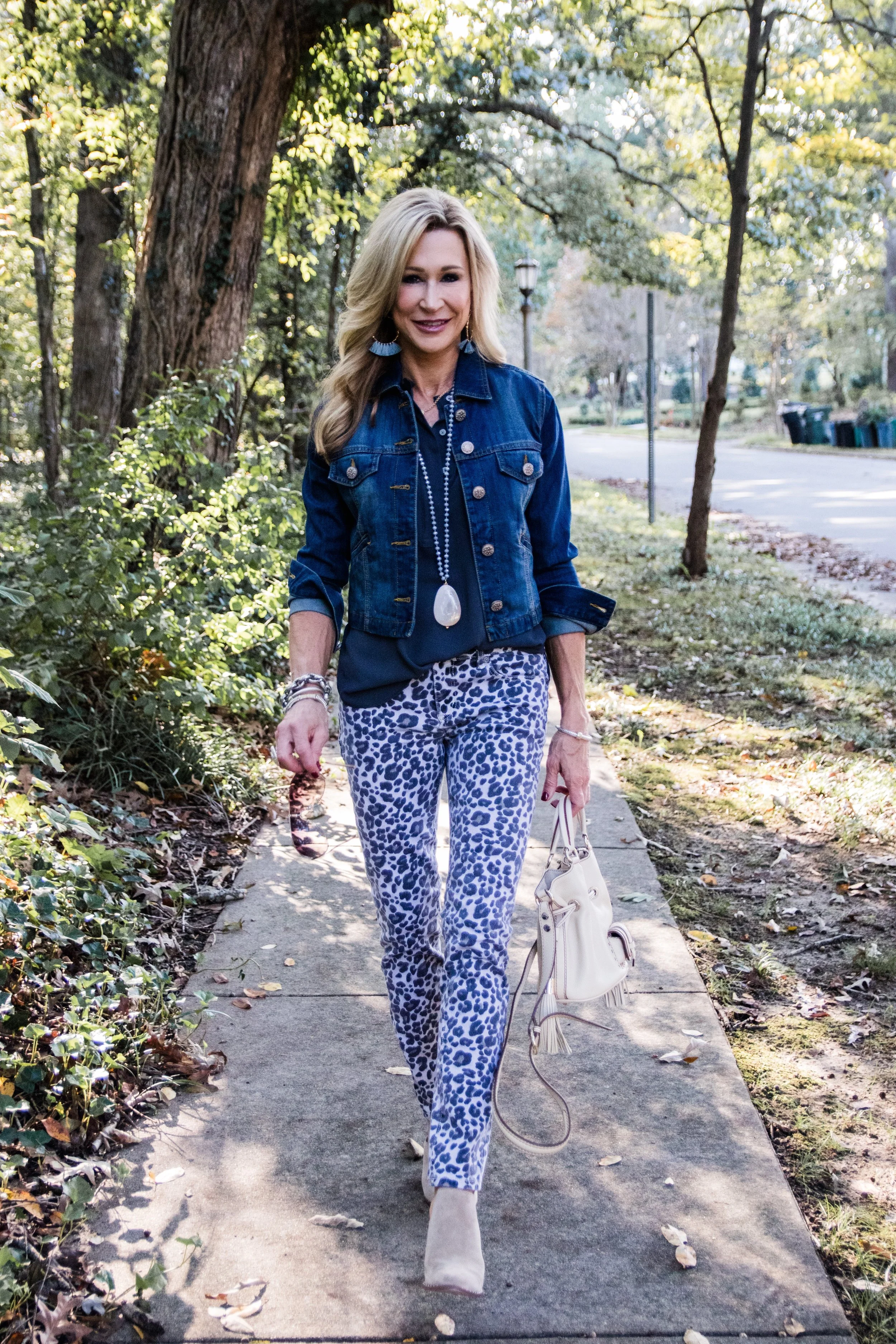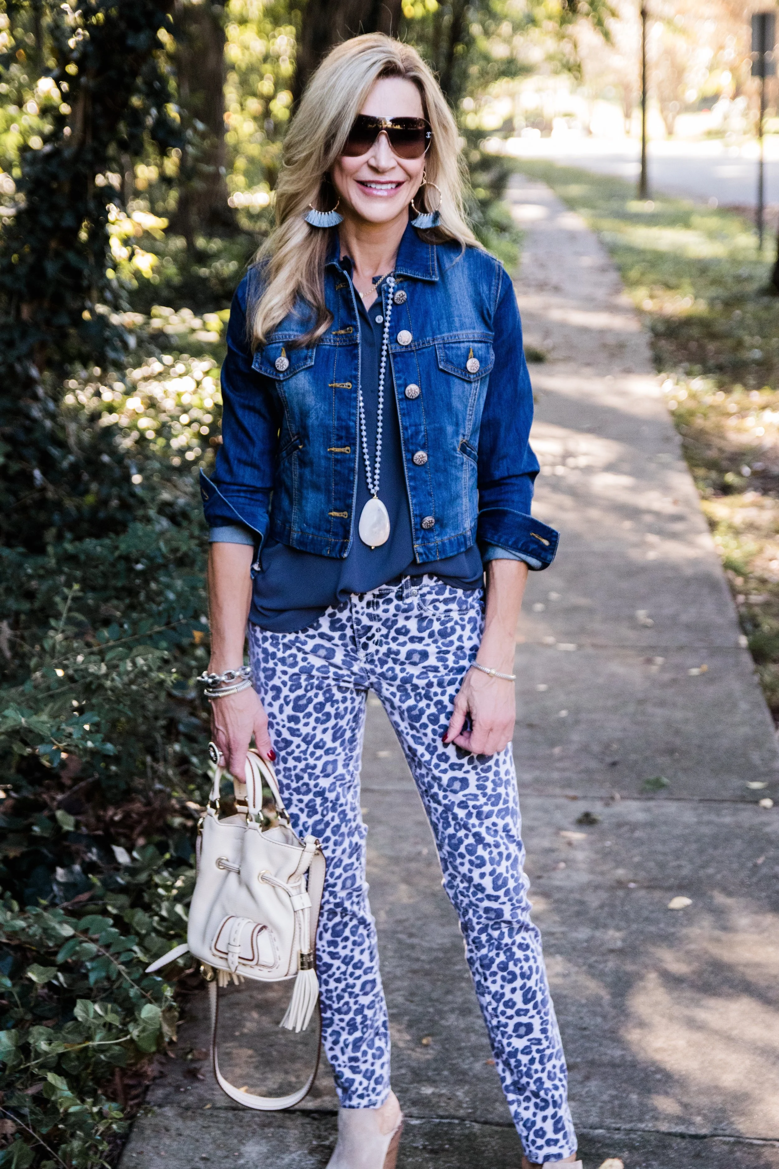 Iβve been wanting to add more leopard to my wardrobe and when I saw these cute jeans at Loft, I knew they would be the perfect thing to mix in with so many different tops and jackets. Here, Iβve paired them with a sleeveless grey blouse, mule booties from Chinese Laundry and a denim jacket from Cabi. I added accessories from Lush Jewelry and a cute bag by Lancel.