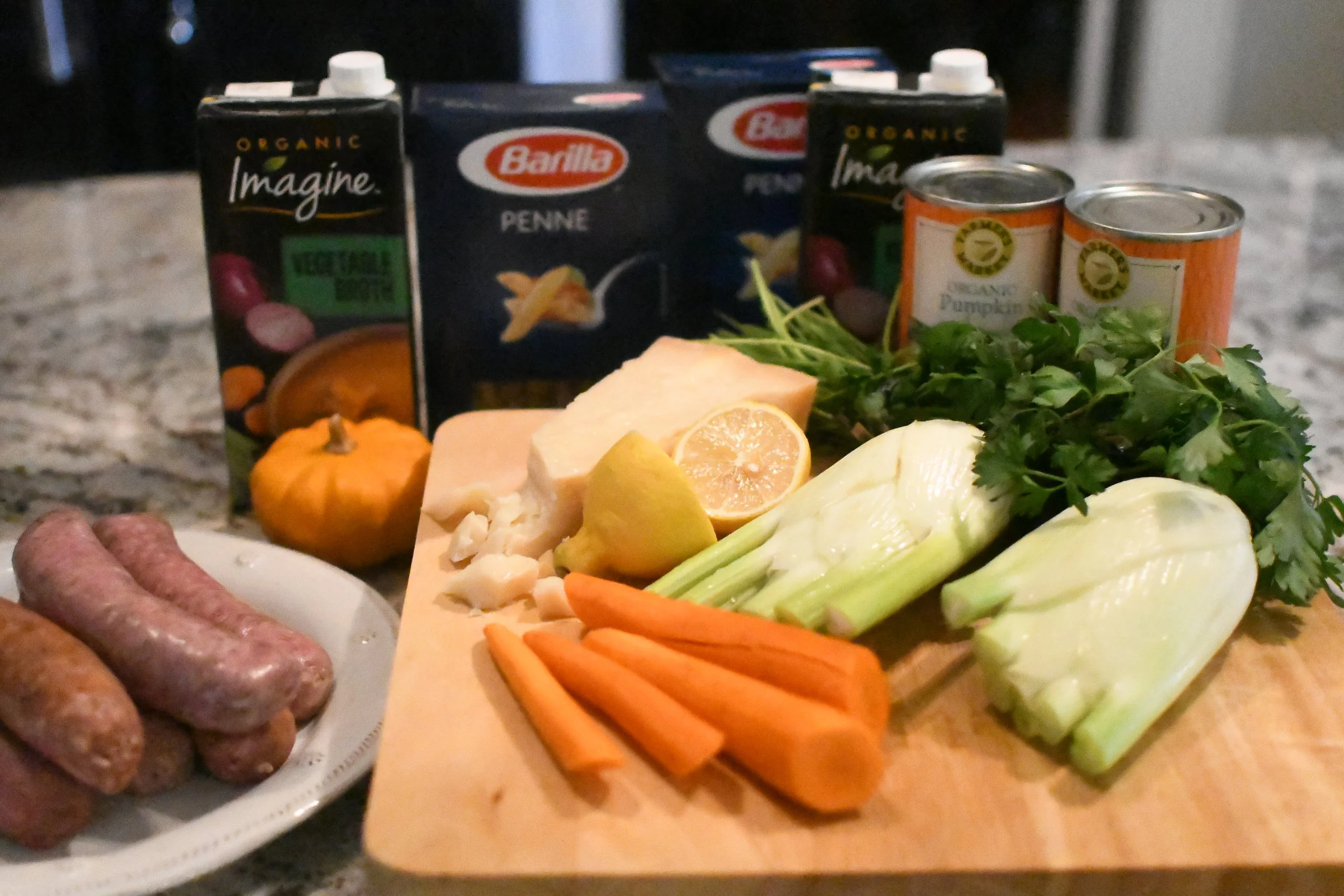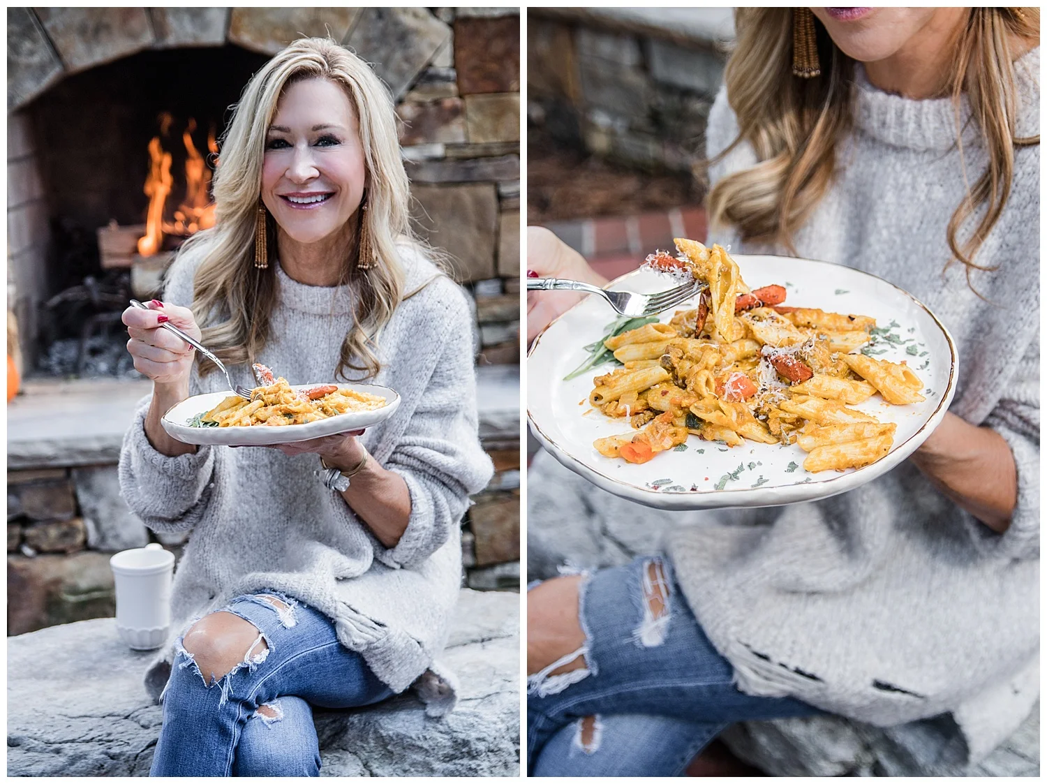 Thereβs no denying it, this fall I am on a pumpkin kick. I have loved everything pumpkin from candles to pumpkin bread to wellβ¦this amazing pumpkin pasta recipe. I had planned to make a stuffed butternut squash recipe (and Iβm still going to), but I changed my mind at the last minute on Sunday night and made this instead. I served it by the fire with a simple salad with a fig balsamic vinaigrette and it was so delicious! I promise this is the easiest recipe ever because you cook everything in the same pot and you use canned pumpkin. The pictures really donβt do it justiceβ¦it is creamy and delicious and the fennel gives it the most incredible flavor along with the sausage. I used andouille sausage, but you could use any kind you like. I made everything ahead and added the pasta at the last minute. I think this pasta is the quintessential fall comfort food recipeβ¦itβs everything you think of when you think of comfort food - creamy, rich, and it just melts in your mouth. I hope youβll make it and let me know what you think!