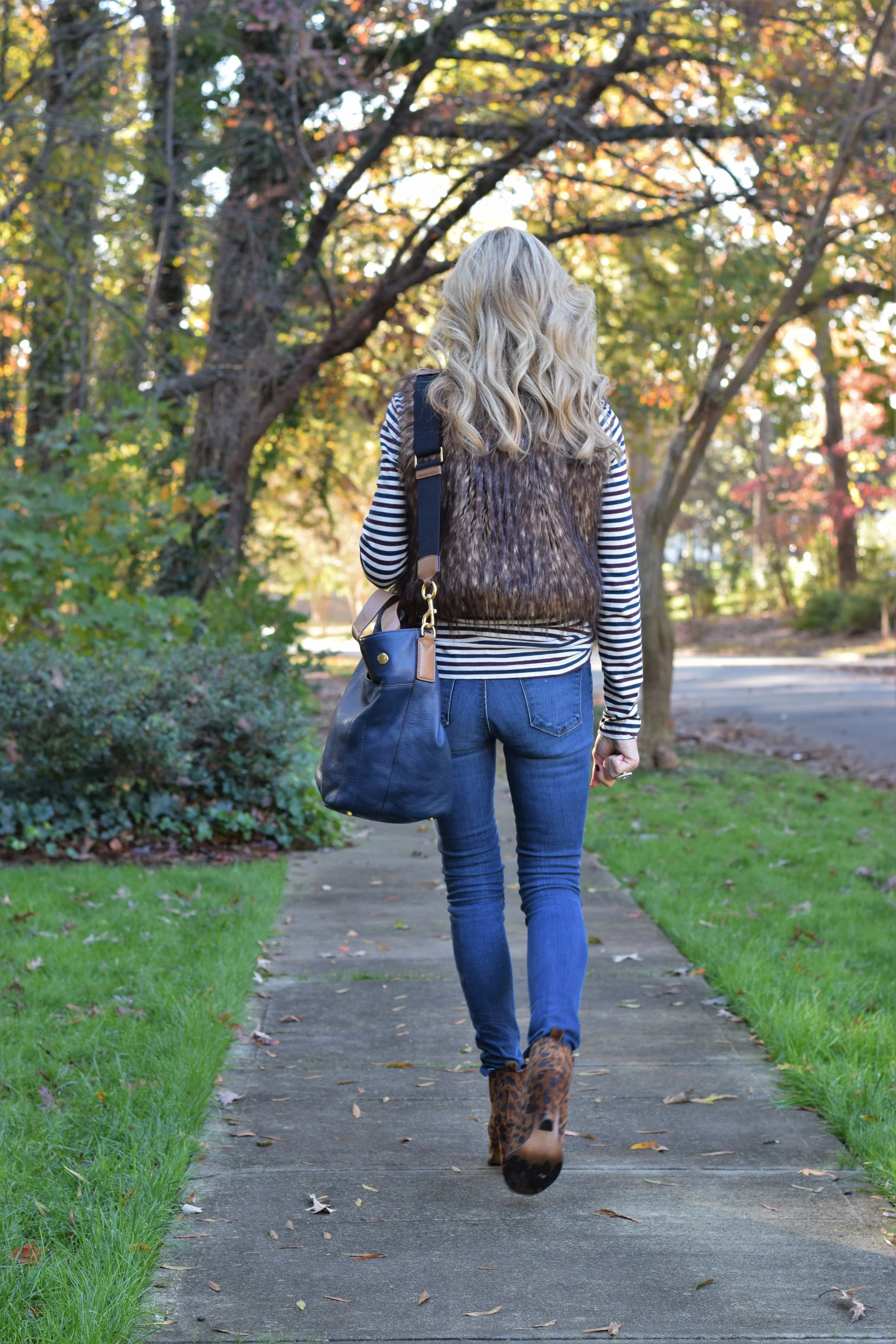 The second outfit is somewhat similar, only I wore a striped shirt from Stateside under the vest and very old J Brand jeans (I cut them off because I like them cropped), combined with a different pair of leopard booties from Zara and a Marc Jacobs bag. Everything but the striped tee is several years old so I was pretty pleased with this outfit.