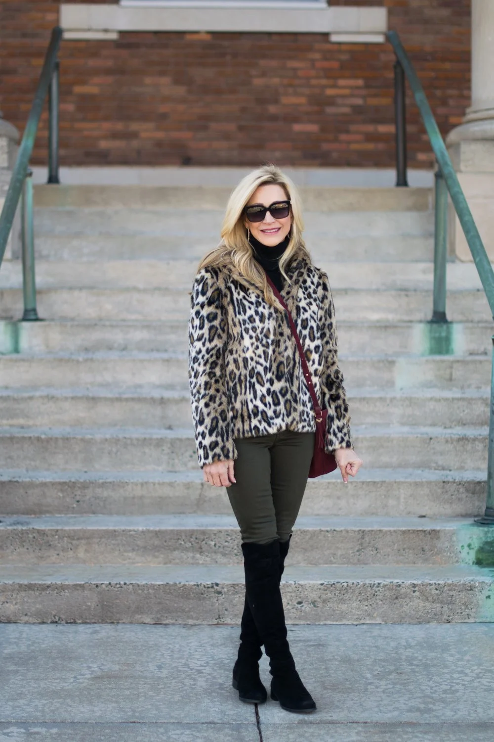 Iβve styled my leopard jacket styled here with olive green pants and Stuart Weitzman tall boots.