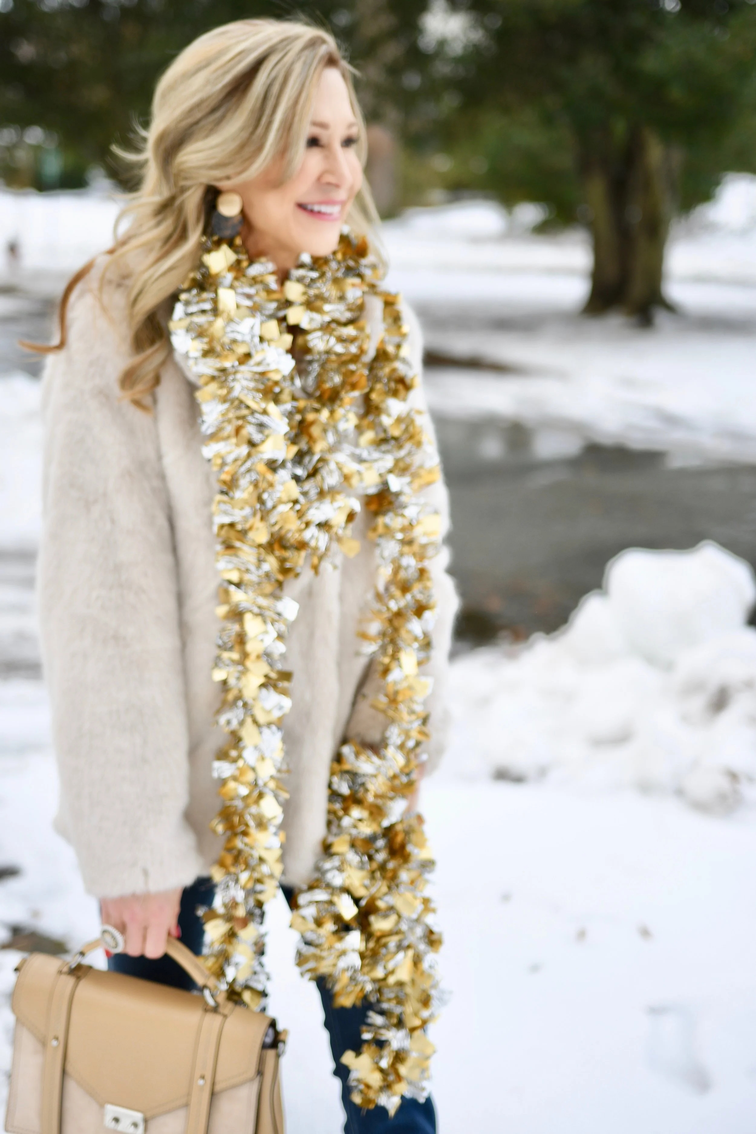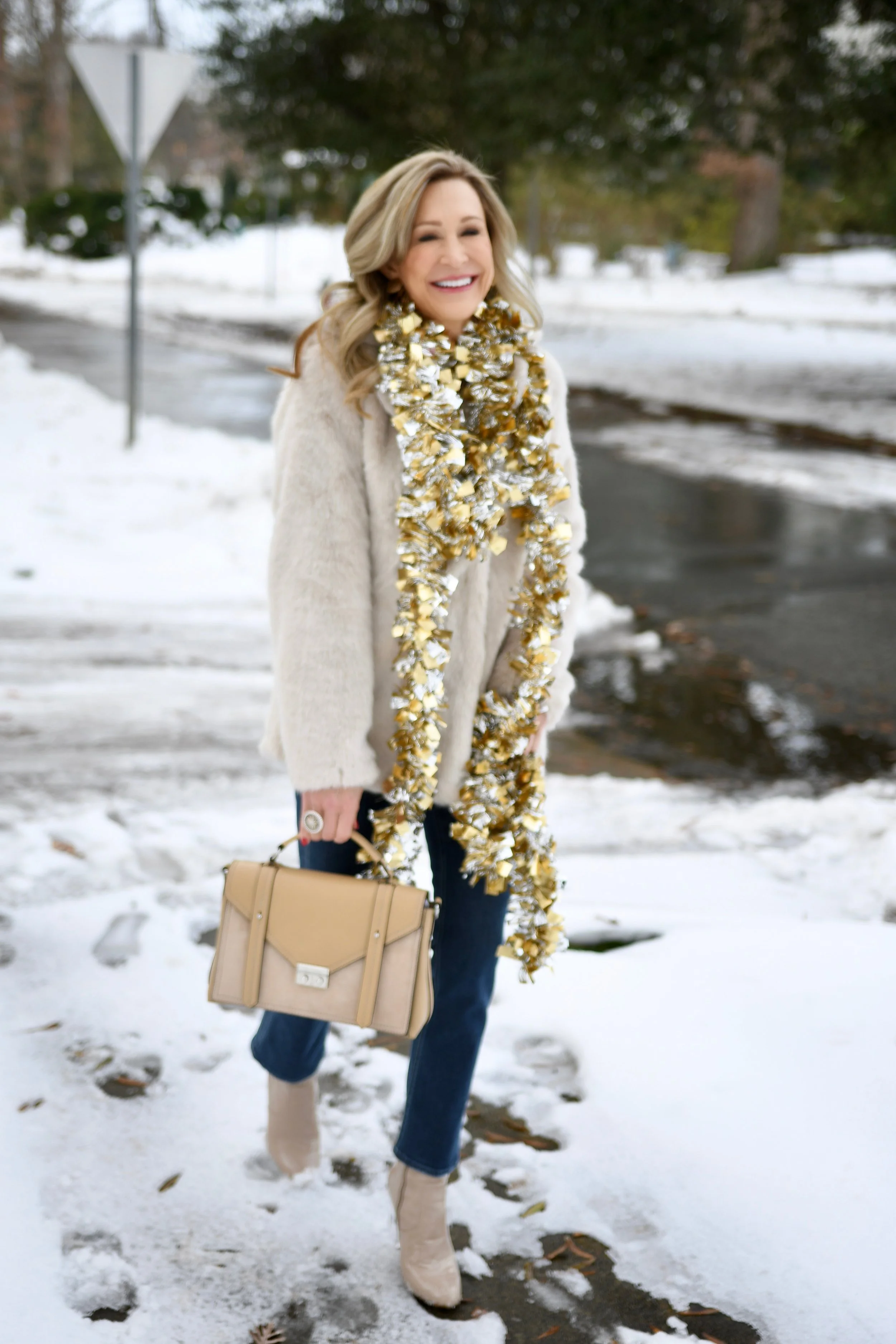 This faux fur coat from Target caught my eye a few weeks ago because of the color and style! Of course, it goes with everything and I love the oversized classic car coat style. My bag is from Henri Bendel (sadly theyβre closing at the end of the year), but you can still shop the website and this bag is 25% off! My jeans are McGuire Denim (my current favorite brand) and the boots are old Steve Madden. The scarf is from the Christmas section at Target and I used it to wrap packages when I took it off hahaβ¦I was feeling festive in the snow!