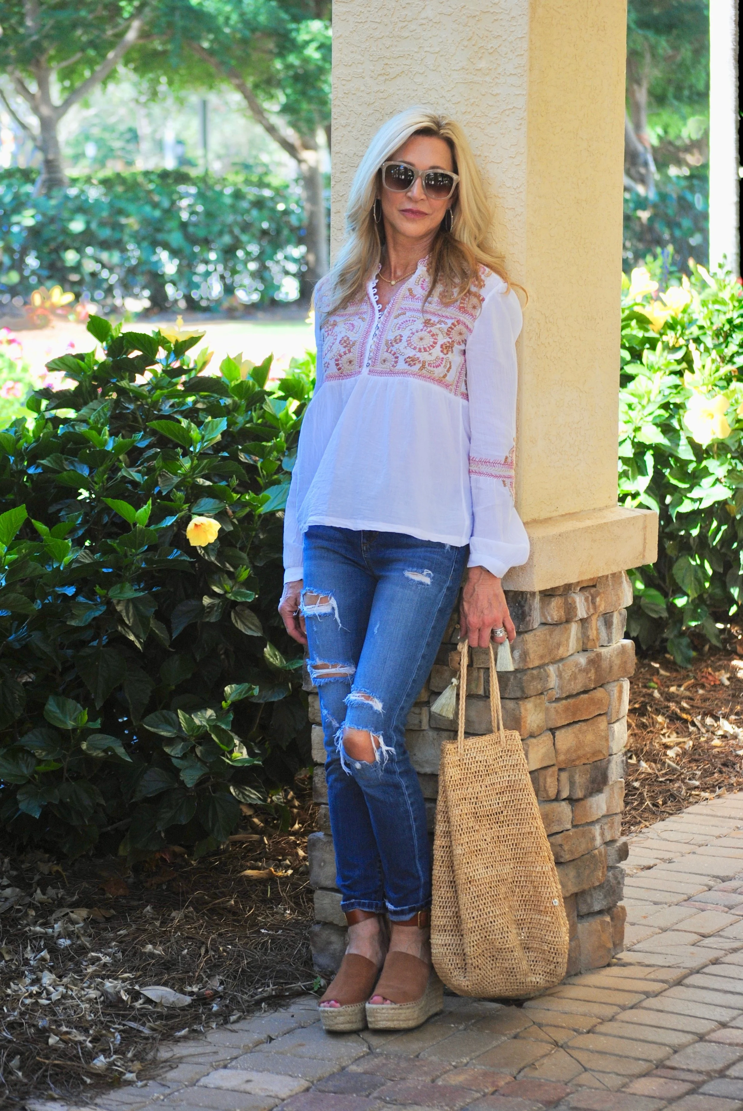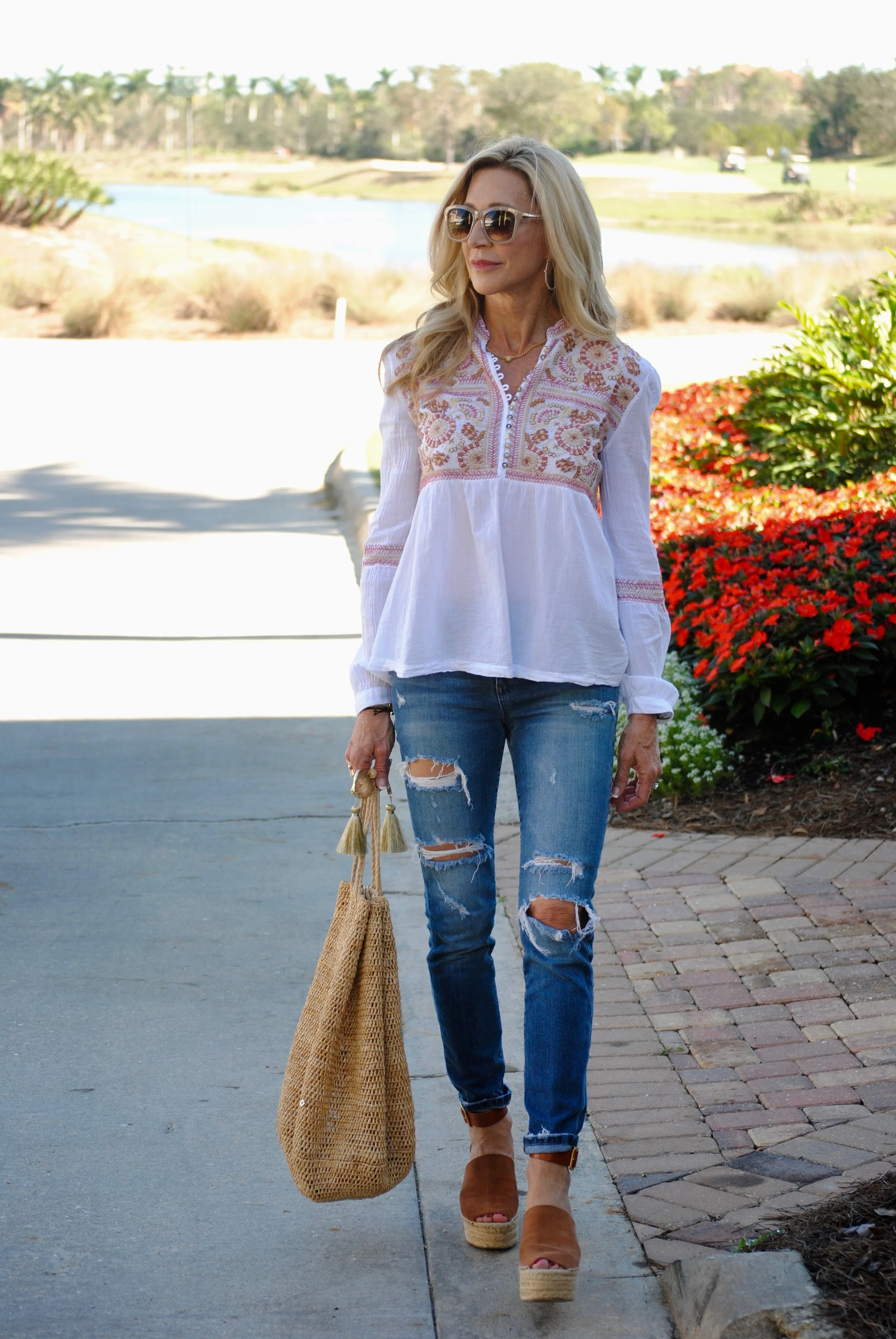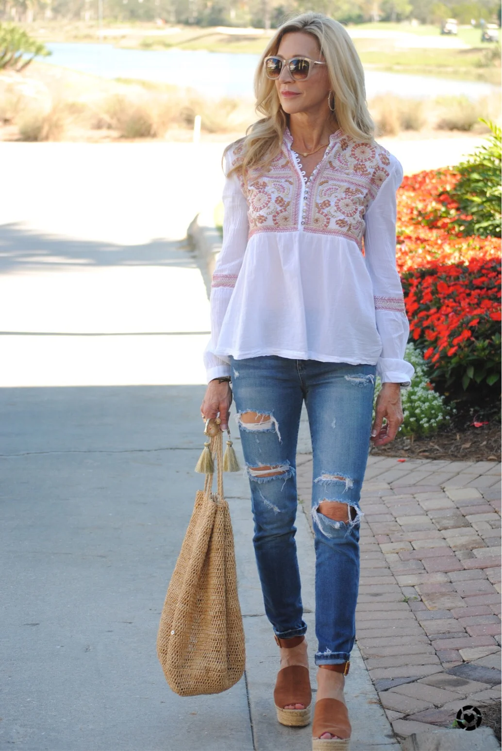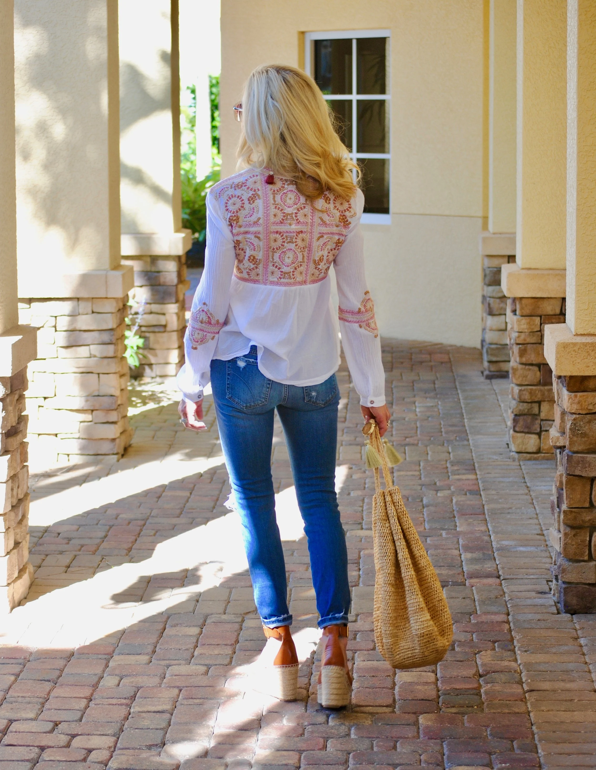 Johnny Was is one of my favorite brands for summer! They make a boho relaxed statement sooo beautifully! I paired this top with the same shoes and bag (similar here) from above, but added some very distressed jeans to make the top seem less sweet! This is a perfect outfit for early spring while the weather is still cool.