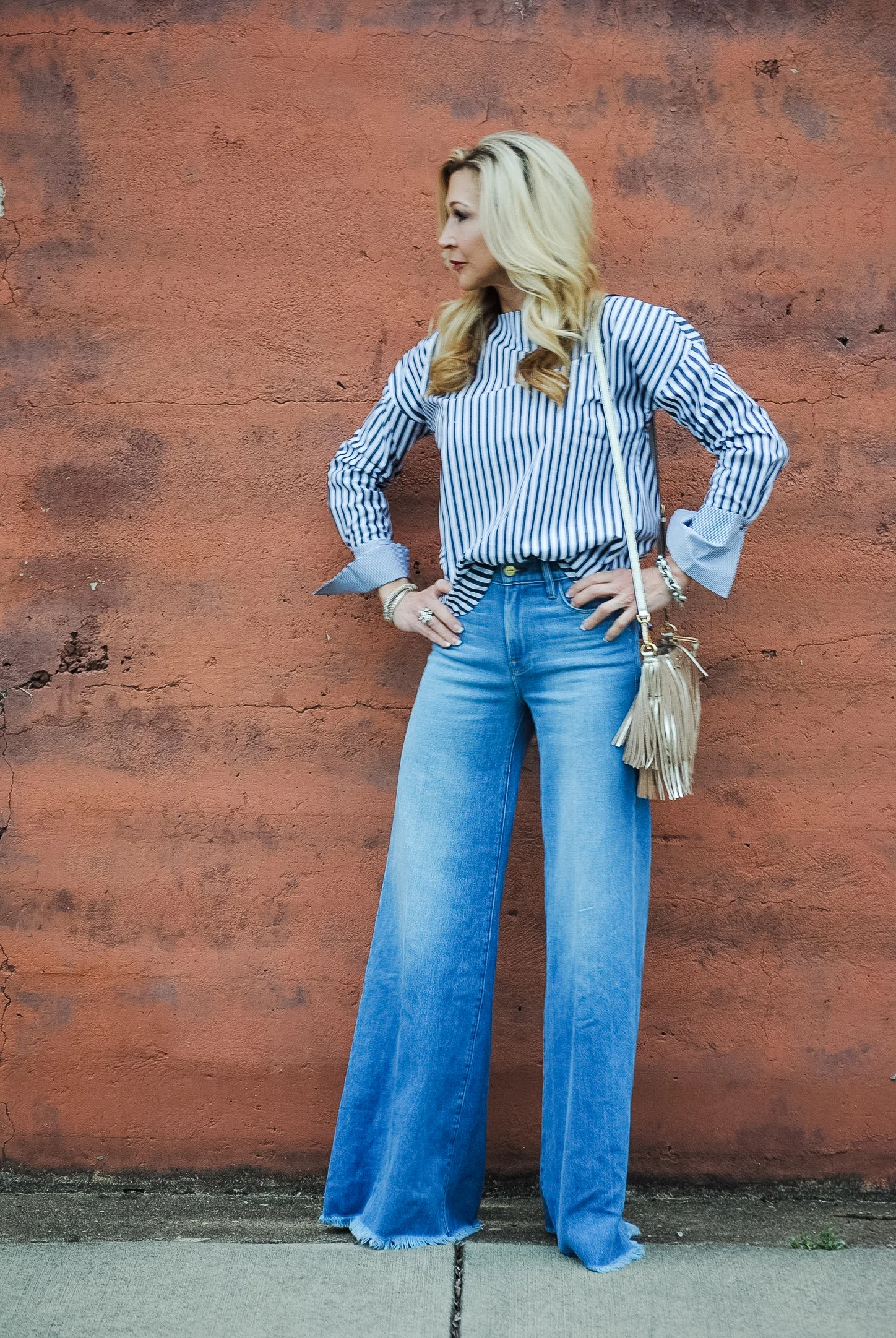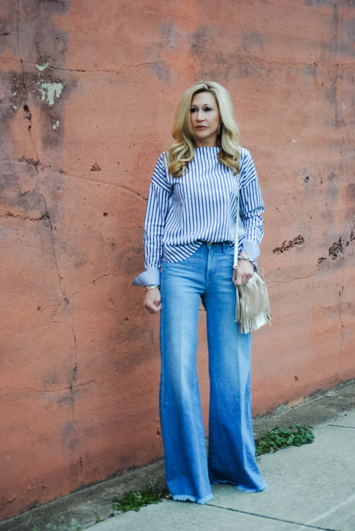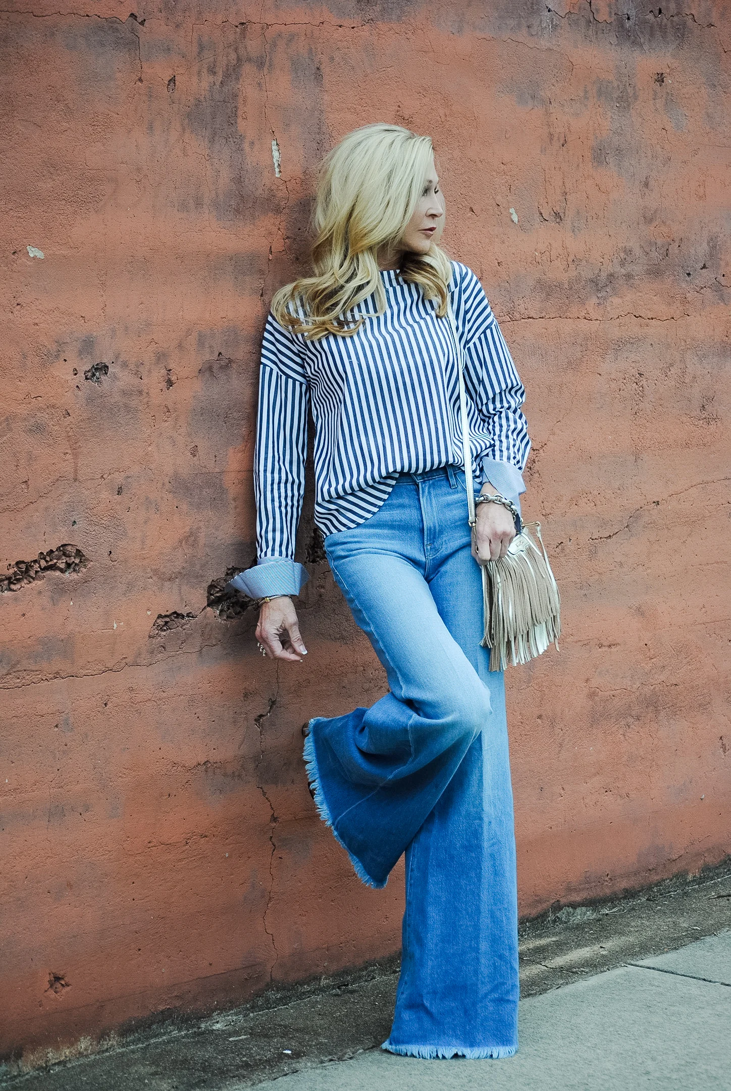 For anyone out there who is over the skinny jean trend that's been popular for so long, there is good news for spring...wide leg, or palazzo pants are trending and they are everywhere from magazines to street style blogs. I was somewhat skeptical of the trend, because I am not really over skinny jeans! Skinny jeans work well for my body type and I have so many pairs of them that my wardrobe would take a serious hit if I had to buy all new! I was curious, however, about how these pants would work with my short legs and short waisted torso, but I think I pulled it off.