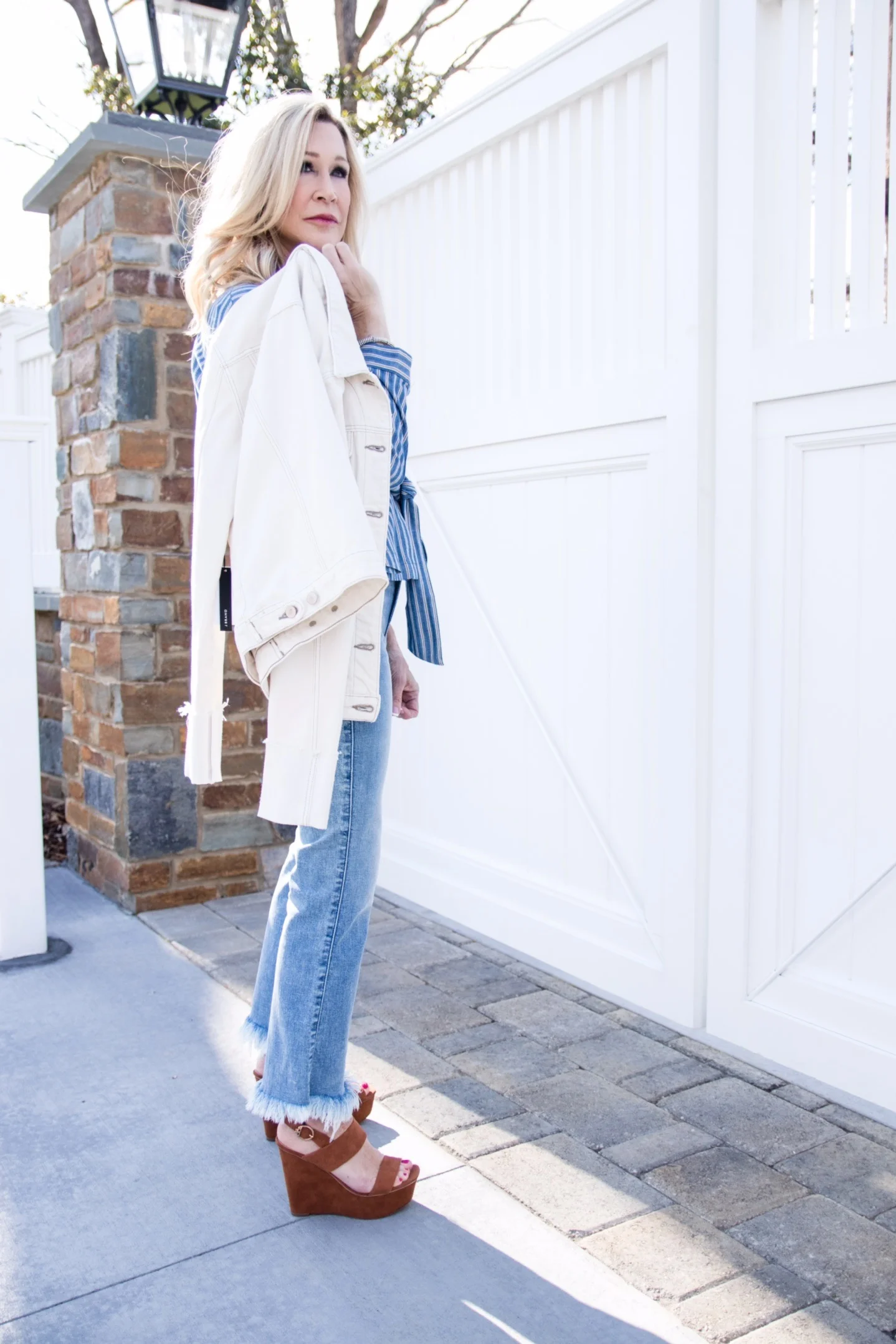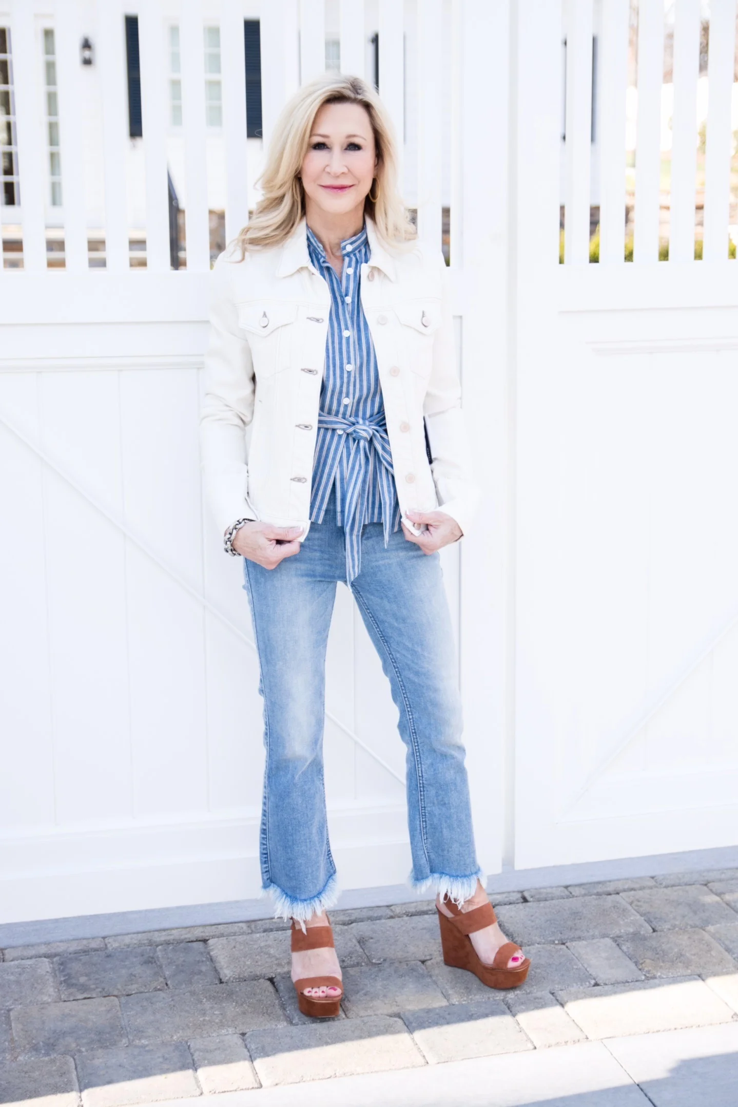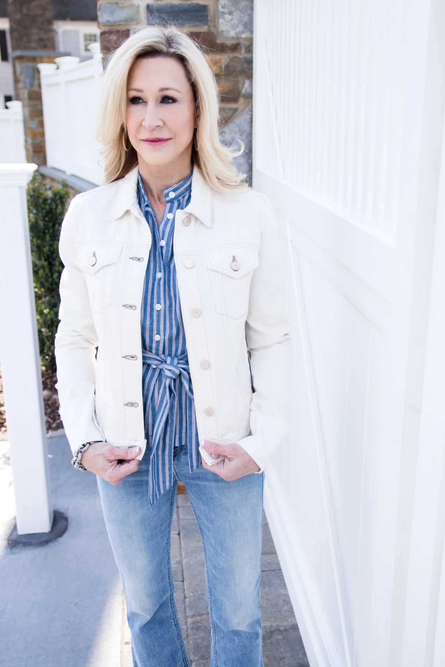 Denim jackets, as mentioned above can be the perfect accessory with dresses, wide leg pants, skirts and even denim on denim. I like to break the denim line with a shirt peeking out from under the bottom of the jacket or alternatively, as I've done here, a cream or white denim jacket.