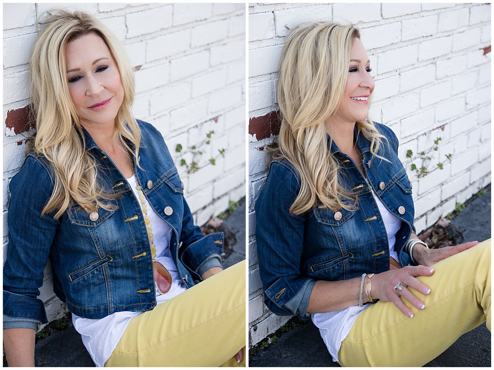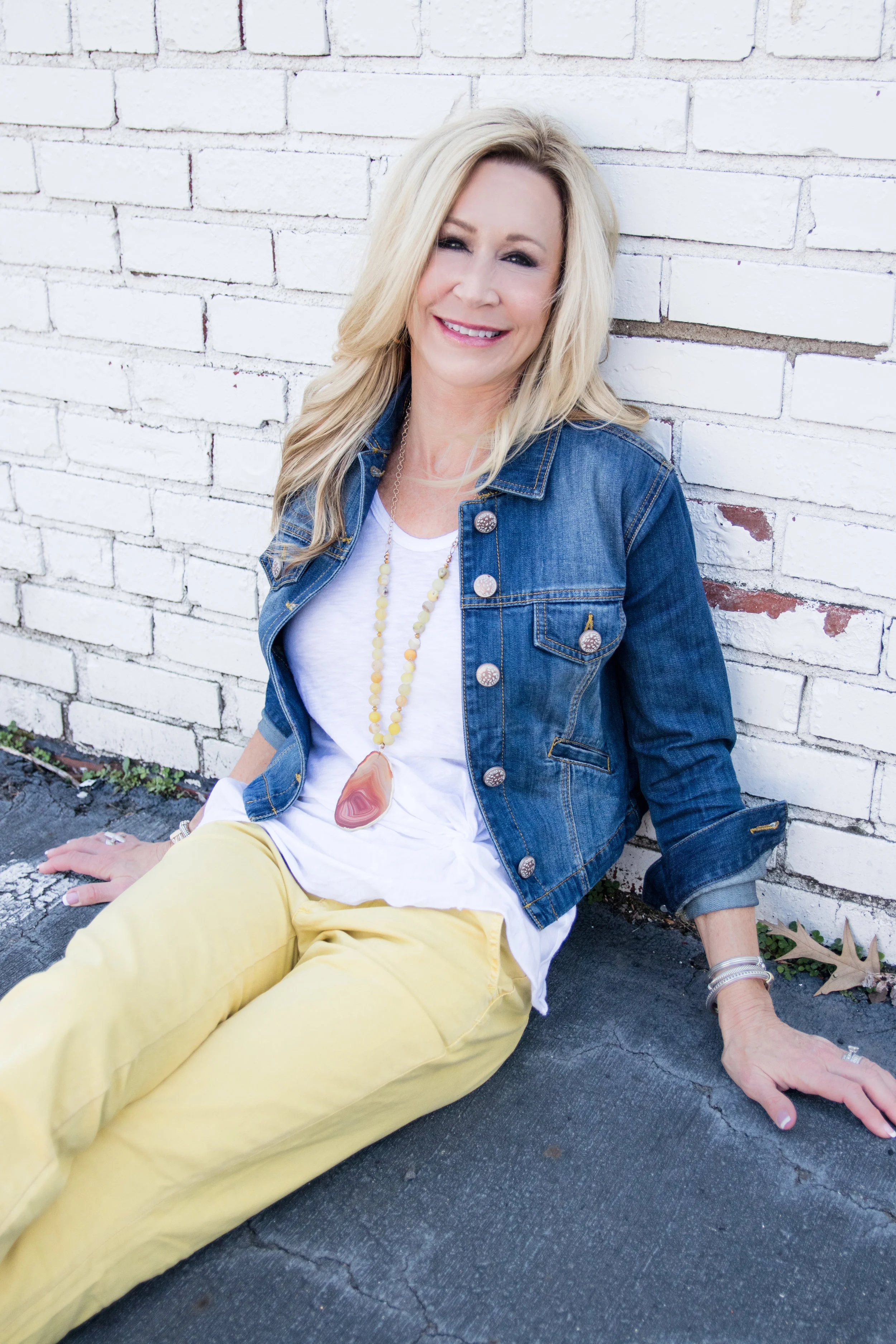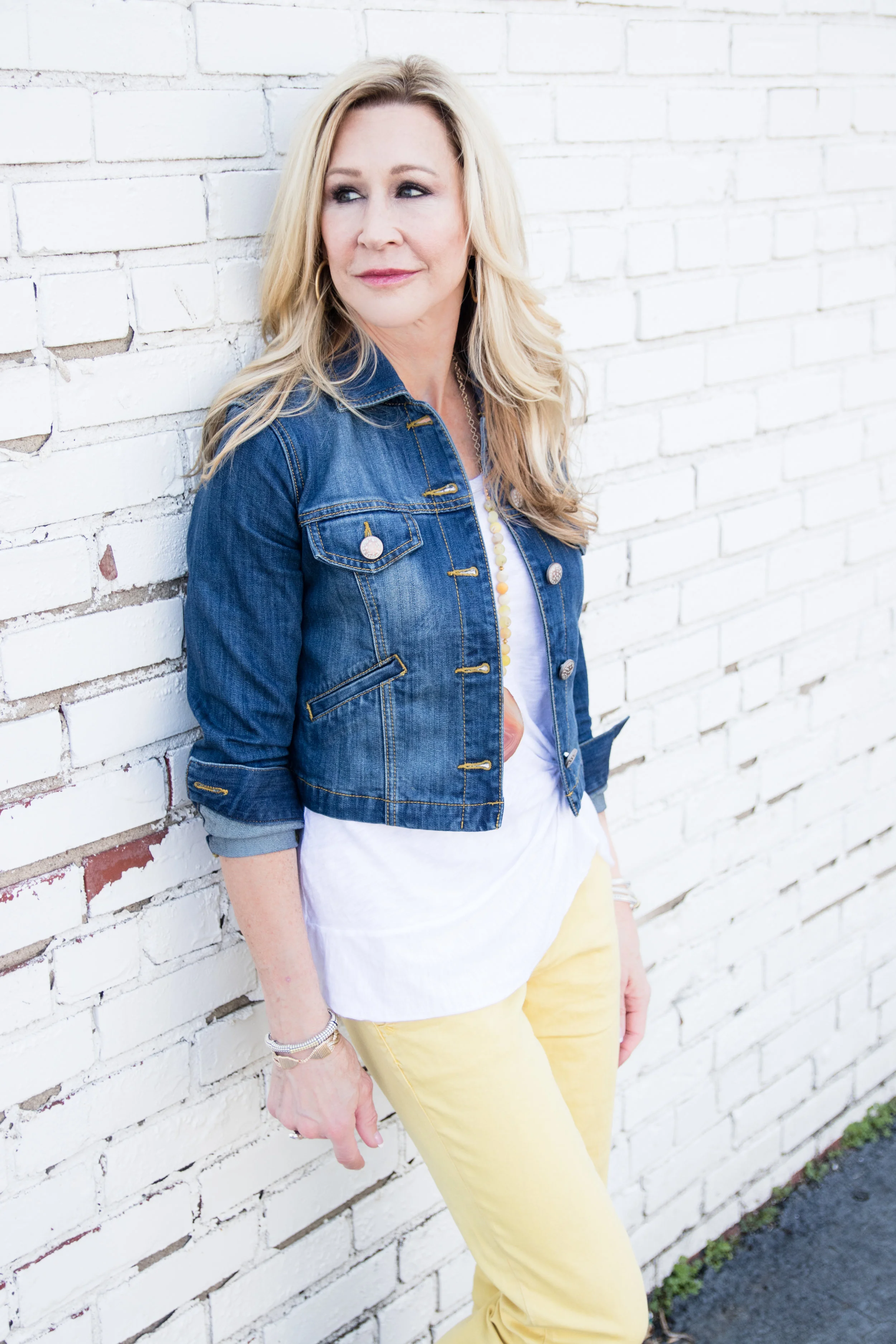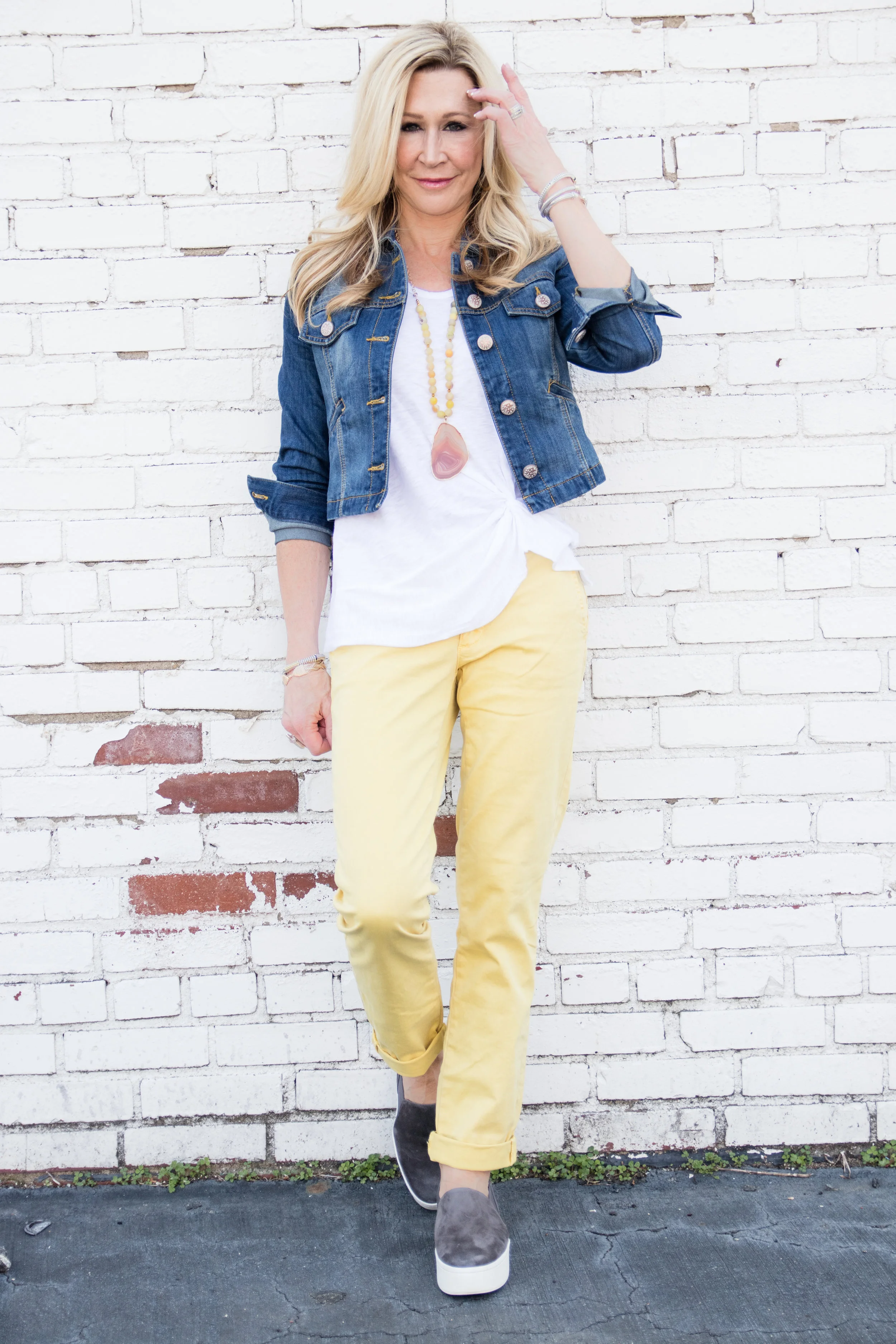 There are so many choices in jeans right now and I'm loving that colored jeans are making a comeback! More often than not on the weekend, I find myself in comfortable clothing because I'm running around shopping or going antiquing (like tomorrow) or buying plants...so many different things. The outfit that I'm wearing here is absolutely the best for doing all of those things. The yellow jeans from Anthropologie have a boyfriend cut so they are extra comfy, the shirt is sleeveless (on the off chance that we finally have a hot day), the denim jacket goes with everything and the sneaks from Vince are cute and I can wear them all day long! I love to throw on a necklace that ties an outfit together and makes me feel just a little more polished. This one from Ashley Westcott of Lush Designs just happened to be the perfect color; it even has a little grey in the beading to match the shoes!