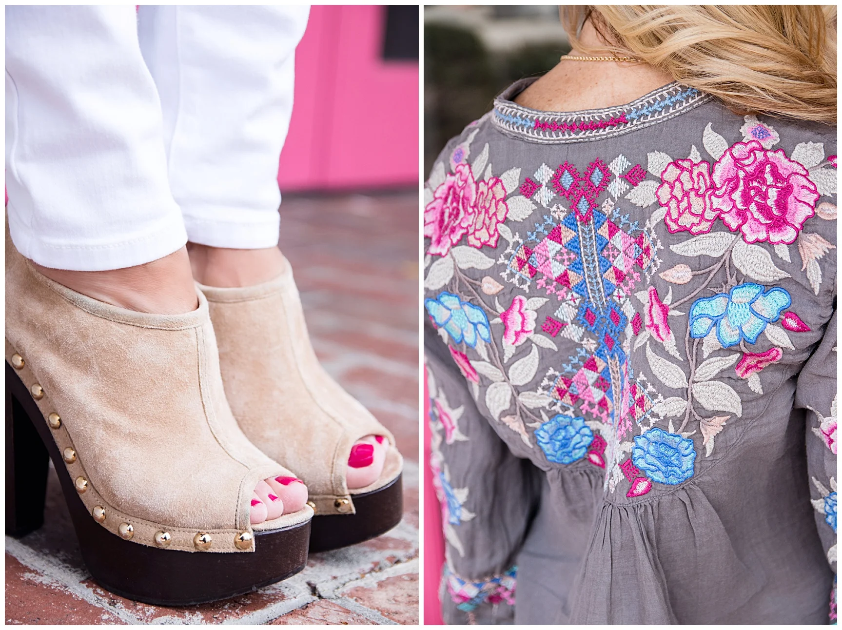 I paired this great top with white jeans, and my Jimmy Choo clogs. As with so many things in my closet, these clogs are around 10 years old. I loved them the minute I saw them and continue to love them every spring and summer. They are definitely not for a day of shopping and walking around, but they are comfortable and make a fun statement! I tried to find a similar pair, but couldn't, so I linked a few pairs that I like (at literally every price point).