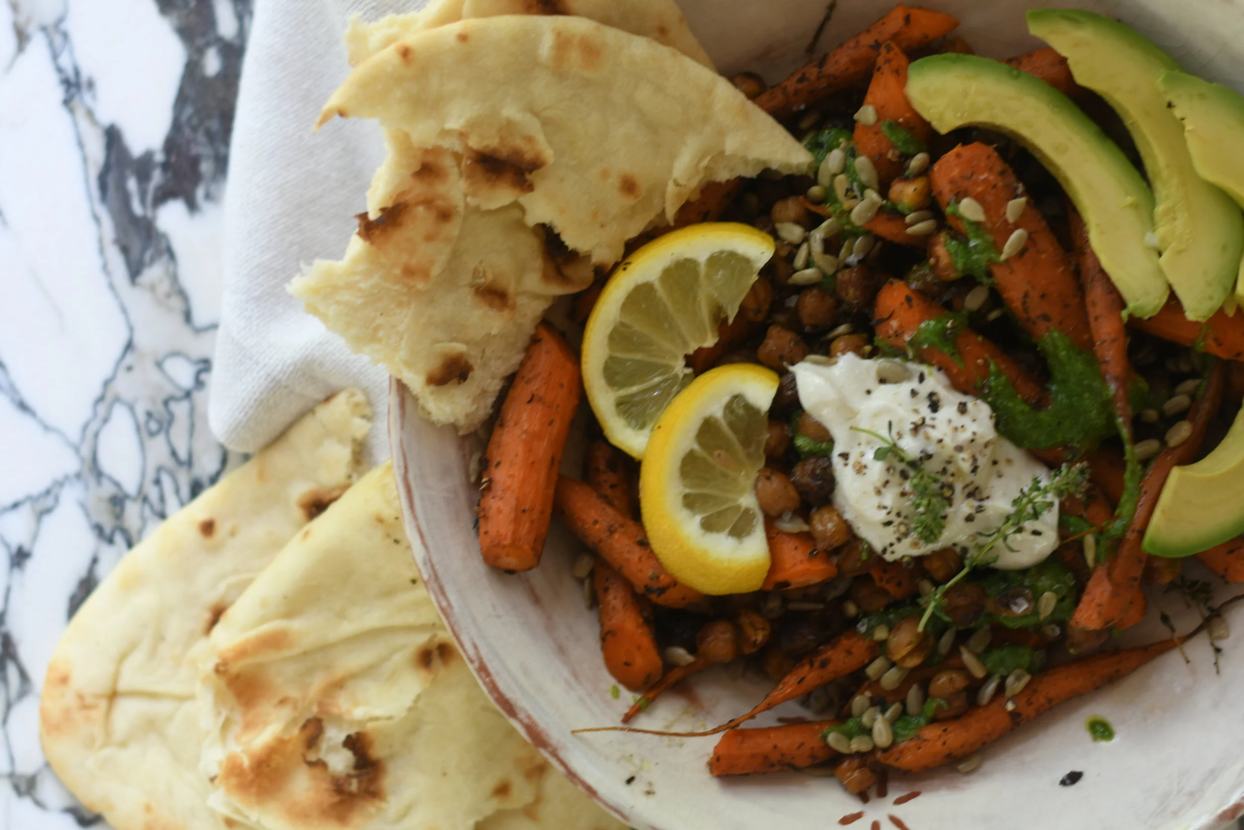 Bowls are very trendy right now and seem to be on every restaurant menu! and carrots are in season so why not make this Roasted Carrot and Chickpea Bowl with Avocado!  I love this recipe because everything you need is in one bowl and the flavors are perfect together!  It starts with roasted carrots and chickpeas and everything is topped with the most delicious pesto made with the carrot tops. Serve all with sliced avocado, a yogurt honey sauce, and warm naan bread.  This recipe may sound a little complicated but I promise it's not.  Also…you’ll have leftover pesto to use in other recipes or serve over warm pasta. If you’re short on time, you could substitute store bought pesto but it won’t be quite the same or quite as healthy!  Eat this as a vegetarian meal, or throw some chicken or salmon on the grill to go with it.  It's the perfect healthy combination and it's very delicious! It’s also what we’re having for dinner tonight…I’m adding grilled salmon!