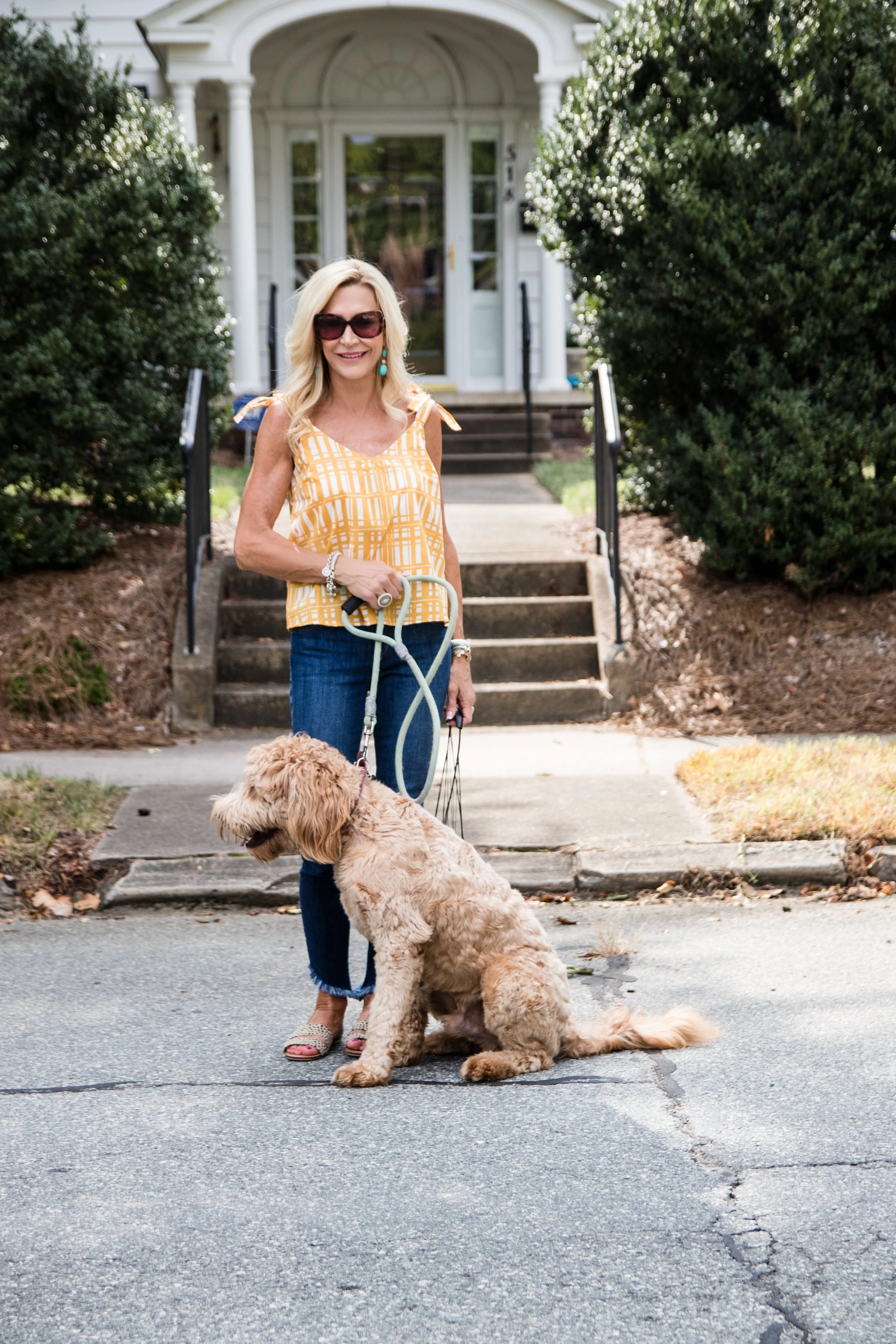 Everyone (including me) is talking about fall fashion, but it's still sooo hot and humid! This adorable yellow and very affordable top from Target is great for beating the heat! I paired it with the absolute cutest leopard sandals, (love these too) also from Target, Joe's cropped skinny jeans with a raw hem and a great bucket bag. John Wayne really didn't care what I had on, he just wanted to jump in the fountain and play with the fish!