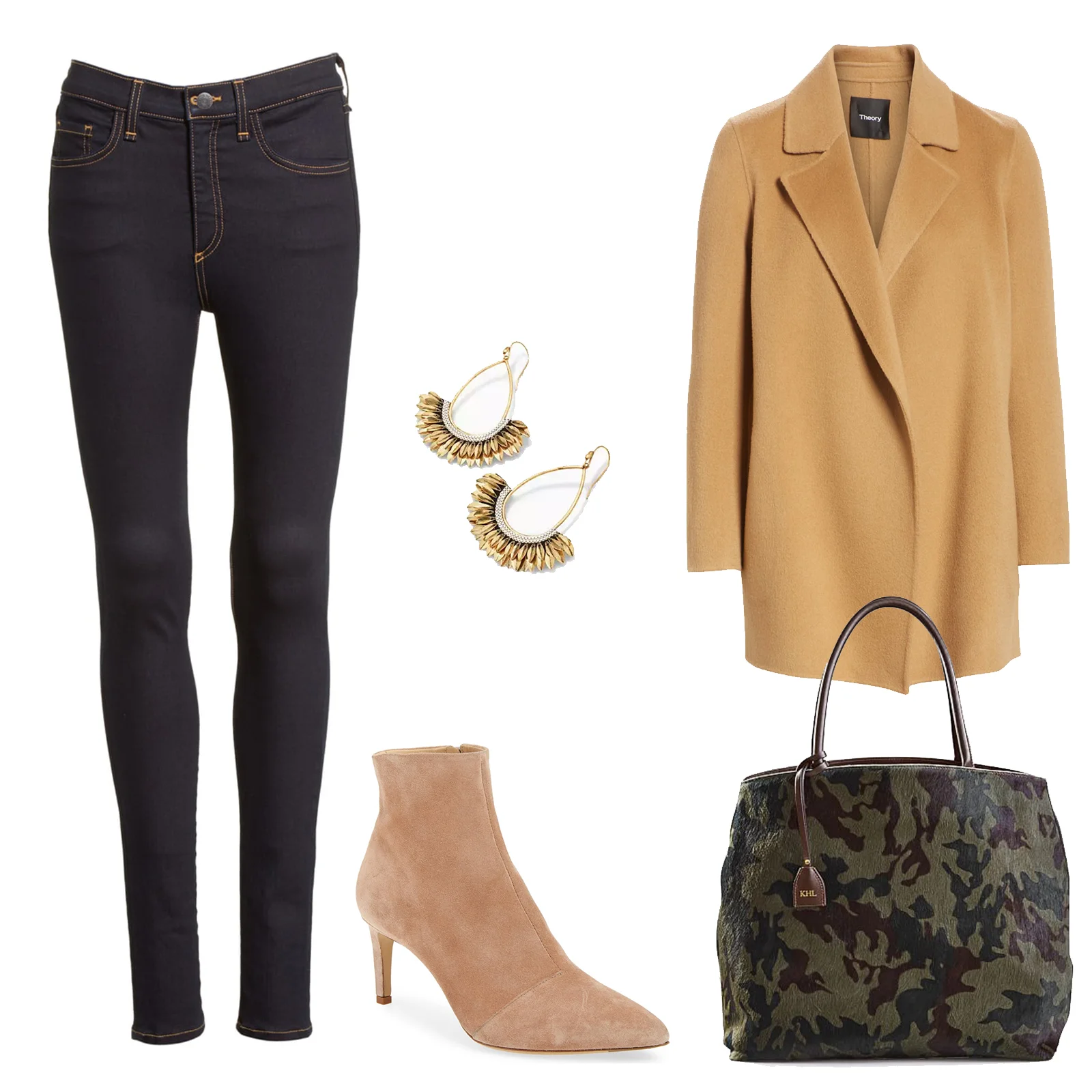 Camo is huge for fall and this cute bag from Mark & Graham is is an easy way to sneak a little into your wardrobe. Pair it with beautiful wardrobe essentials that you'll keep forever! Theory Cashmere and Wool Coat, Dakota Hide Tote by Mark & Graham, Veronica Beard Skinny Jeans, Rag & Bone Pointy Toe Bootie, Stella & Dot Statement Earrings