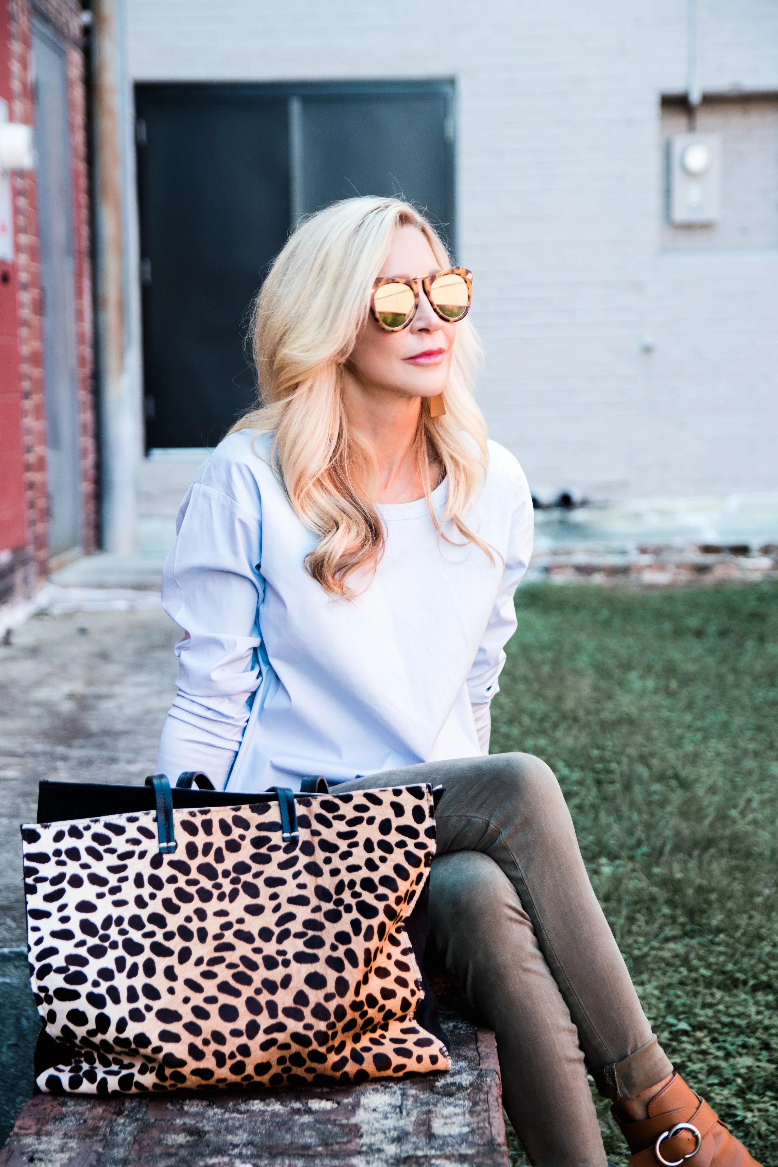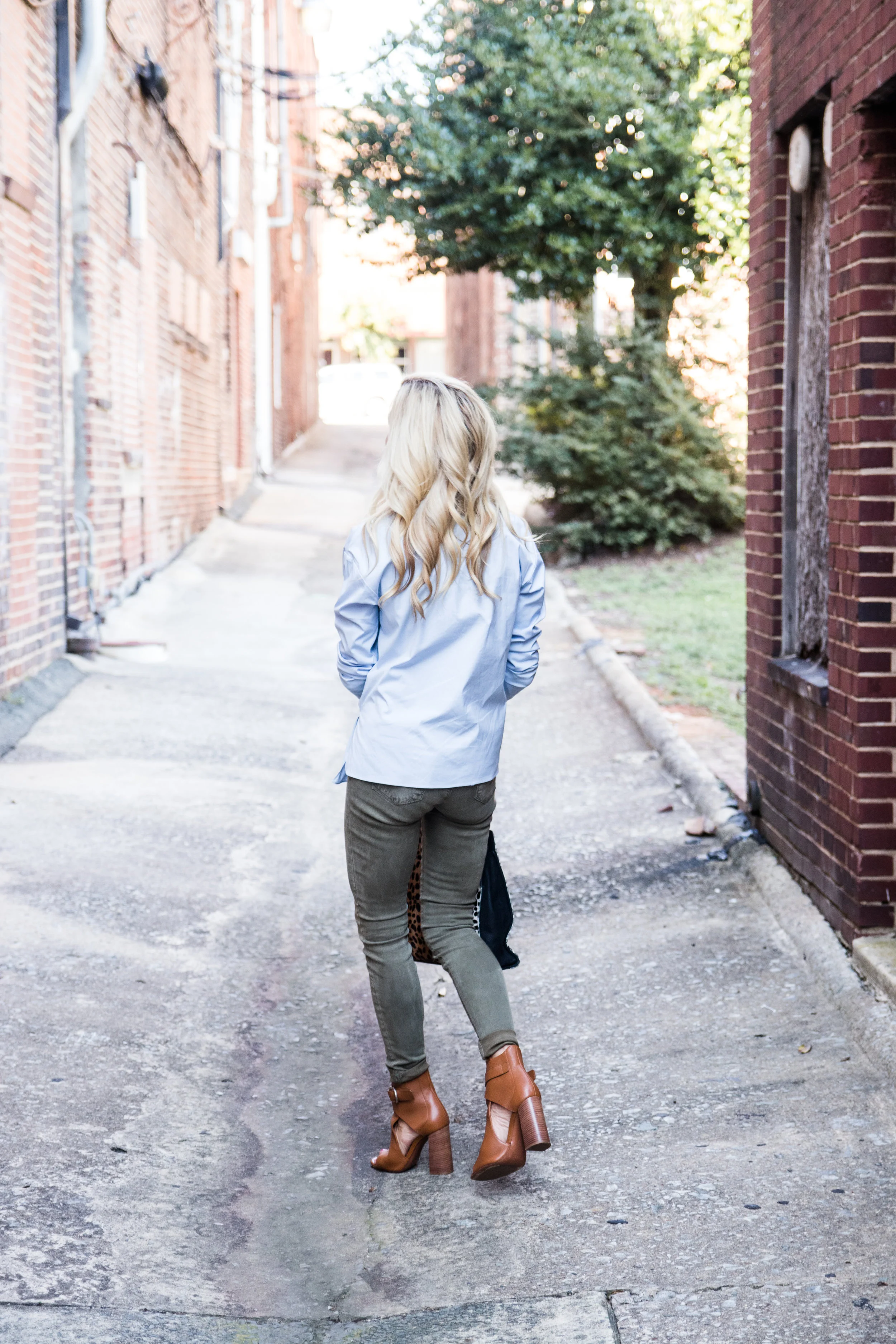 We're still in the throws of a brutally hot summer, and I'm absolutely thrilled about the season to come—of hopefully chilly breezes, dropping temperatures, and changing leaves. It's time to start thinking about closet updates and transitioning into fall. I'm still loving the olive green and light blue color combination and here I've paired J Brand jeans and a blouse from Theory with open toe booties from Chloe (also love these) and a leopard bag (keep scrolling for one of my favorites). I'm linking some of my favorite pieces in this color combination below...happy shopping!