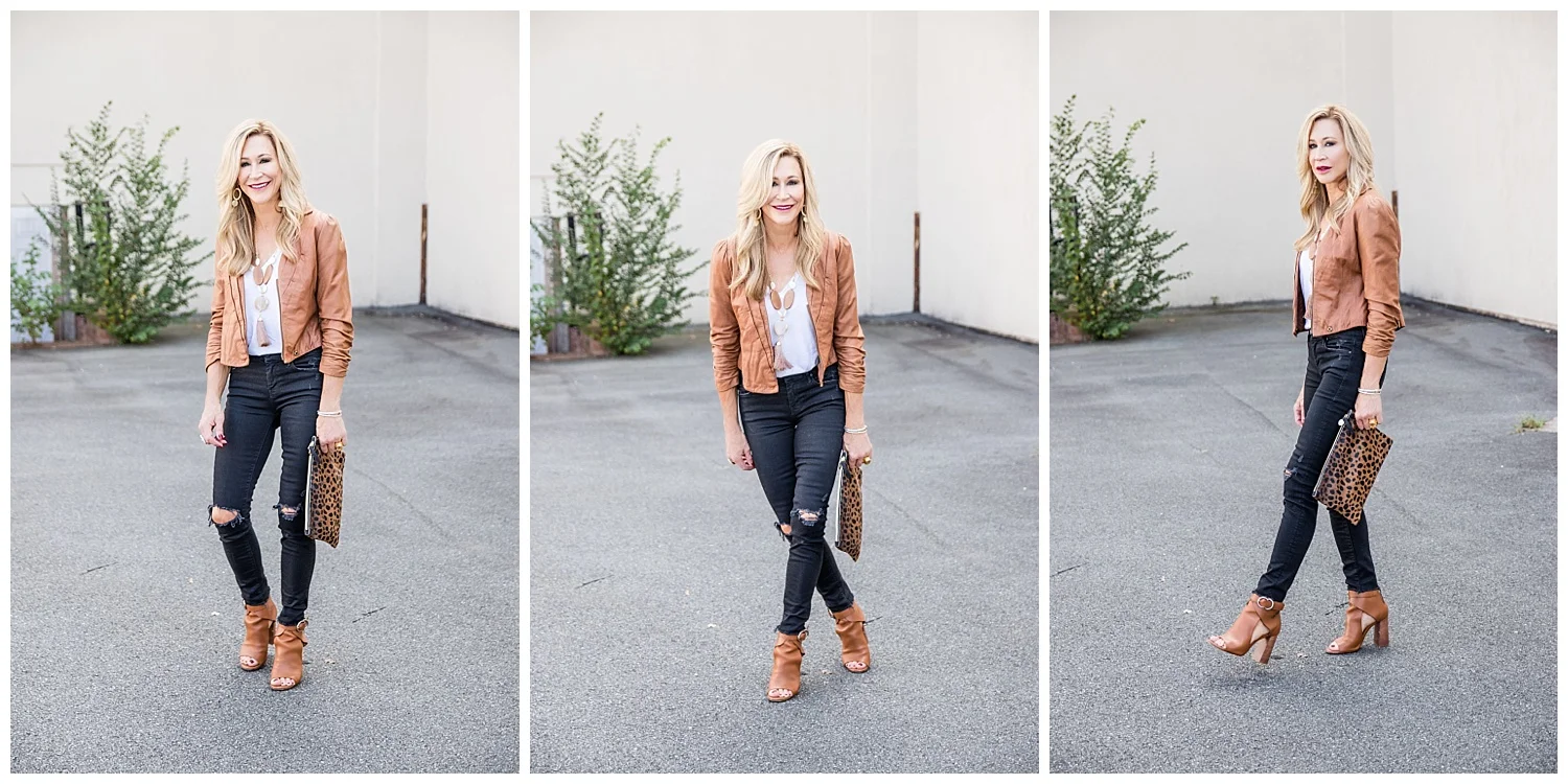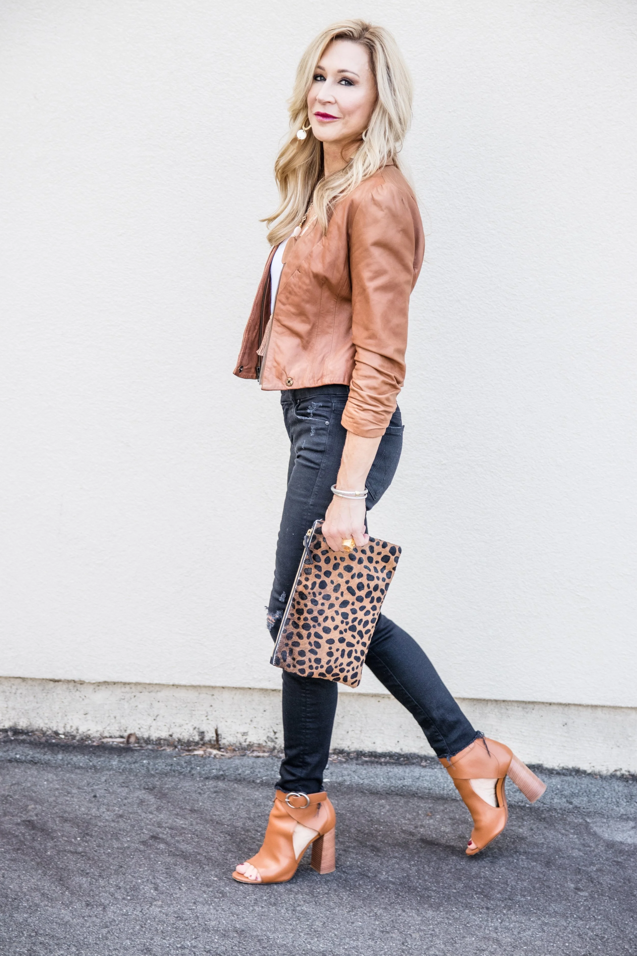 Happy Saturday! It is finally feeling a little more like fall around here (not much, but Iβll take what I can get) and Iβm pulling out some of my favorite pieces to put into rotation. Iβm wearing a jacket that Iβve had for sooo many years and still love. Itβs actually a piece that I bought for spring, but works for spring and fall. As usual, I paired it with dark wash skinny jeans and a white tee. My earrings and necklace are by Lush Jewelry and Iβve added a pair of open toe booties from last season with a leopard clutch for pattern. This is basically my uniform, but I think the jacket makes it special. Iβve linked similar pieces below so keep scrolling!