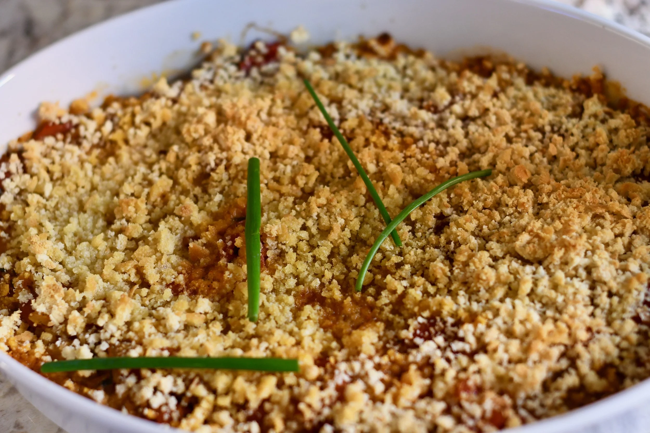 Tomato pudding is an old Southern recipe and this casserole is an updated version. The acidity of the tomatoes worked well with beside the chicken.