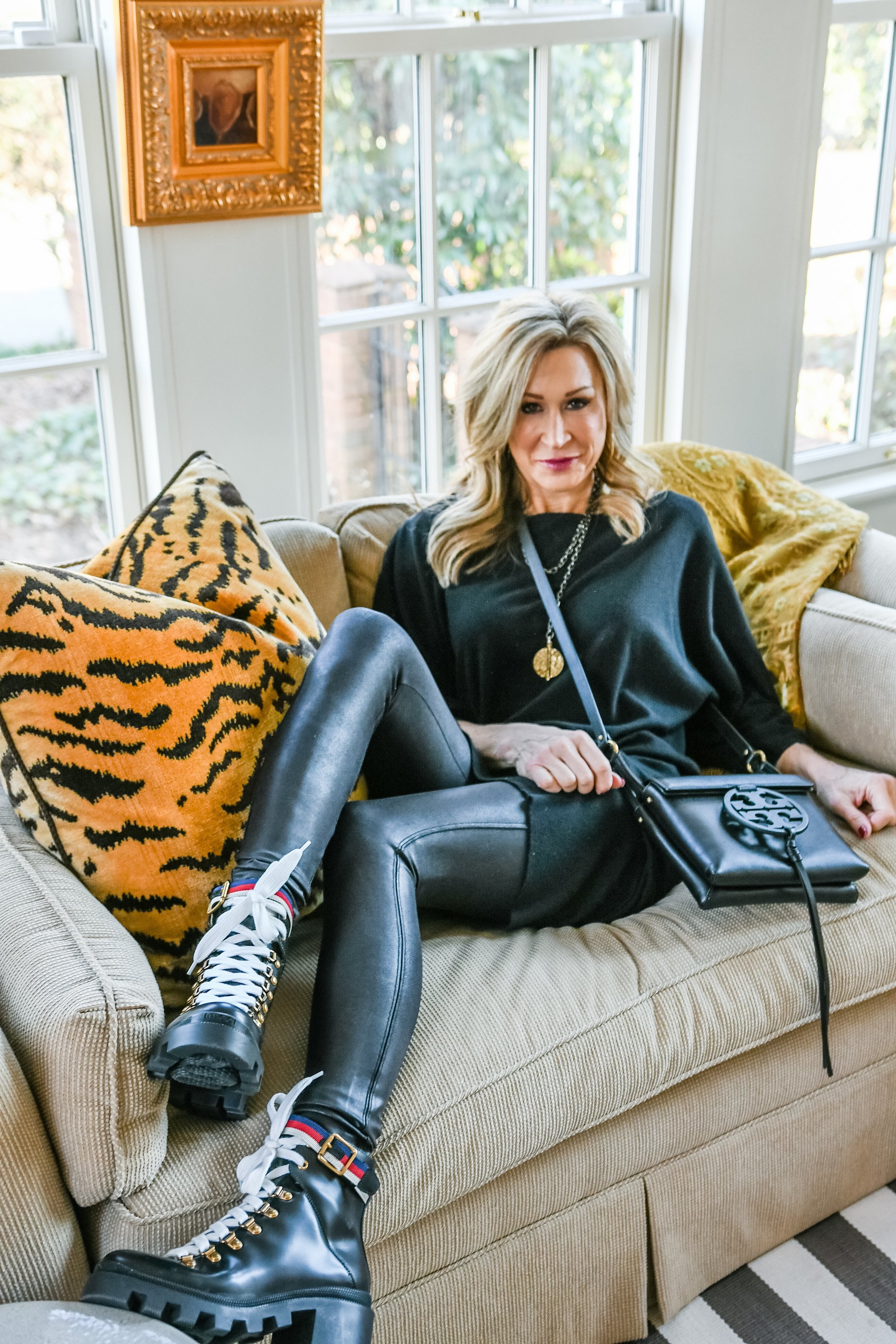 It seems that sock sneakers and sock boots are being replaced by combat boots this season, although I will certainly still be wearing my sock boots. When I was in New York over Christmas, I saw so many different styles in black leather with chunky soles and fabulous details. It seems that every designer has their unique version. Iβve always been drawn to combat boots and in the 90βs had Doc Martens as well as some cute ones from Gap that I wore often. Iβm loving the heel and the ribbon detail on the ones Iβm wearing here and Iβm thinking of getting a pair of black shoe laces to make them a little more wearable with different outfits. Combat boots are going to be a wardrobe staple for me because they're versatile and the styling options are endless. Iβm coming up with new ideas for ways to wear them every day. They were first pictured here with a plaid dress! I styled them this time with a knit dress that Iβve had for years and of course, my Spanx faux leather leggings. These leggings might just be my most worn item from the past several weeks!