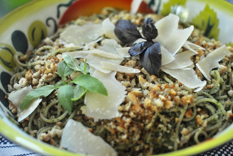 Spaghetti with Pecan Pesto & Garlicky Breadcrumbs
