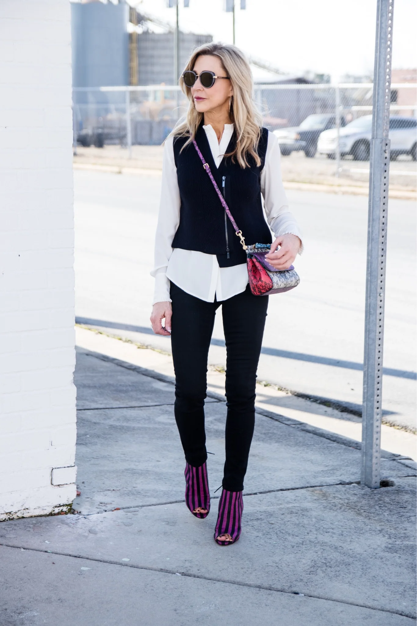 Layer a Sleeveless Sweater Vest Over a Blouse and Wear Some Funky Shoes