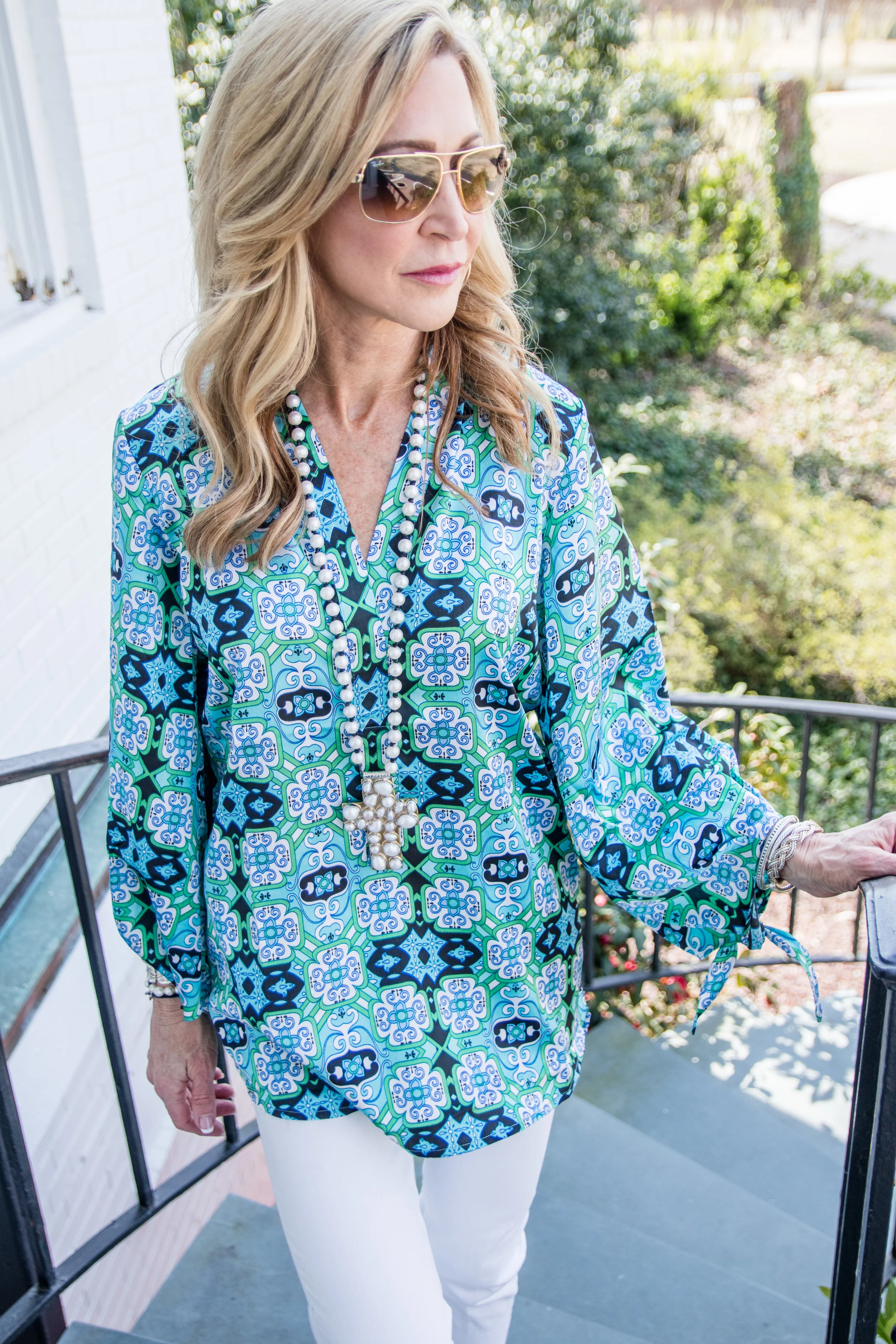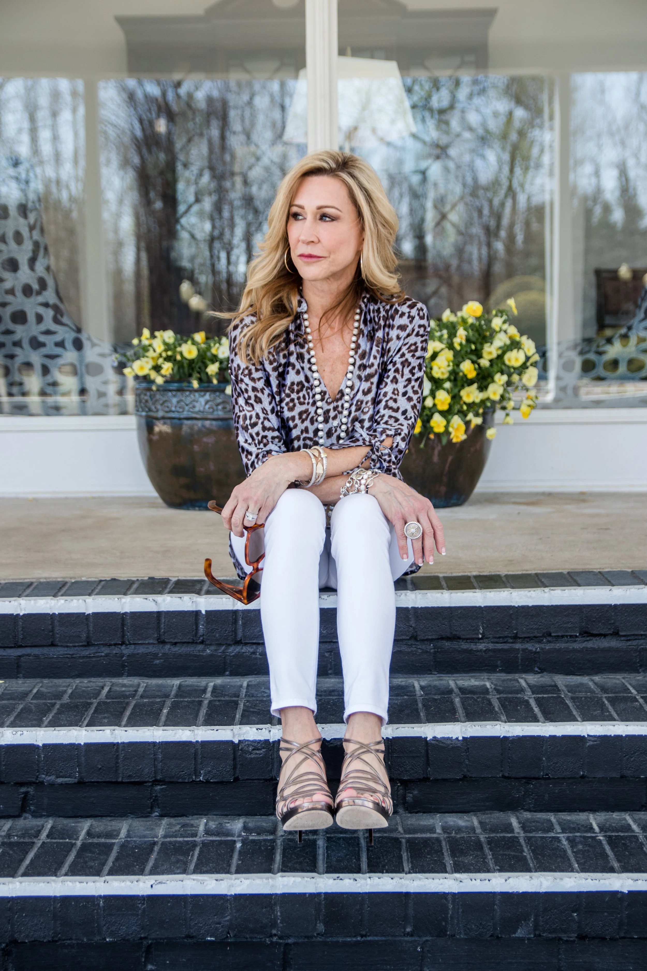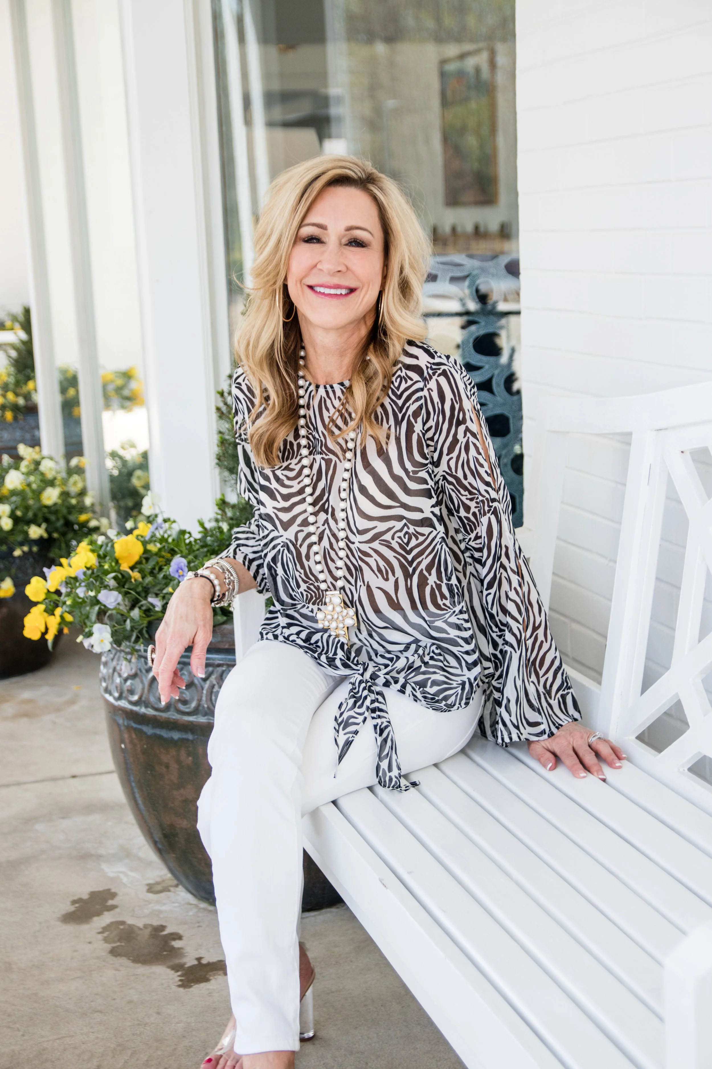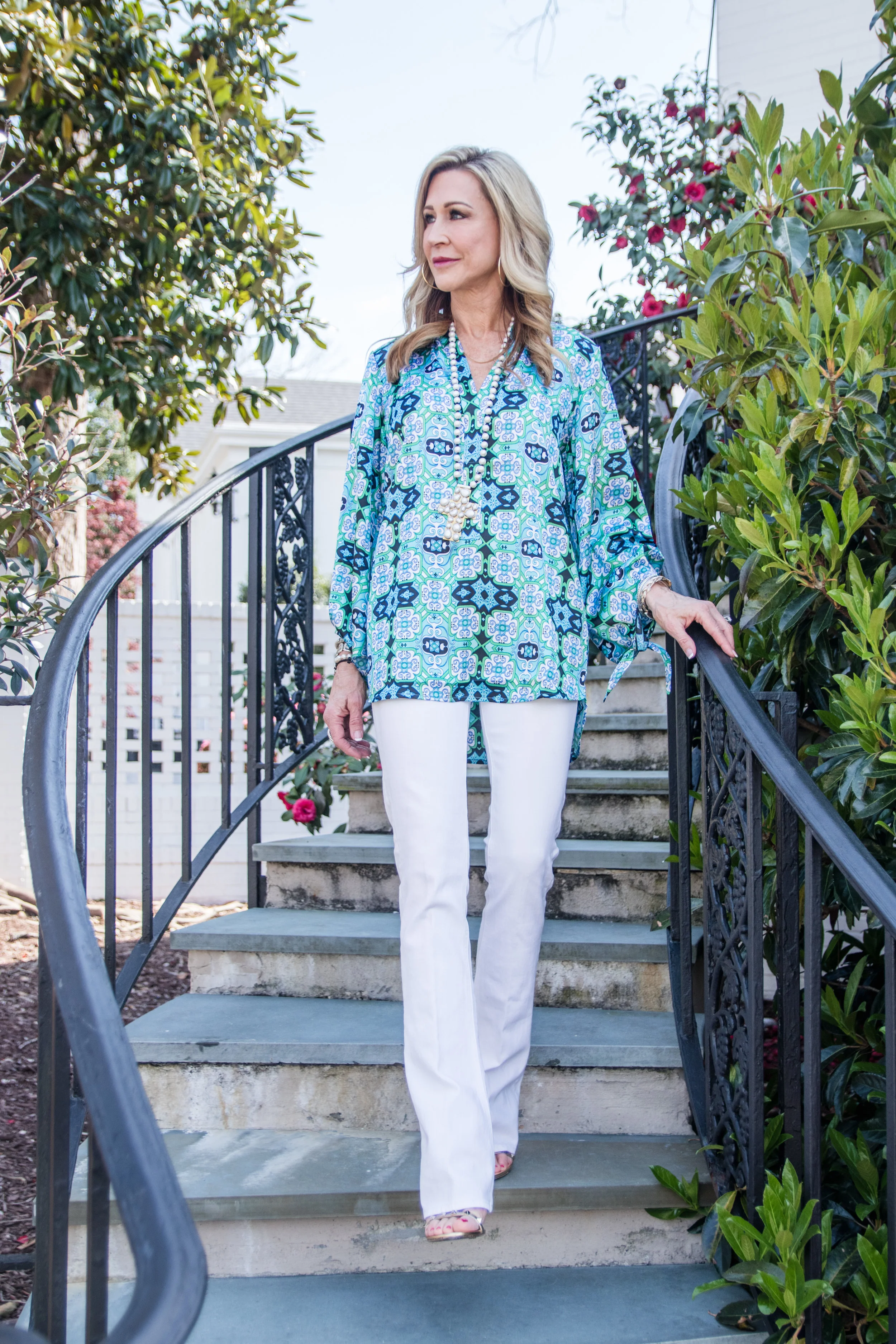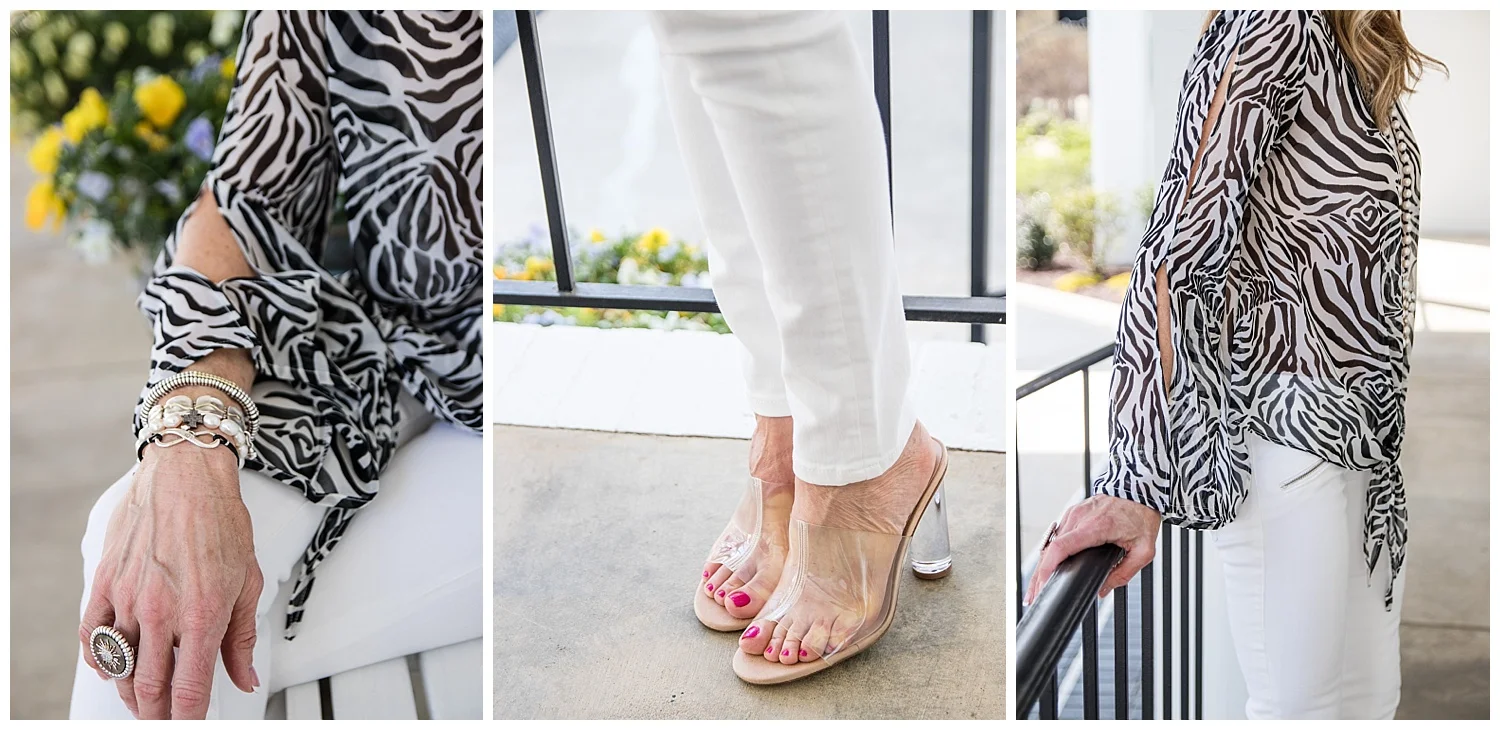 I styled this top with white flare jeans and Gold Valentino Rockstud sandals, but I will also wear this beautiful top as a bathing suit coverup! White jeans added a crispness to the outfits that I love for spring and summer, but there are so many ways to wear these designs and so many more options on the Julie Miles Resort website. I also think any of the shoes below would be fabulous with any of these tops.
