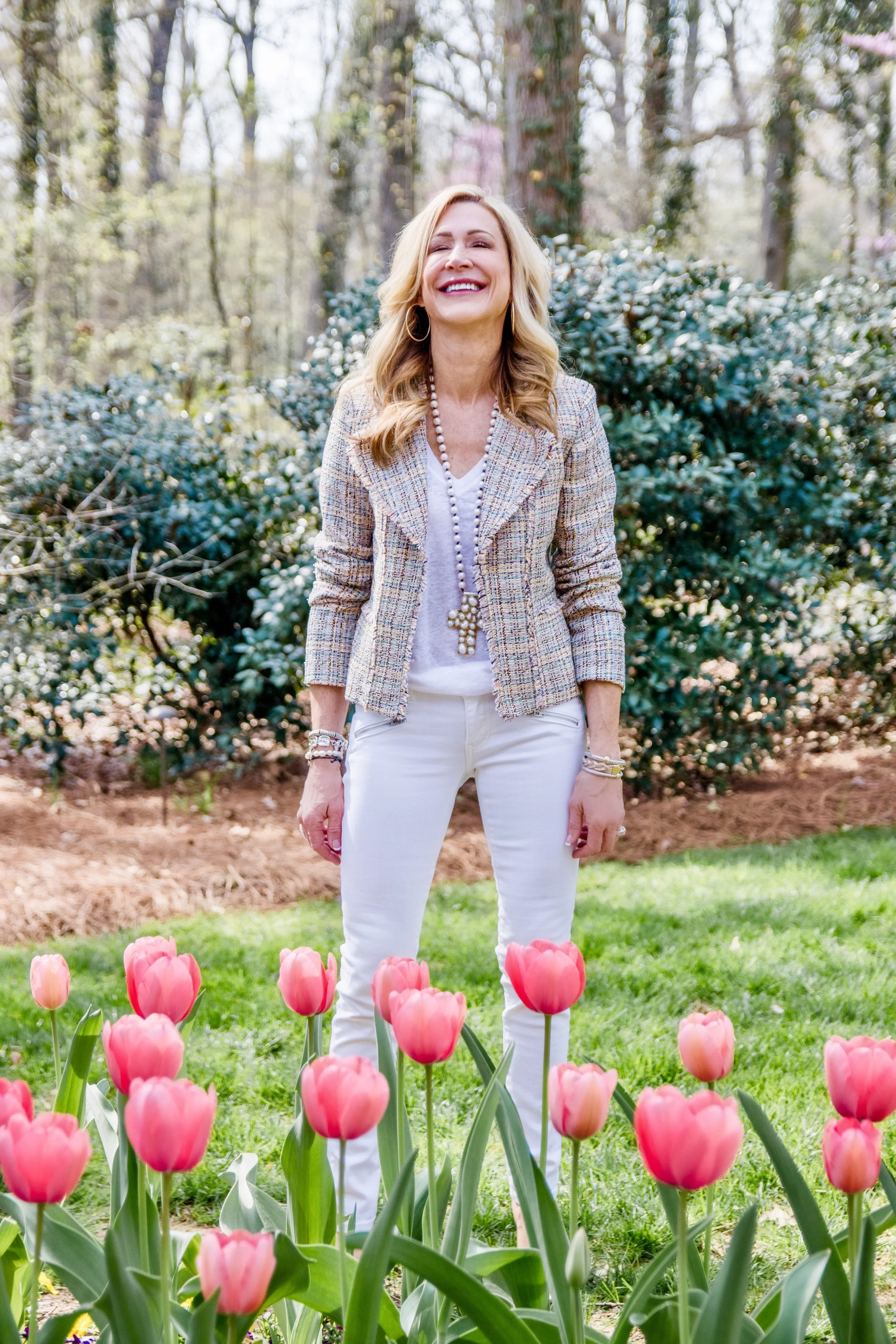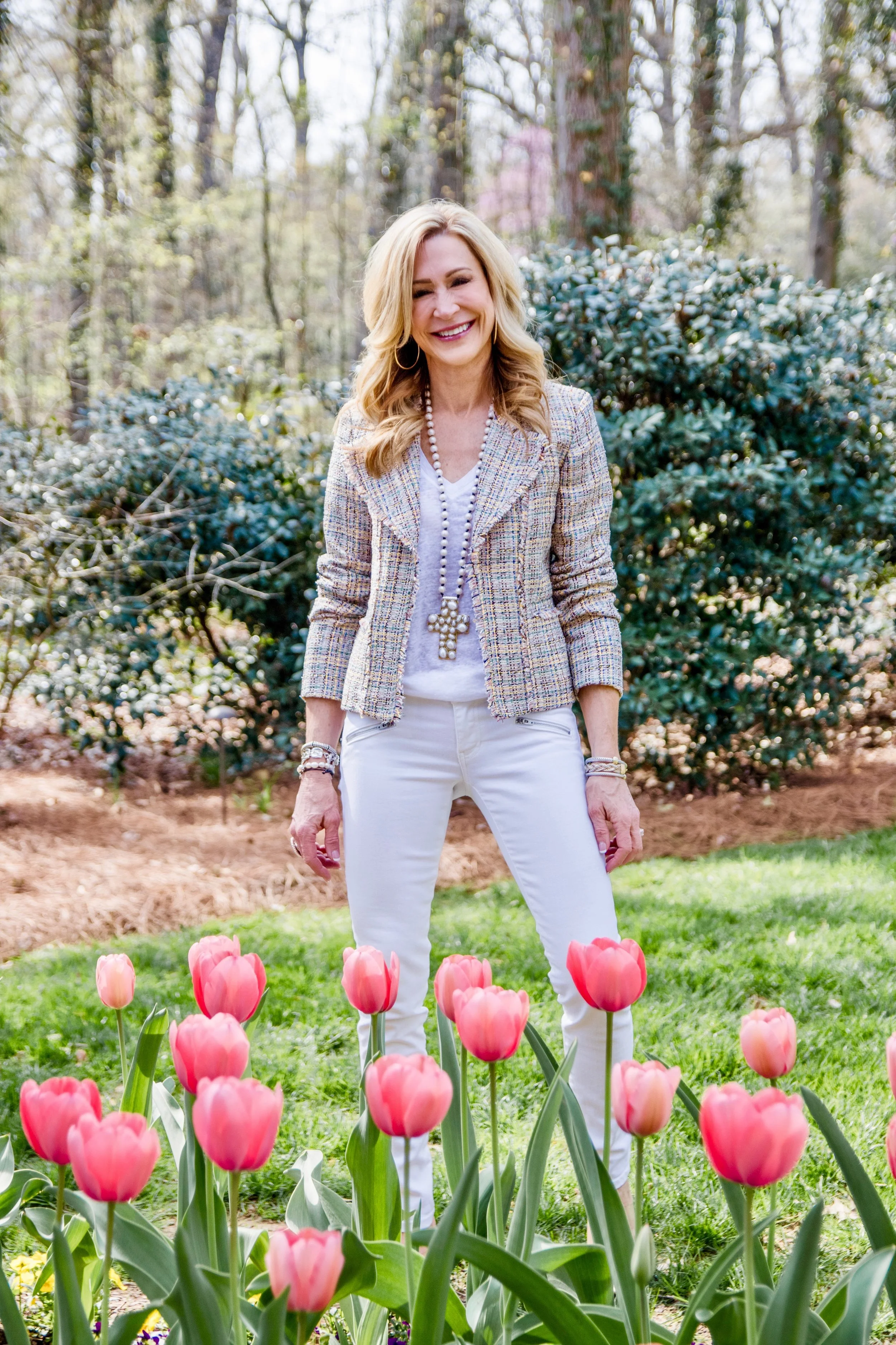 I have had my eye on this adorable tweed jacket from Loft for a few weeks now and was thrilled when I found it for 40% off! I love it with all white and my clear PVC “barbie shoes”! These shoes are a huge trend right now and they, along with my pearl cross necklace from Julie Miles (yes, I do take it off to sleep), take this outfit from average to fab in my opinion. I’m linking the exact jacket, along with similar shoes and jeans. This will be my go to outfit for spring when I want to feel just a little more dressed up!