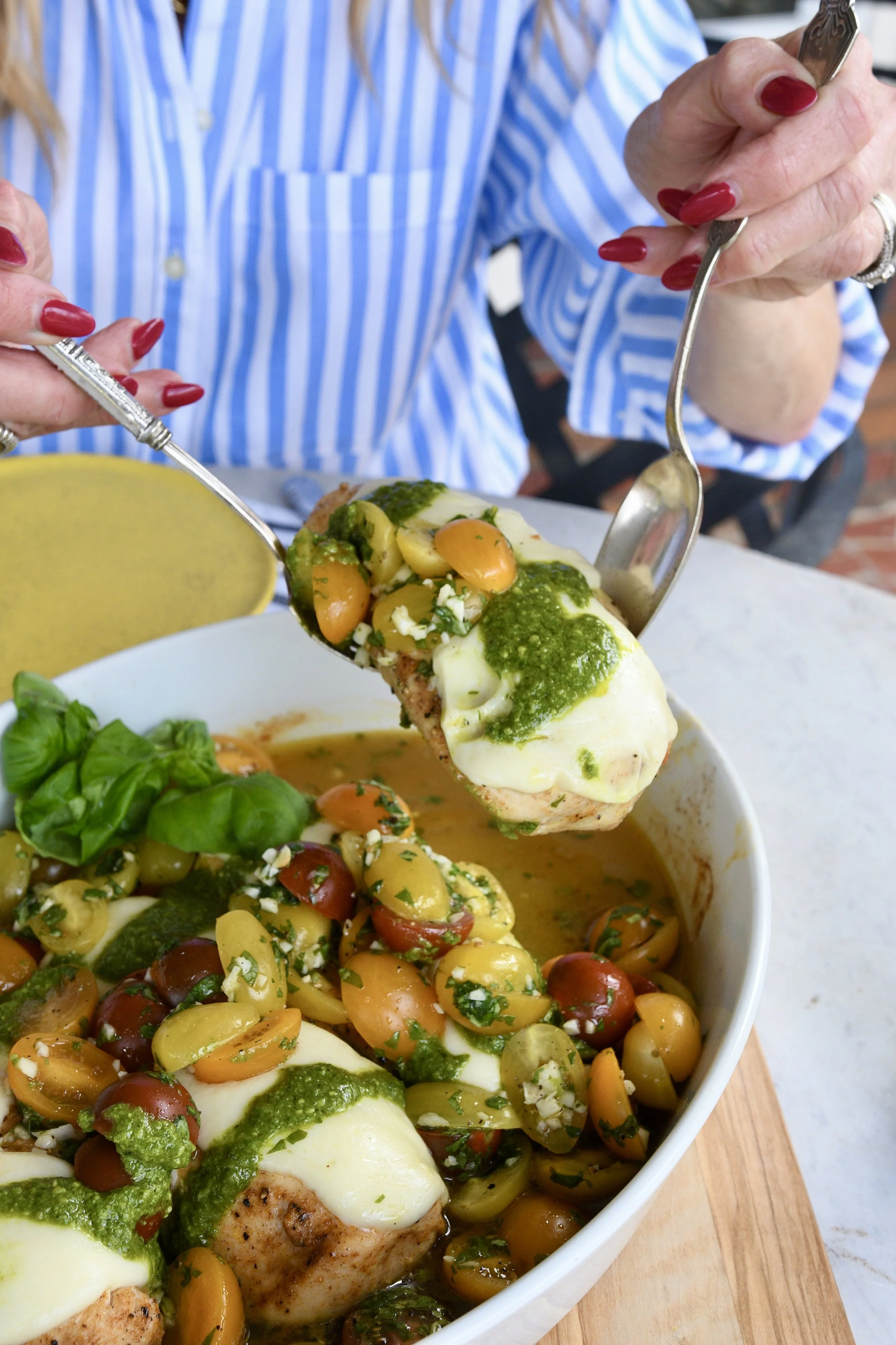 When the chicken comes out of the oven, top it with the marinated tomatoes and add as much pesto as you like! This dish is easy to make and packed with flavor! Keep scrolling for the recipe…you’re gonna love it!