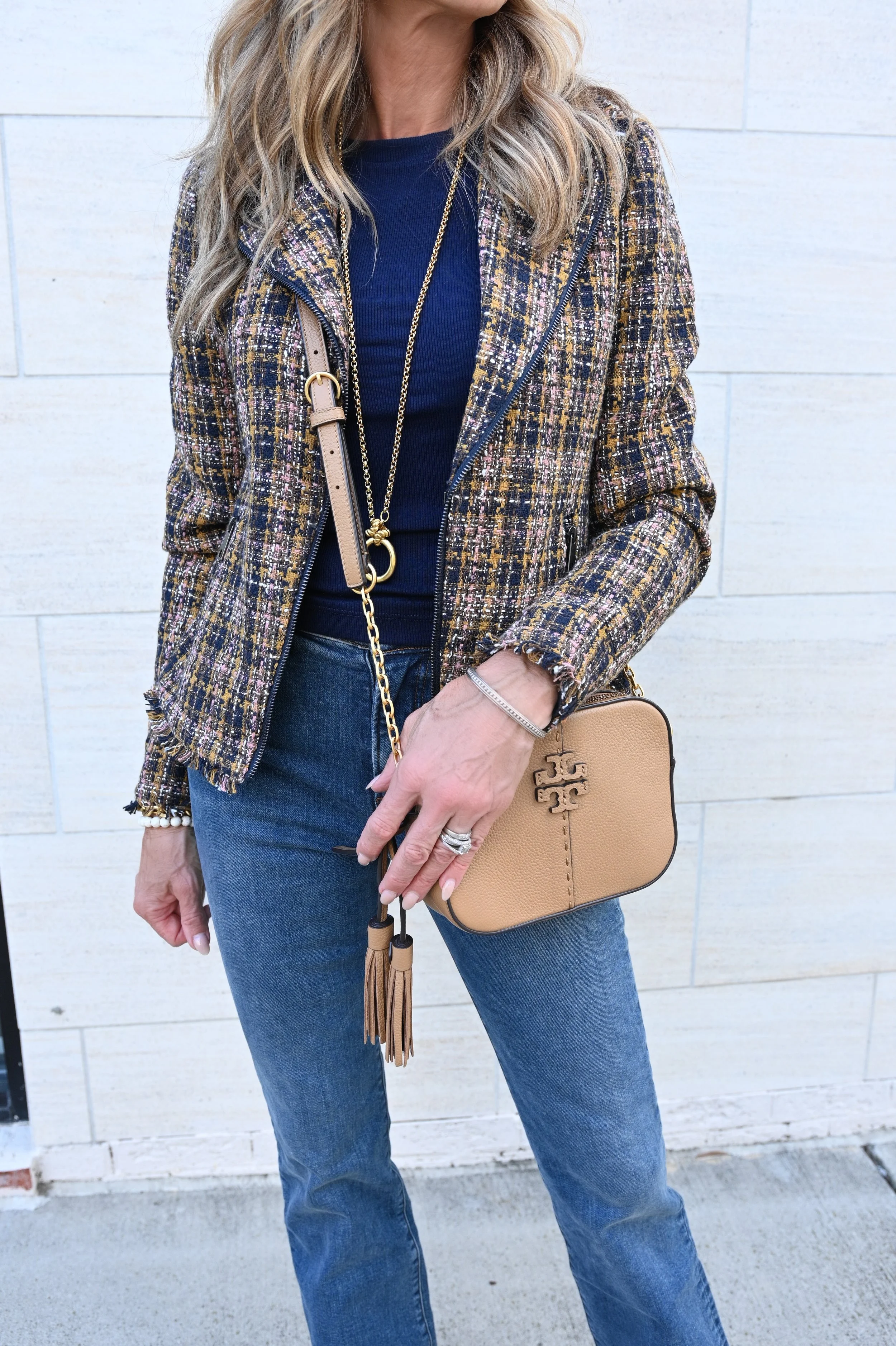 //similar tweed jacket//Tory Burch bag//navy tee//Veronica Beard jeans//Dolce Vita booties//