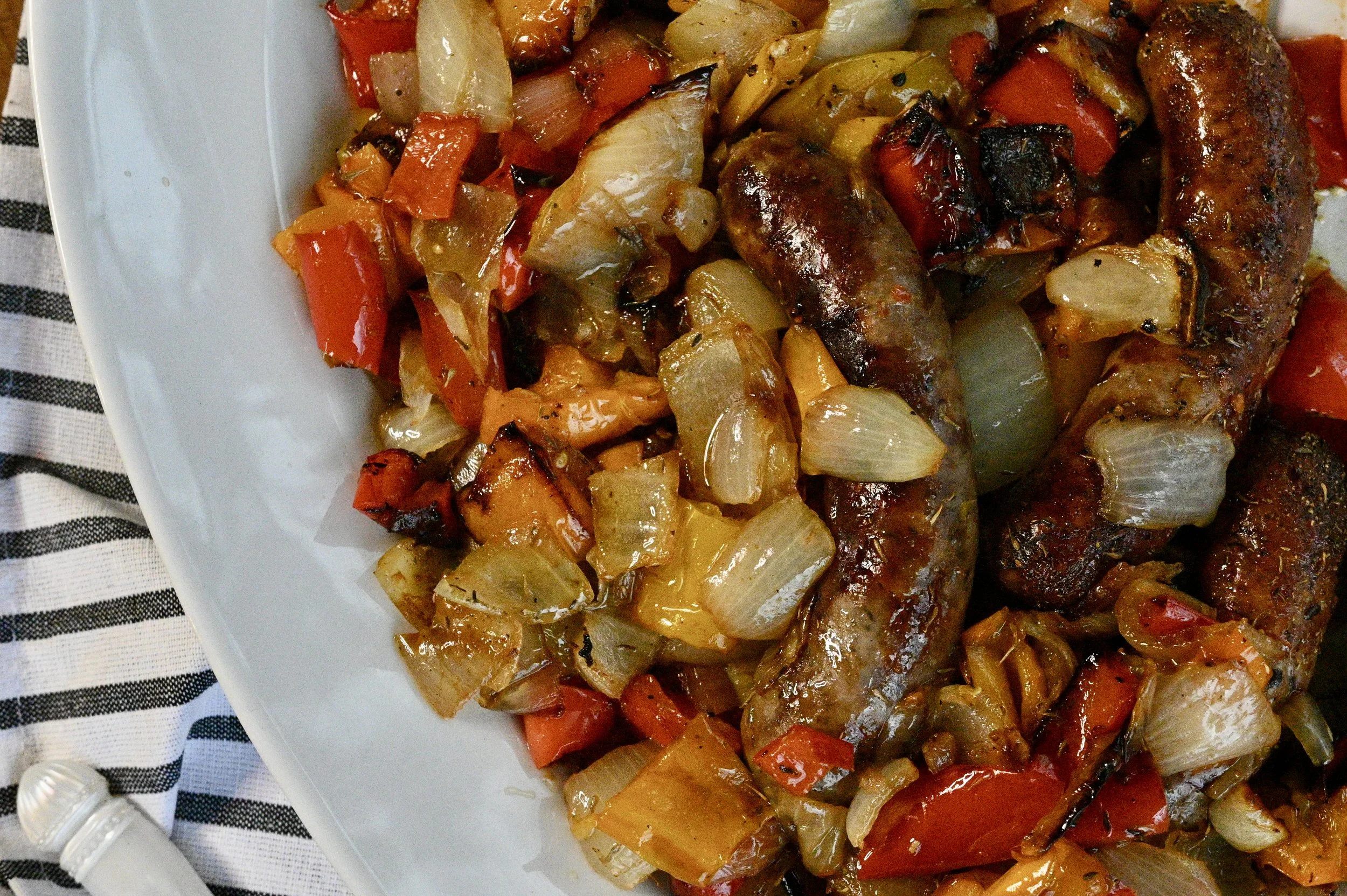 Last night went live on Instagram for my weekly cooking series and I made this delicious sheet pan Sausage & Pepper recipe. This is the kind of meal that makes everyone think you worked harder than you did but it’s only about ten minutes of actual effort. This recipe is so delicious and has earned a permanent spot in our dinner rotation! I used a local French Garlic sausage from Left Bank Butchery…if you’re local, definitely go and check it out! Everything in the shop is local and they have a huge selection of meats. For this recipe, since the sausage is the star of the show, it’s important to use the best sausage you can find.