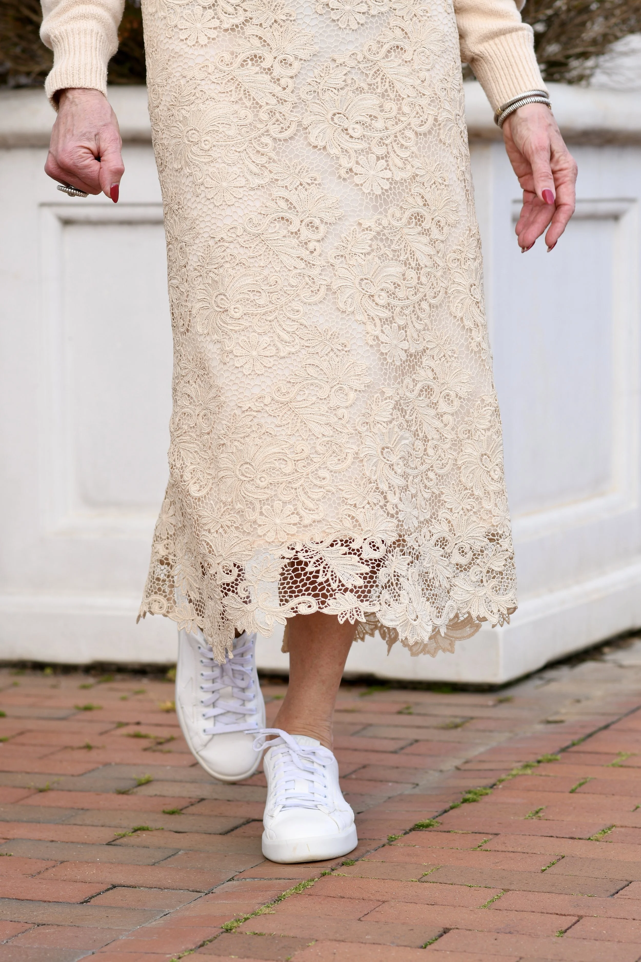 The outfit I’m wearing here is a little unexpected in the way it’s styled because of the sneakers and I’m all in for it! I took my styling inspiration from the Brochu Walker website. Normally, I would’ve styled this skirt with heels and I actually tried, but the sneakers worked every time over the heels, I really like the contrast of the sneakers and lace skirt because it’s unexpected! I do want to find a pair of lower heels that work with this outfit because the sneakers won’t go everywhere!
