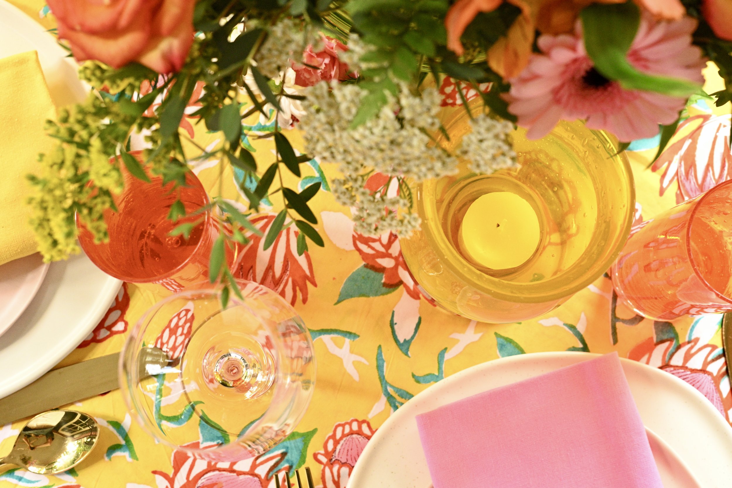 My color scheme for this table started with a beautiful tablecloth (they call it a picnic throw) that was gifted to me from Hat Attack! I love bright colors as you know and this table was really was so much fun to put together! I have the best florist who can create anything I ask her to and I simply sent the tablecloth to her and she came up with the most beautiful centerpiece that included all the colors of the tablecloth! Next…I scoured Amazon for matching linen napkins and found a perfect yellow match. I also pulled out a few of my own pink napkins to add in. I now think I have every color of linen napkins that will match any theme I ever dream up! I also pulled out some very old Vietri orange glasses (these are so pretty) and yellow candle holders that matched perfectly. I am a collector of things and it pays off when it comes to setting a table!