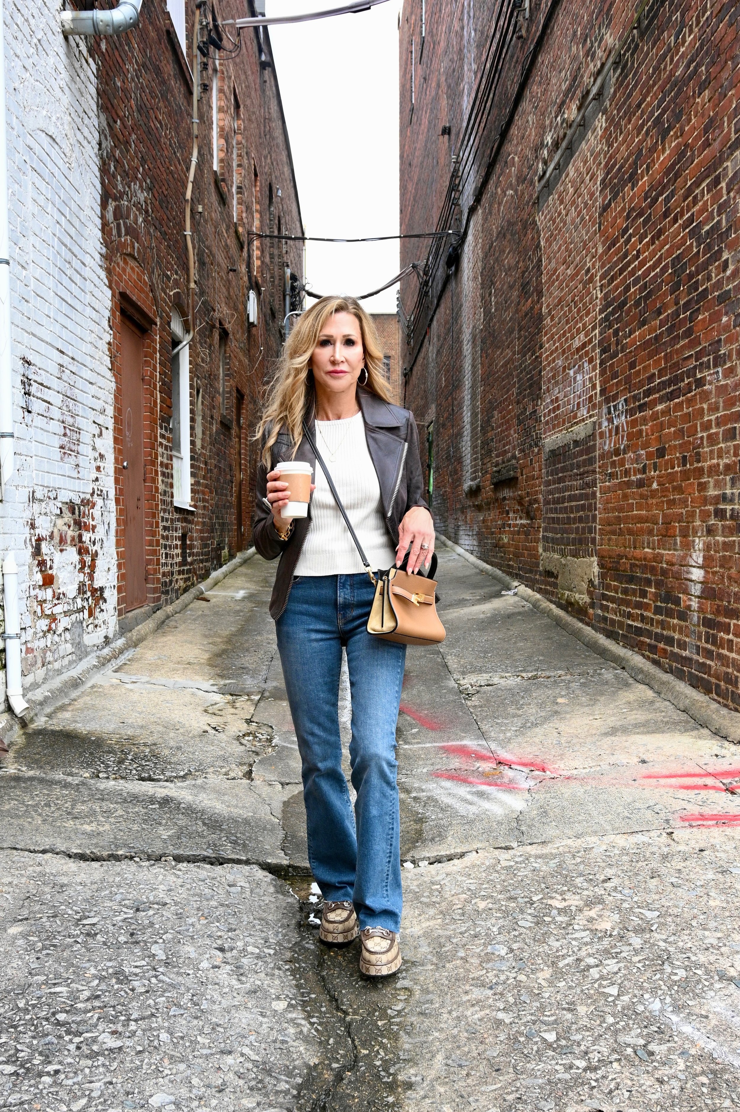 At times, I try to overcomplicate my outfit, but the truth is, I like my basics and they are the foundation of my wardrobe. In the pictures below, I’m wearing a faux suede brown moto jacket from Charlie B (they have the cutest affordable pieces) that I’ve already reached for several times. Underneath, I have on a sleeveless sweater that I found in a little boutique in Nashville (check out my Nashville Travel Guide) several years ago. The jeans are new this season from Veronica Beard and already hard to find and you’ve seen the Gucci loafers in a previous post.