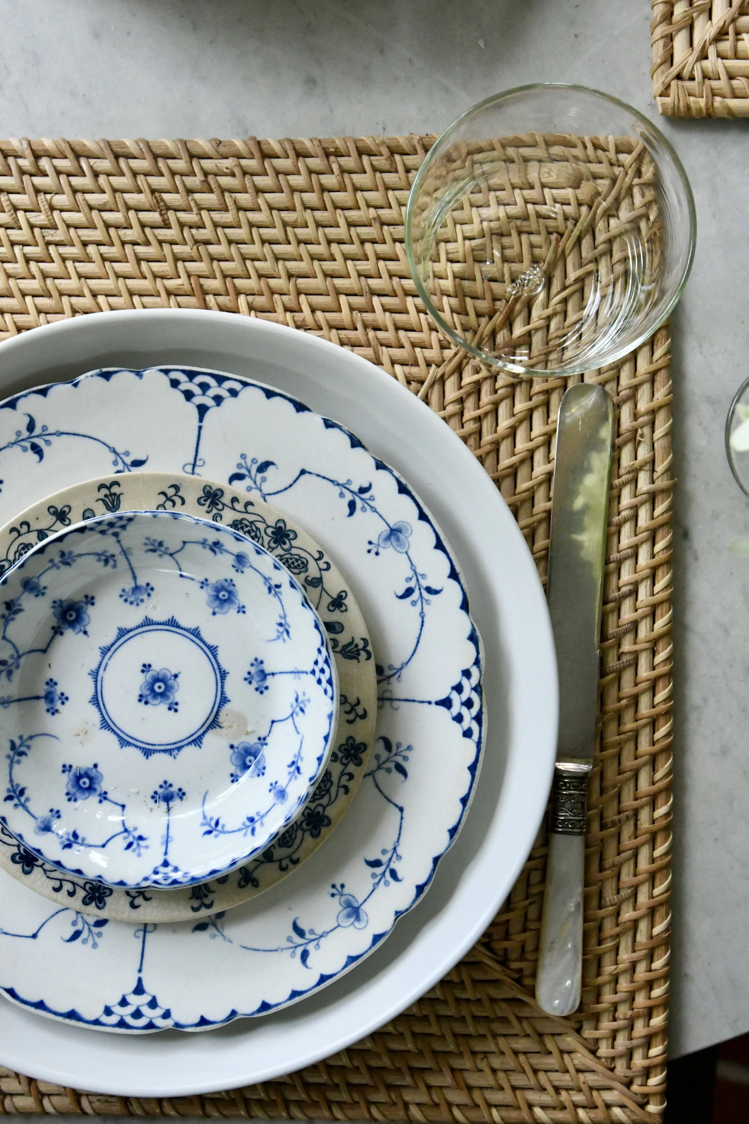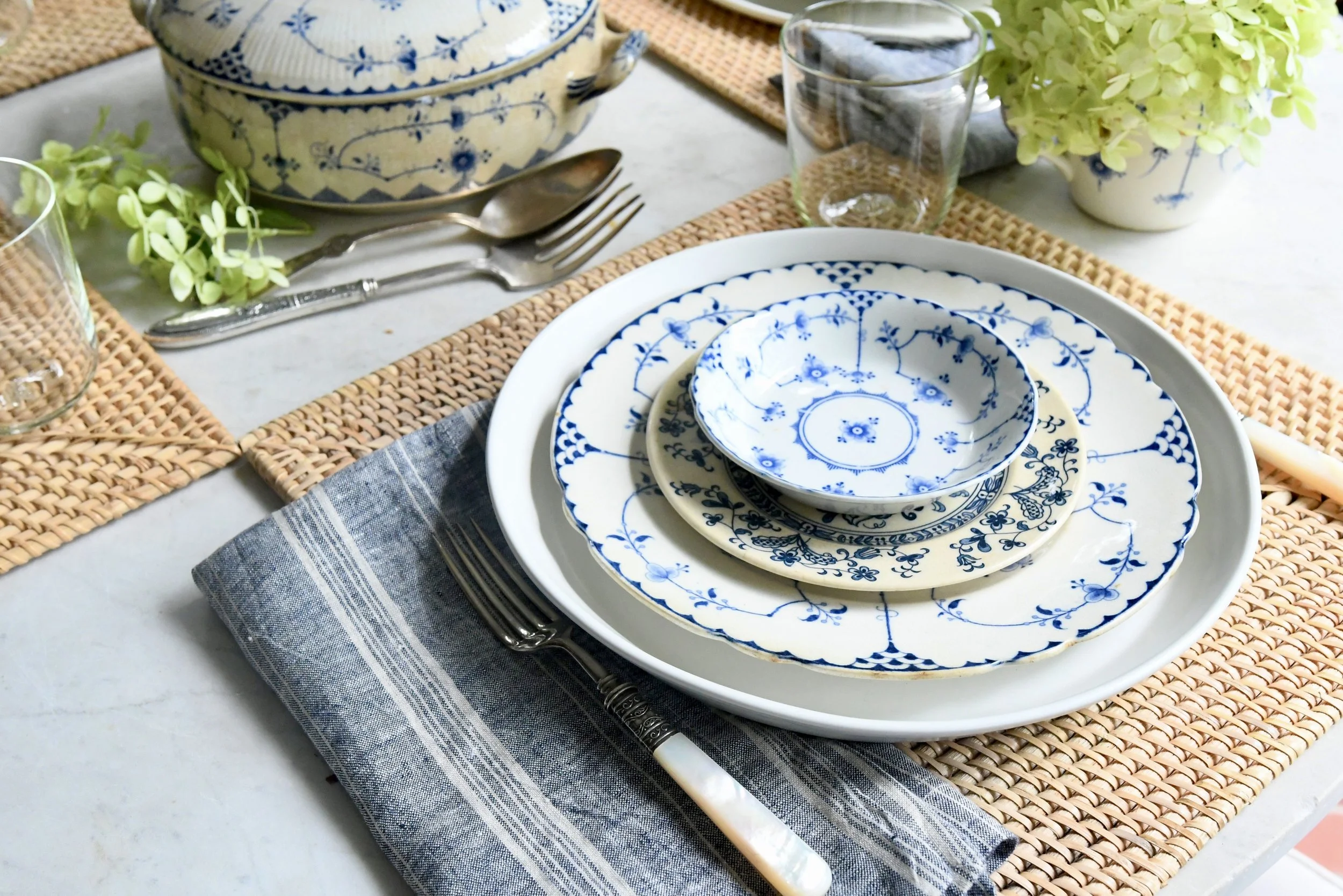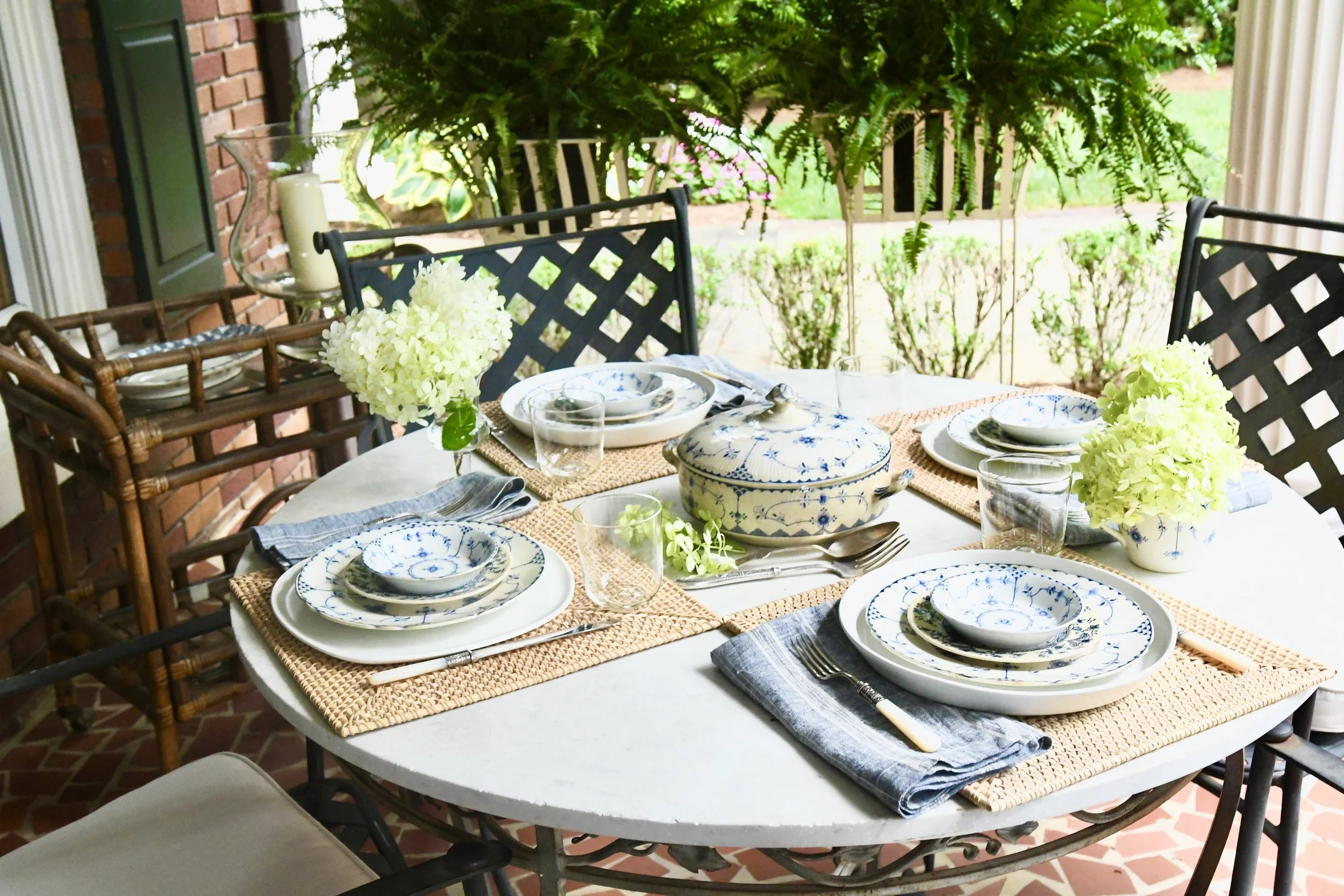 The marble top table has a nice vintage feel and is perfect on our porch. It lends itself to endless ideas for table settings. I used new Pottery Barn square placemats (square is such a great shape), Haand handblown glasses as well as two different shapes of dinner plates and my vintage blue Delftware. The mother of pearl handled cutlery is Meridian Cutlery 1855. I don’t think it’s anything fine at all, but this cutlery works well with the table scape and it’s pretty. The small terrine in the middle of the table is also blue Delftware. I had a butter dish, but it has mysteriously disappeared! Wondering if it was broken at some point and I never found out! Anyway, I bought around 32 pieces of these dishes for under $100 and I’m so glad I did!