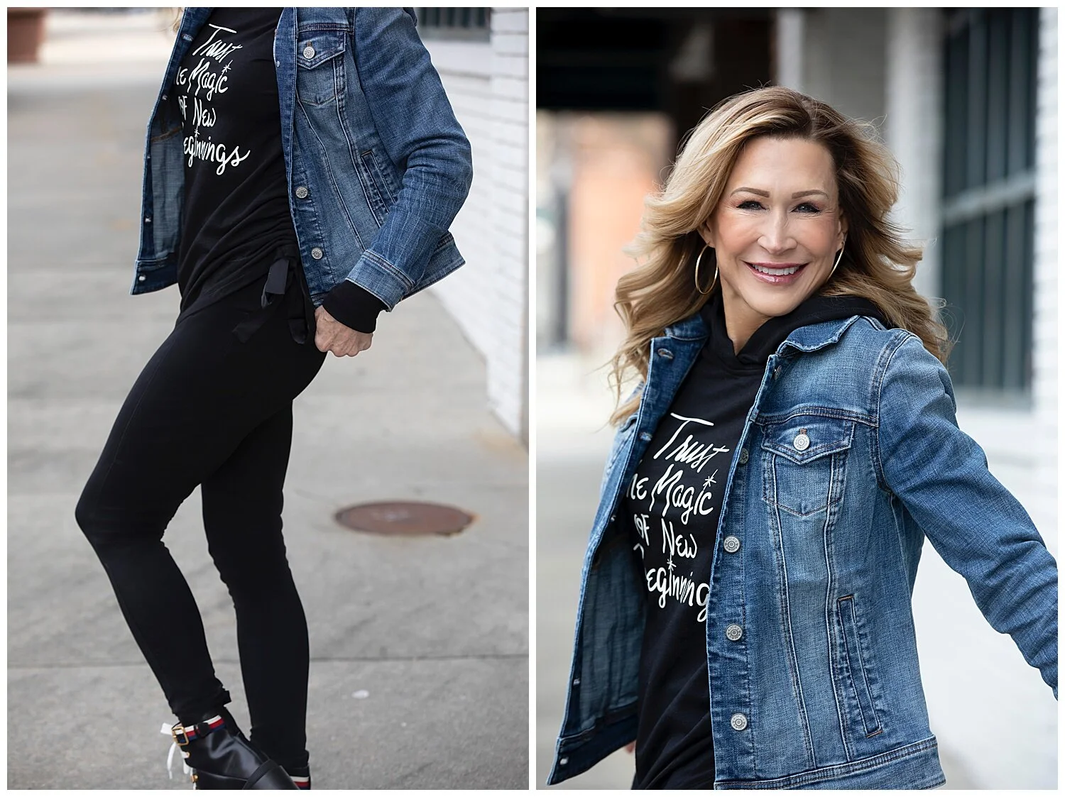 My first outfit features my favorite new Chico’s piece which is their fabulous denim jacket! I paired it with a n adorable black hoodie that says “Trust in the magic of new beginnings” and cute black side pocket leggings! My Gucci boots added just the right touch of color!