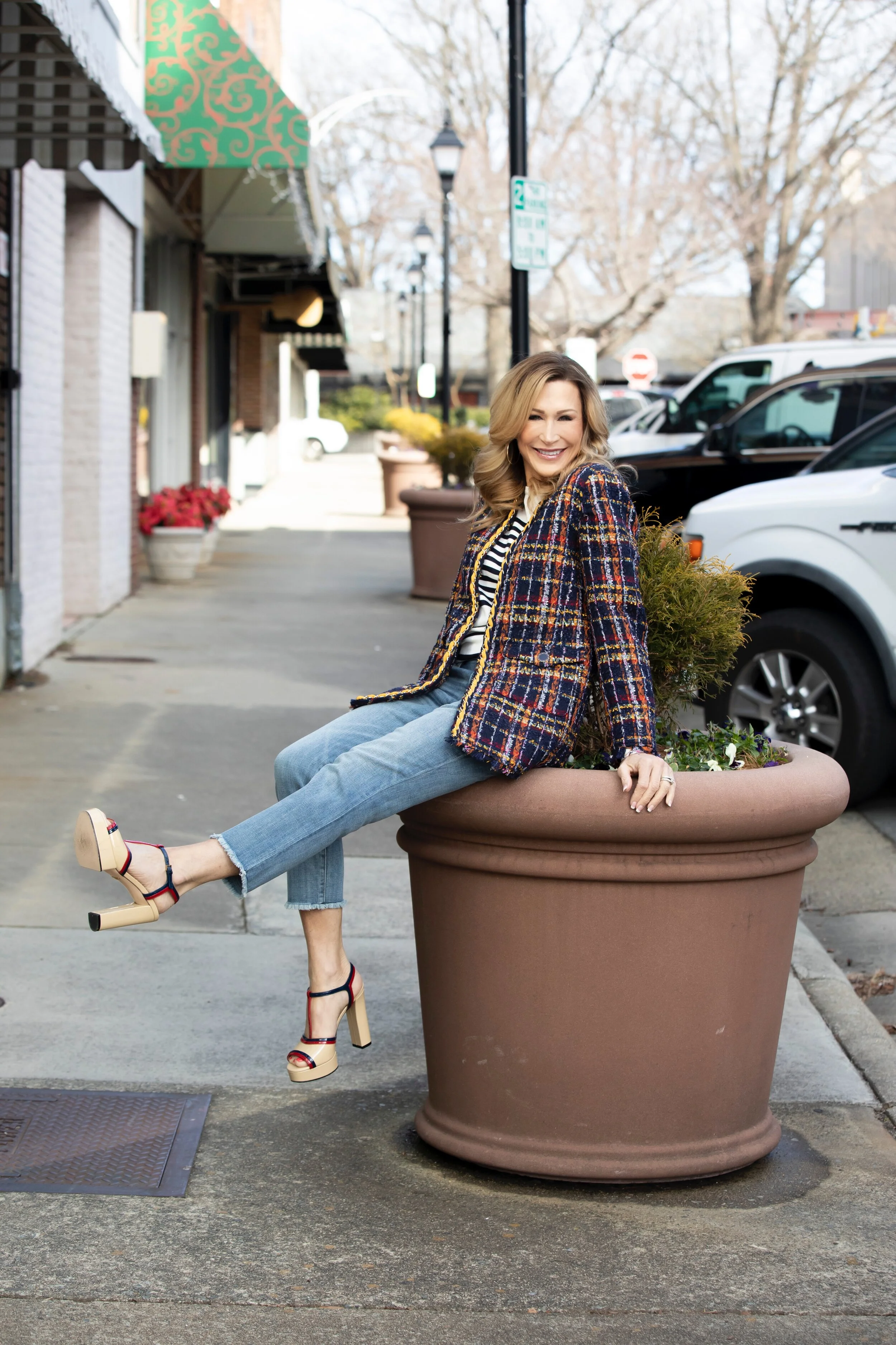 I can’t say enough about how much I love this darling and Chanelish tweed jacket! It’s going to be my go-to piece for spring! I think it would also be perfect styled with white jeans! Here, I’ve paired it with the same raw hem jeans, a striped sweater that also would be perfect with white jeans, and some sky high Gucci sandals (similar here)! I love the mix of prints and how the jacket dresses up an otherwise casual outfit!
