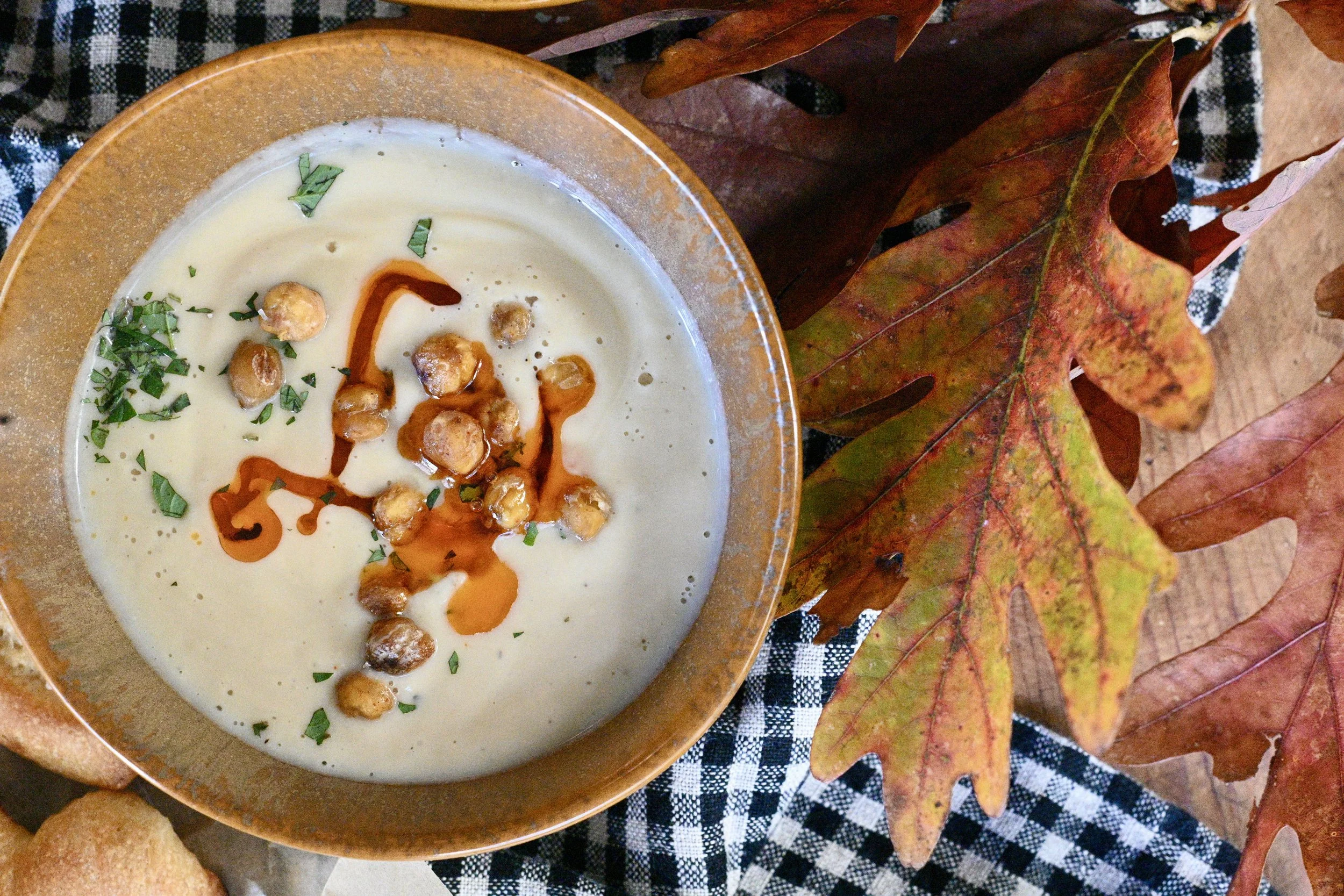 This delicious creamy cauliflower soup is proof that ease and flavor can coexist beautifully. Shared by a friend and now a staple in my kitchen, this recipe turns a few simple ingredients into something special. With just cauliflower, onions, raw cashews, vegetable broth, and salt, it achieves a rich, creamy flavor with very little effort. After slow-cooking until everything is tender, the mixture goes into the blender, and is transformed into a silky, plant-based soup thats so satisfying. A drizzle of Calabrian chili oil and a handful of roasted chickpeas add heat and crunch, elevating a simple meal into something special. It’s healthy comfort food at its best…warm, balanced, and nourishing! Keep scrolling for the recipe!