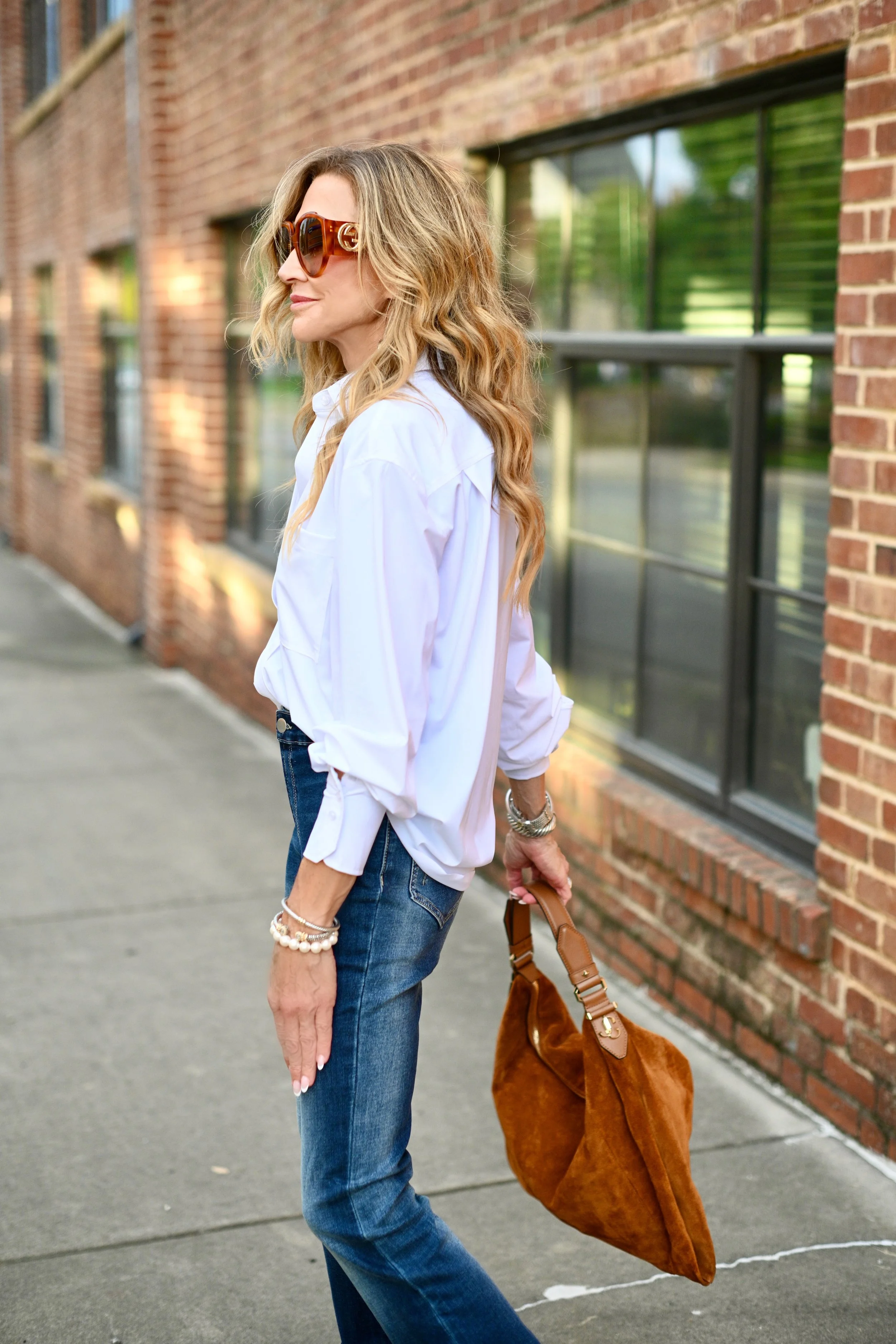 Some mornings, I want a look that feels polished but still a little playful — something I can wear from coffee to cocktails and everywhere in between. That’s when I reach for a these pieces from Lyssé New York…a fabulous pair of dark wash jeans and a crisp white blouse, but with accessories that make it all feel fresh and fashion-forward.