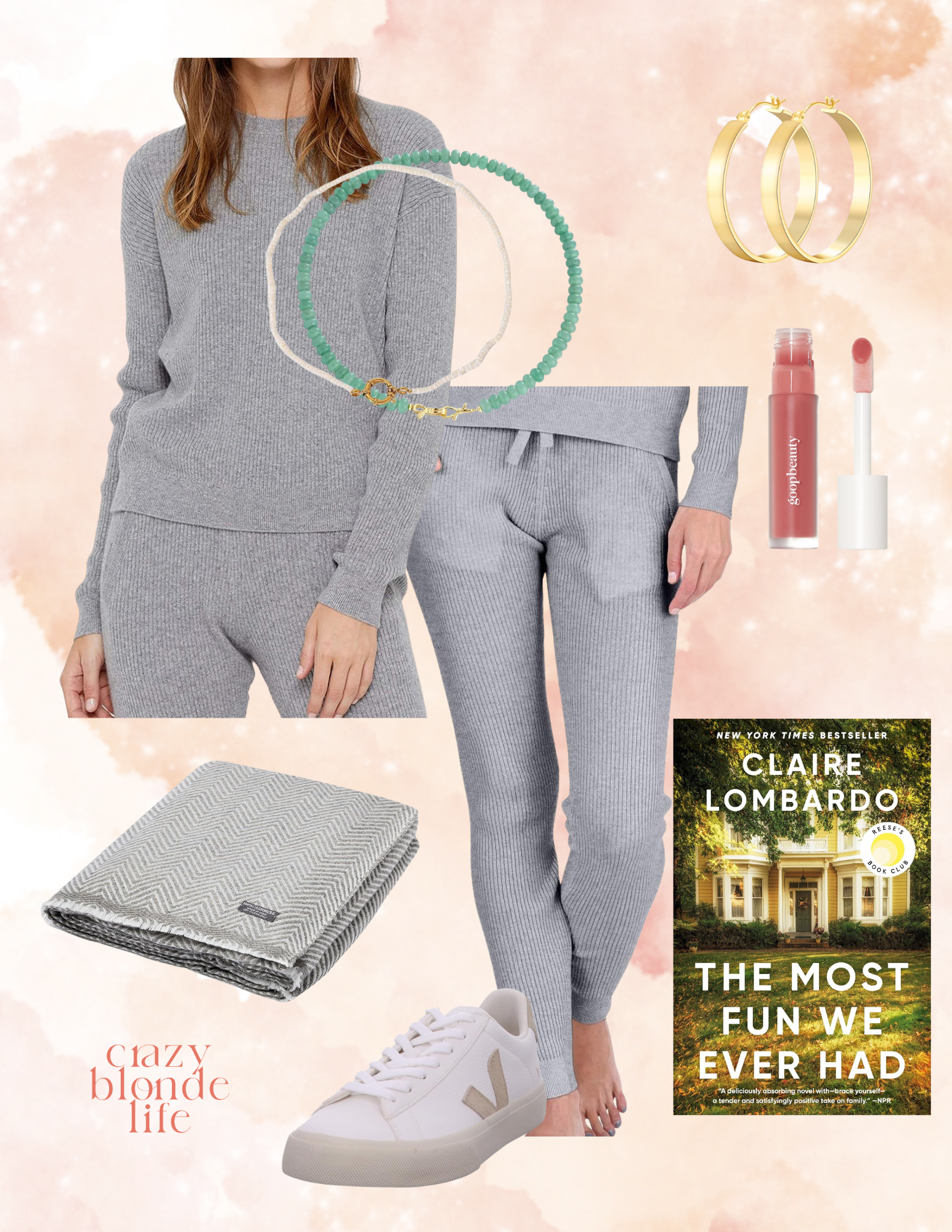 //Two Piece Lounge Set (sold separately - view the top here)//Turquoise Necklace//White Beaded Necklace//Gold Earrings//Goop Lip Gloss//The Most Fun We Ever Had Book//Veja Sneakers//Cashmere Throw//
