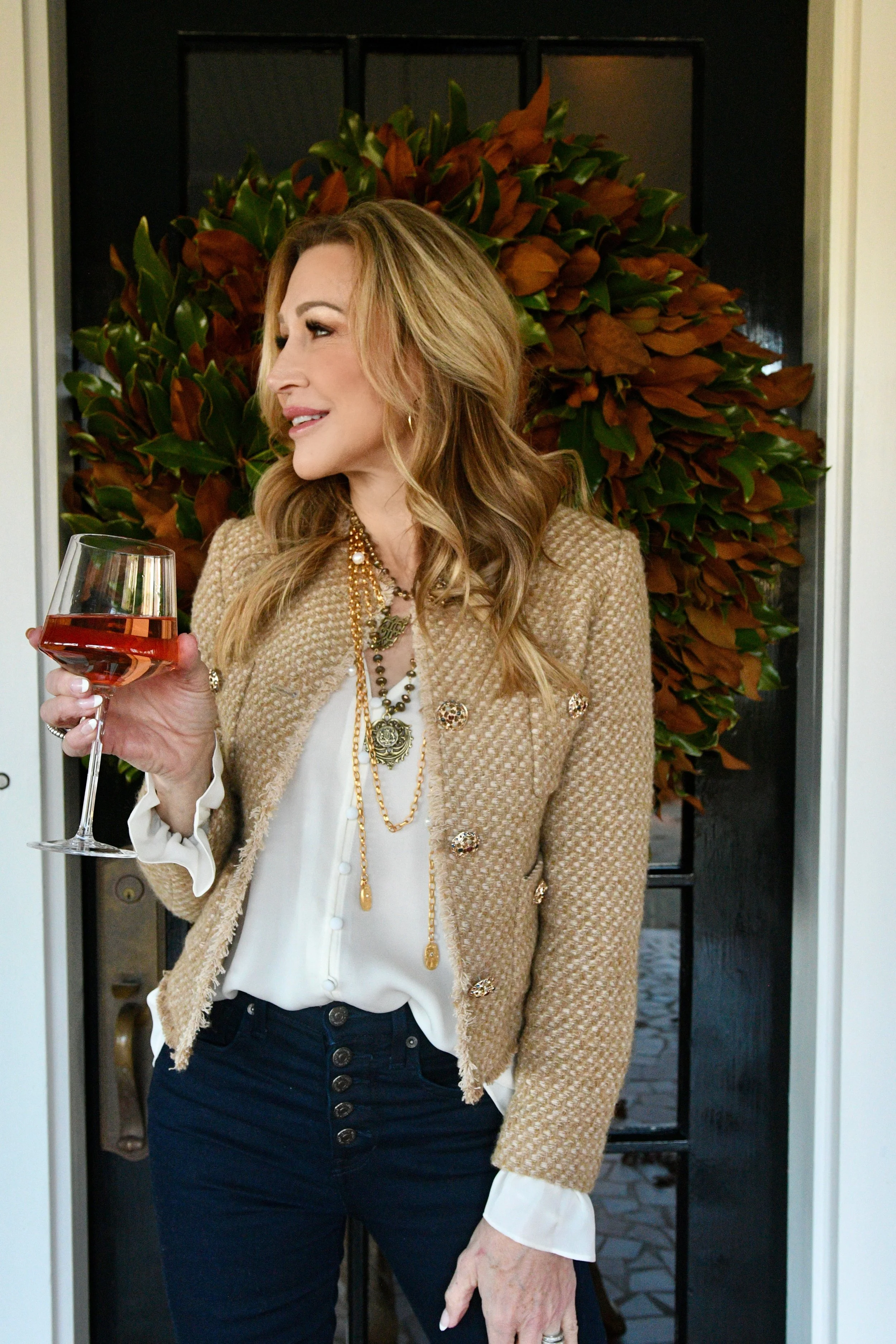 The first outfit was created around a new holiday jacket from Mango! I love this jacket because of the Chanel vibe and sparkly thread. It’s a great color to wear with black, off white or even light wash jeans. My jeans are skinny jeans from Veronica Beard that are still available and also come in black (I linked both). The boots are several season old from Tory Burch but I managed to find them so if you want the exact boots, they are linked. I’ve loved these boots because they are warm and the color is neutral so they go with everything! The blouse is older from Joie and my jewelry is from French Kande!