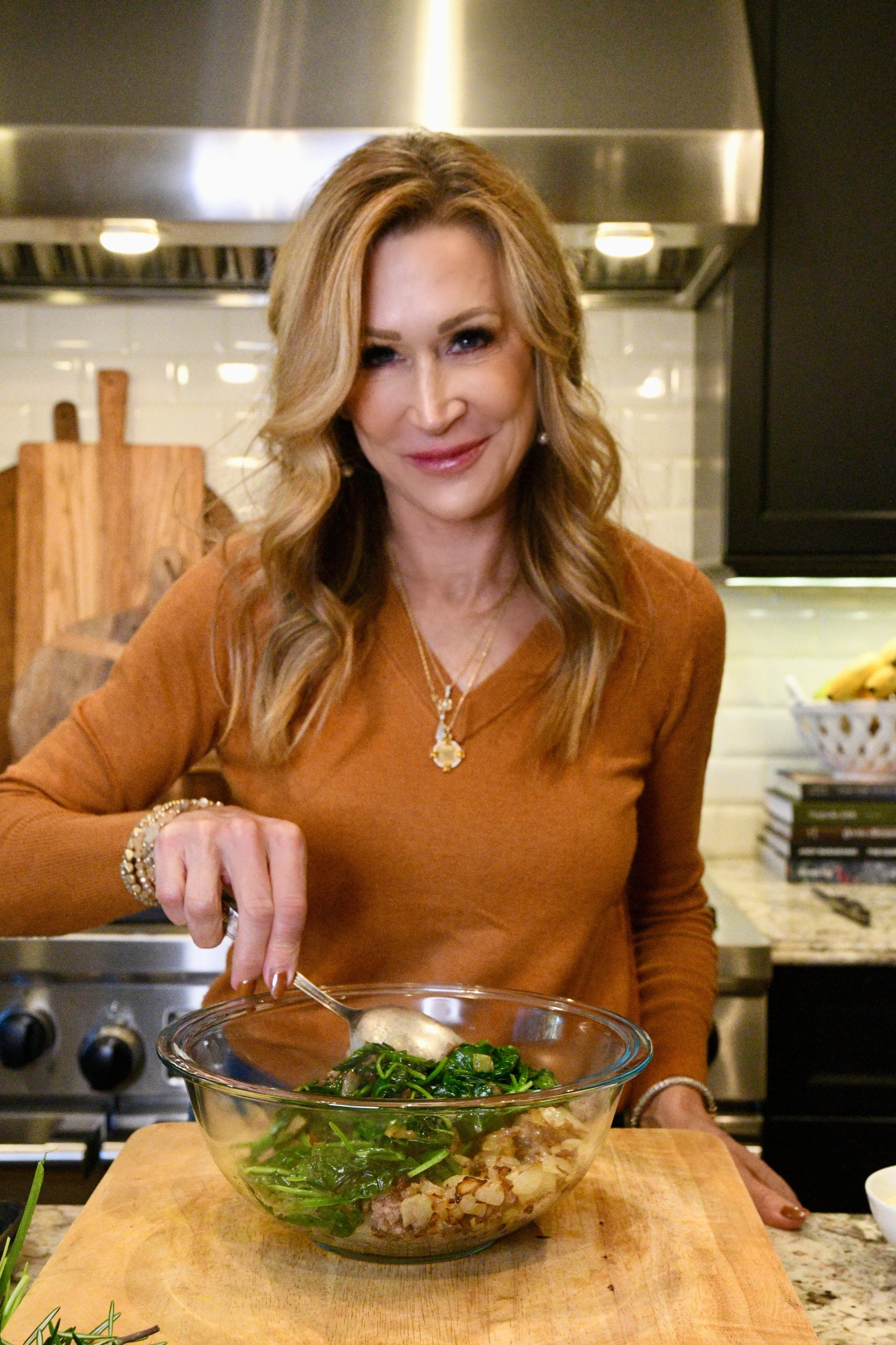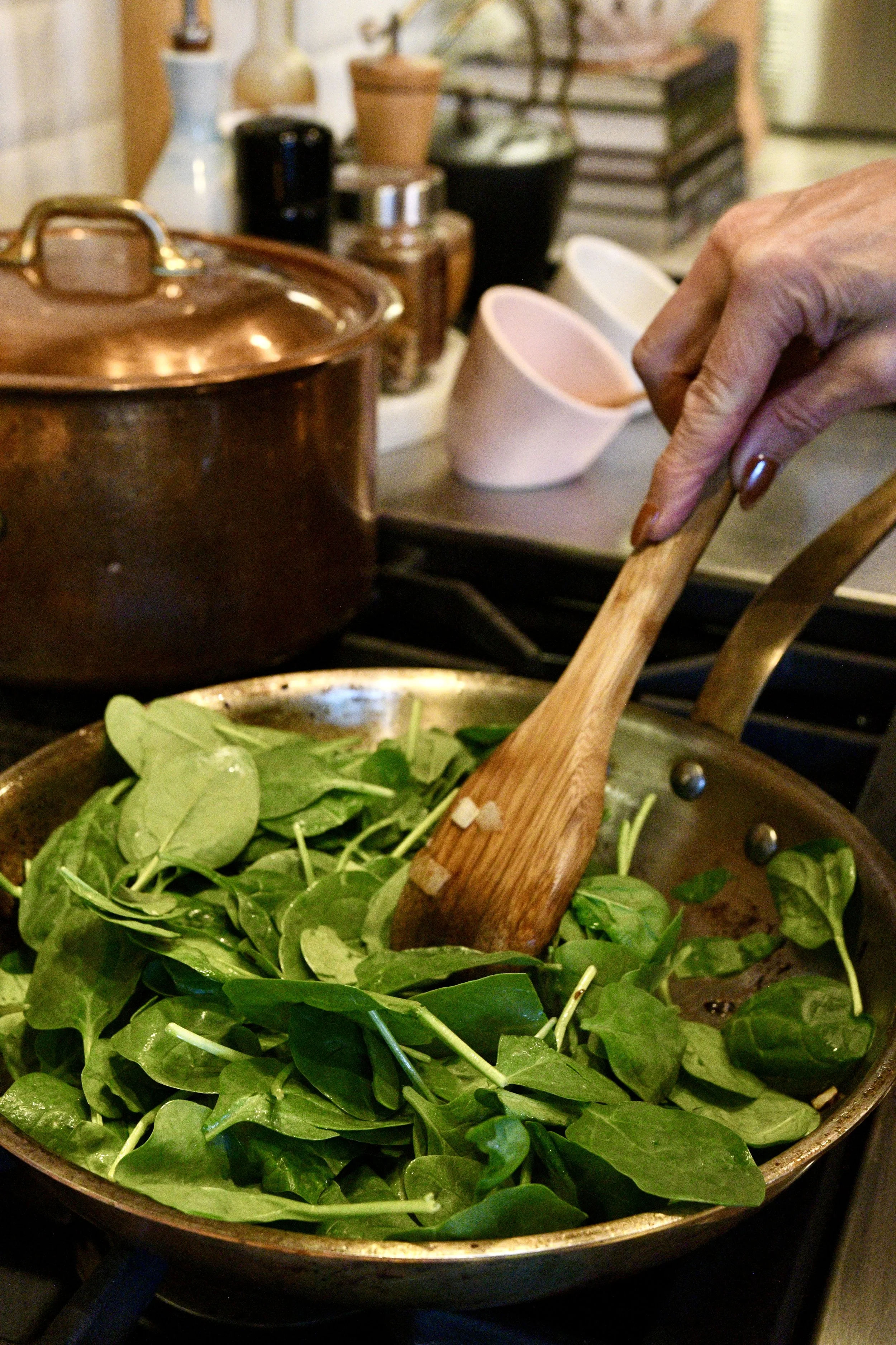 The spinach wilts in no time…just add about two large handfuls to a hot pan! You’ll need more than you think…