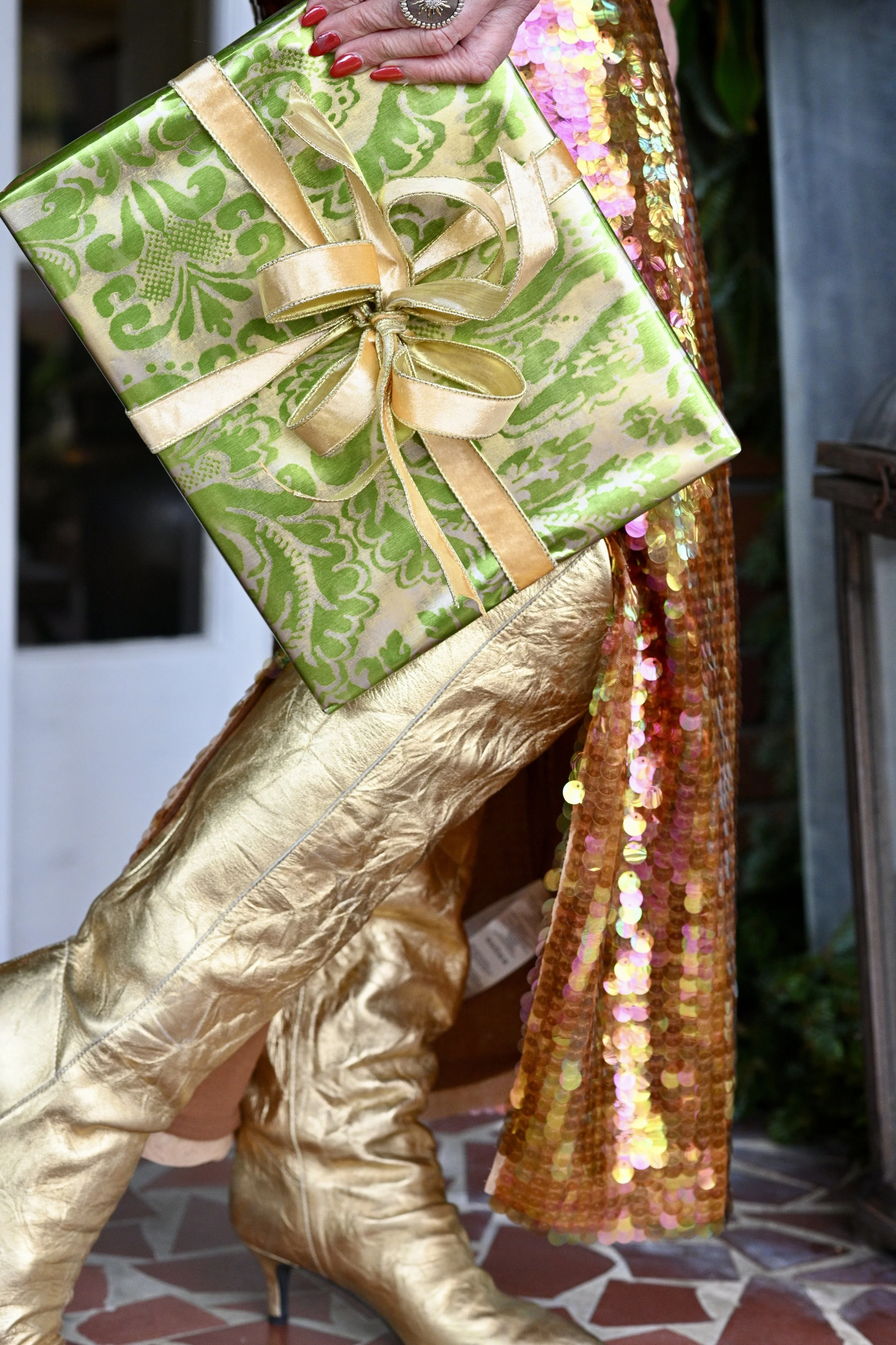 This outfit is my kind of holiday style…festive, comfortable and fun. The skirt is from Anthropologie and I love how it shimmers. Unfortunately, it’s sold out (because it’s so dang cute) but if you’re still looking for something to wear for New Year’s Eve, I’ve linked several other skirts below. The sweater is from a brand that’s fairly new to me called Benaar Los Angeles (this bag that I’ve had for a while is also from Benaar). Benaar clothing is well priced and great quality which is a win/win! I love the sweater because it’s so soft, the bows make it festive…and it can also be worn with the bows in the back. I also purchased this gorgeous coat from Benaar to wear over the sweater (more favorites linked below). I would wear this sweater with a sequined skirt as well! The gold boots are several years old from Free People (also love these) and I’ve been surprised at how often I wear them.