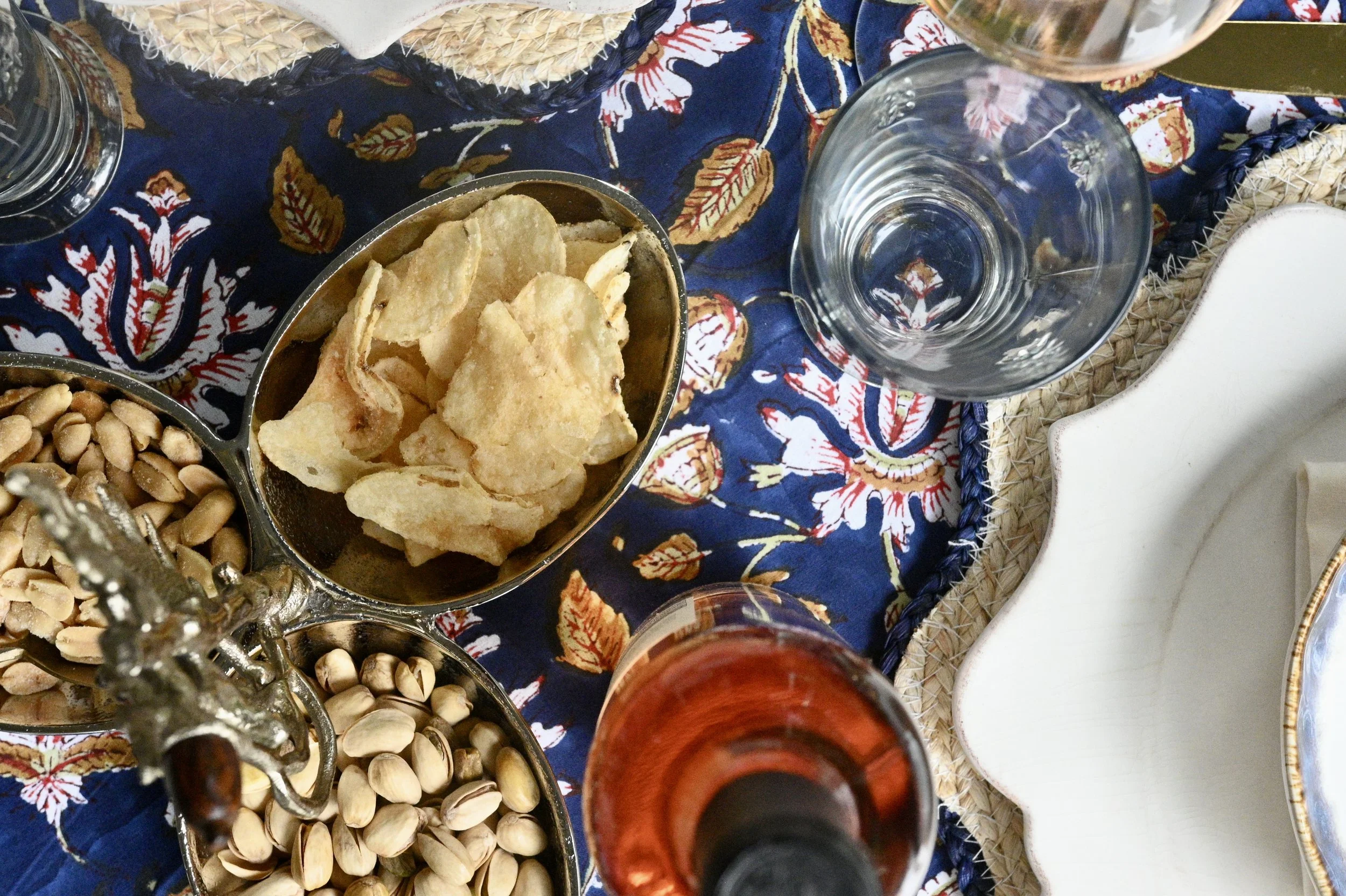 The table is set with a gorgeous fall tablecloth from Just Darviny, napkins from Christina Dickson Home, older chargers from Skyros, Mikasa bowls (similar here), rustic plates from Anthropologie (similar here), clear water glasses with bees, Amazon wine glasses, brass flatware, and mercury glass candlesticks and pumpkins. I threw a lightweight blanket over the chairβ¦just in case thereβs a chill in the air!
