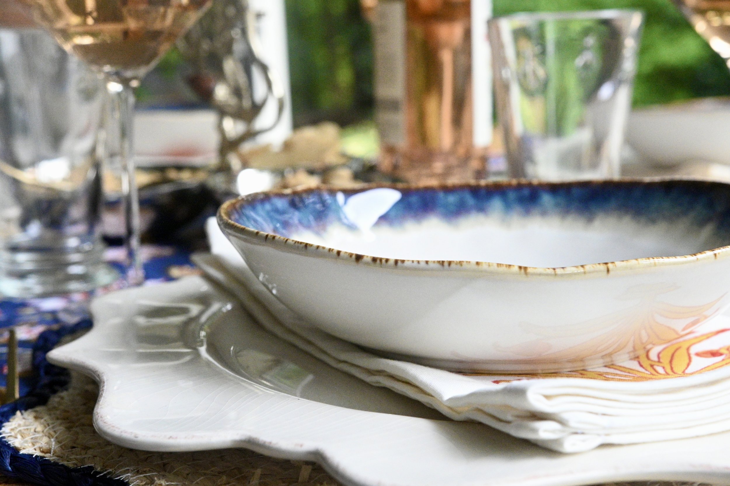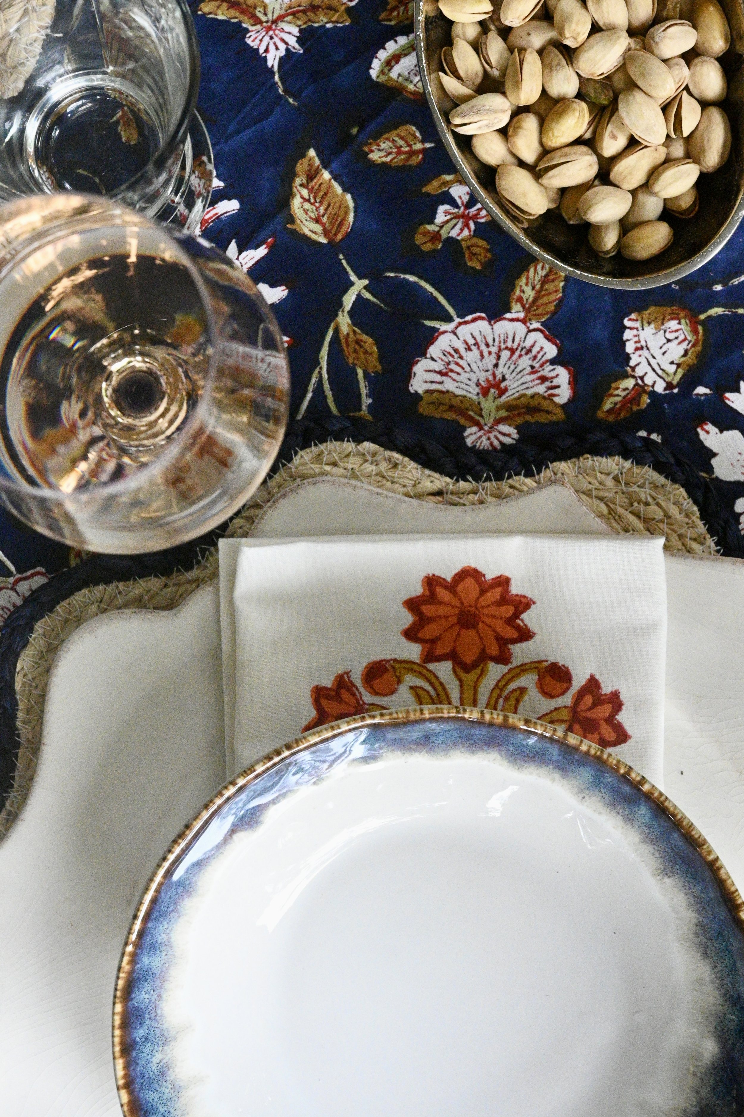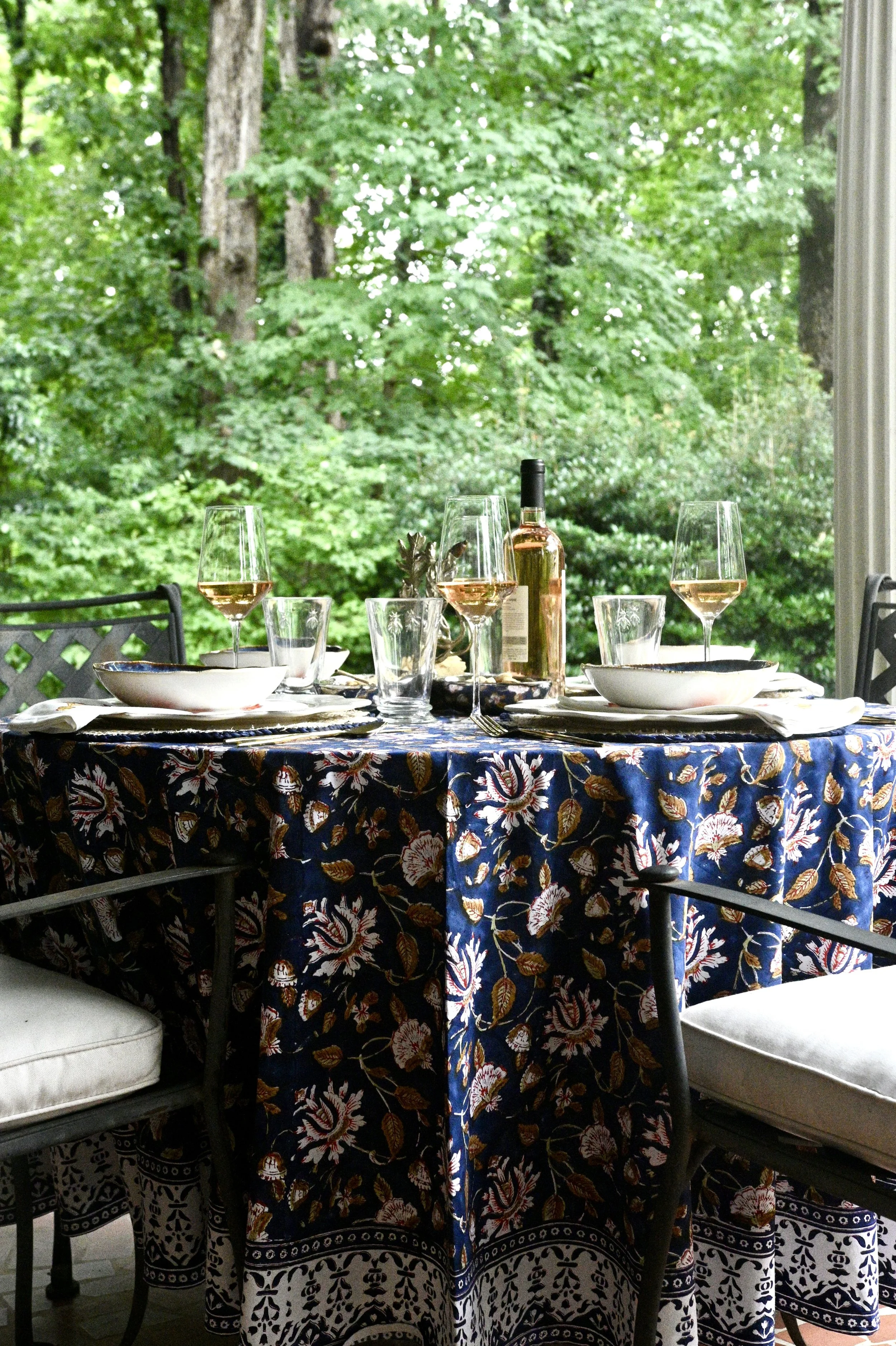 A fall tablescape on the front porch feels extra cozy when styled on a round table set for four and draped with a seasonal tablecloth in warm autumn tones. Blue and white dishes set on top of blue rimmed, raffia placemats and napkins that compliment the tablecloth make a beautiful fall setting! Itβs been so humid and warm here in North Carolina and weβre ready for fall dinners on the porch surrounded by the crisp air. This table is perfect for enjoying the season outdoors!