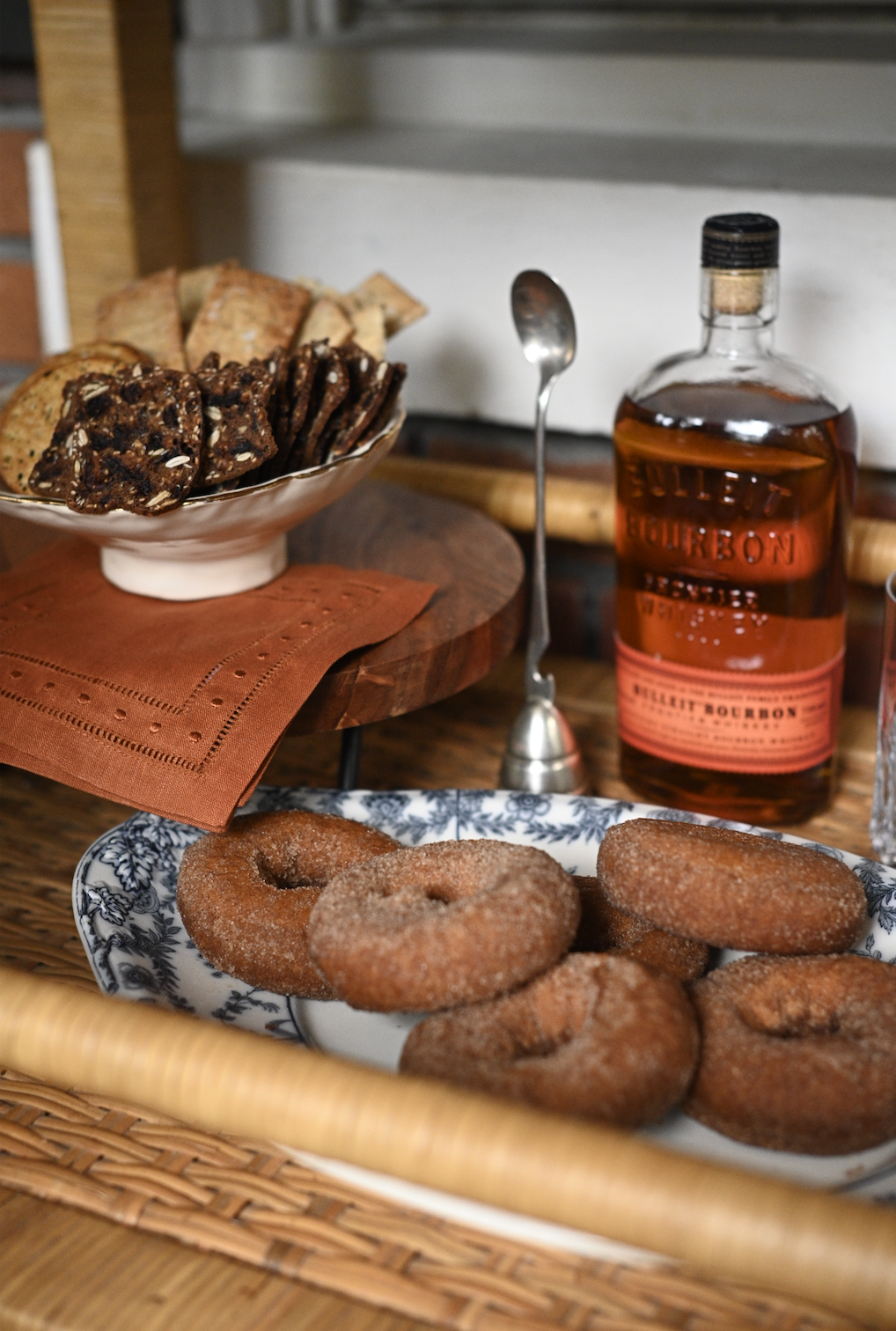 The fall cheese platter was made on a marble footed board (similar here) and set on the bar cart beside the table. I used three cheese that deliciously compliment each otherβ¦St. Andre, Holboldt Fog and an herbed goat cheese. Figs and red grapes are a seasonal addition to the board. I also included a chili fig spread and hot honey in a small glass jar with a wooden top and spoon.