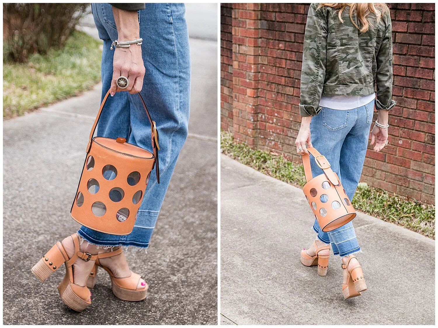 The camo jacket from Loft is a few seasons old (Iβm linking a similar one) and a closet staple for me! I added a cropped white tee, some very tall Chloe sandals (similar here) and a Tory Burch bucket bag, again from a previous season. This outfit is pretty basic, but it works for so many occasions. I would also pair the olive green tank with this outfit, minus the camo jacket. I found that when trying on tops and jackets with these jeans, that cropped was better for me. If youβre tall with a long torso, you might find you can wear a longer jacket.