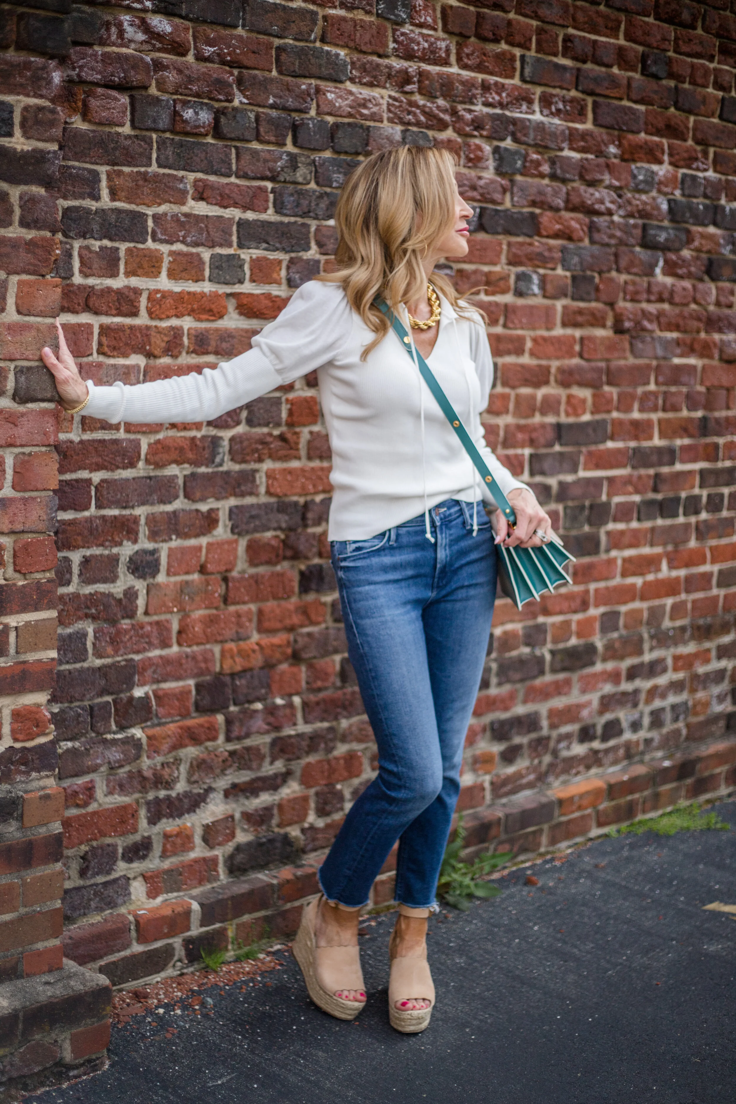I’m wearing a pair of Citizens of Humanity Jeans, a Rebecca Taylor sweater, a Brinker & Elize chain link necklace, a Marni bag from several seasons ago, and Chloe espadrilles from last spring. The necklace and bag add just enough of a punch to take this outfit from plain to wow! Accessories really do make a difference!