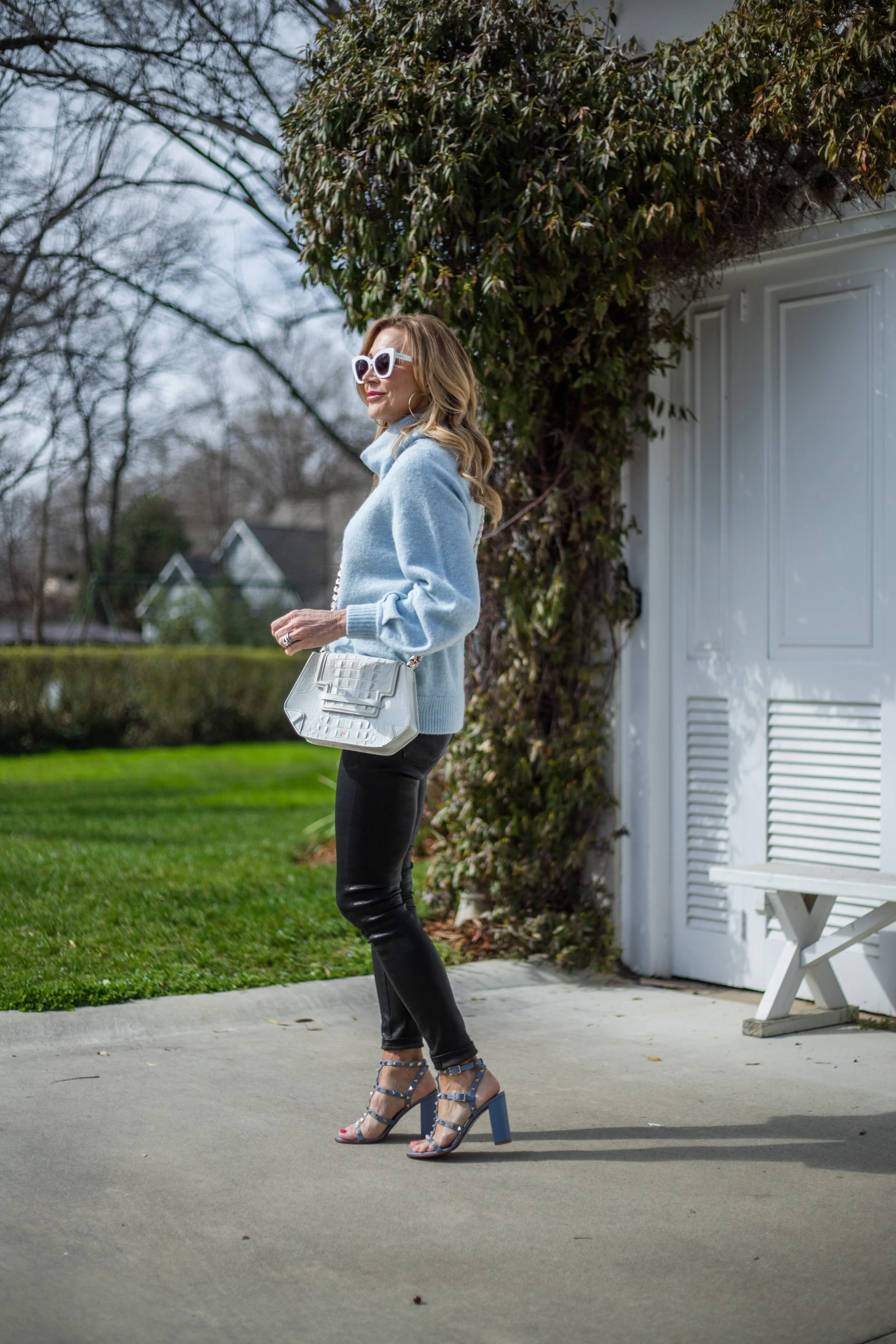 This outfit is really simple, but the accessories are fabulous. My blue Valentino sandals work so well with the leather pants and blue sweater and the white handbag and sunglasses definitely jazz things up! I’ll wear these leather pants into May and pull them back out in September! Leather is an investment and if you purchase leather pants, you should be wearing them!