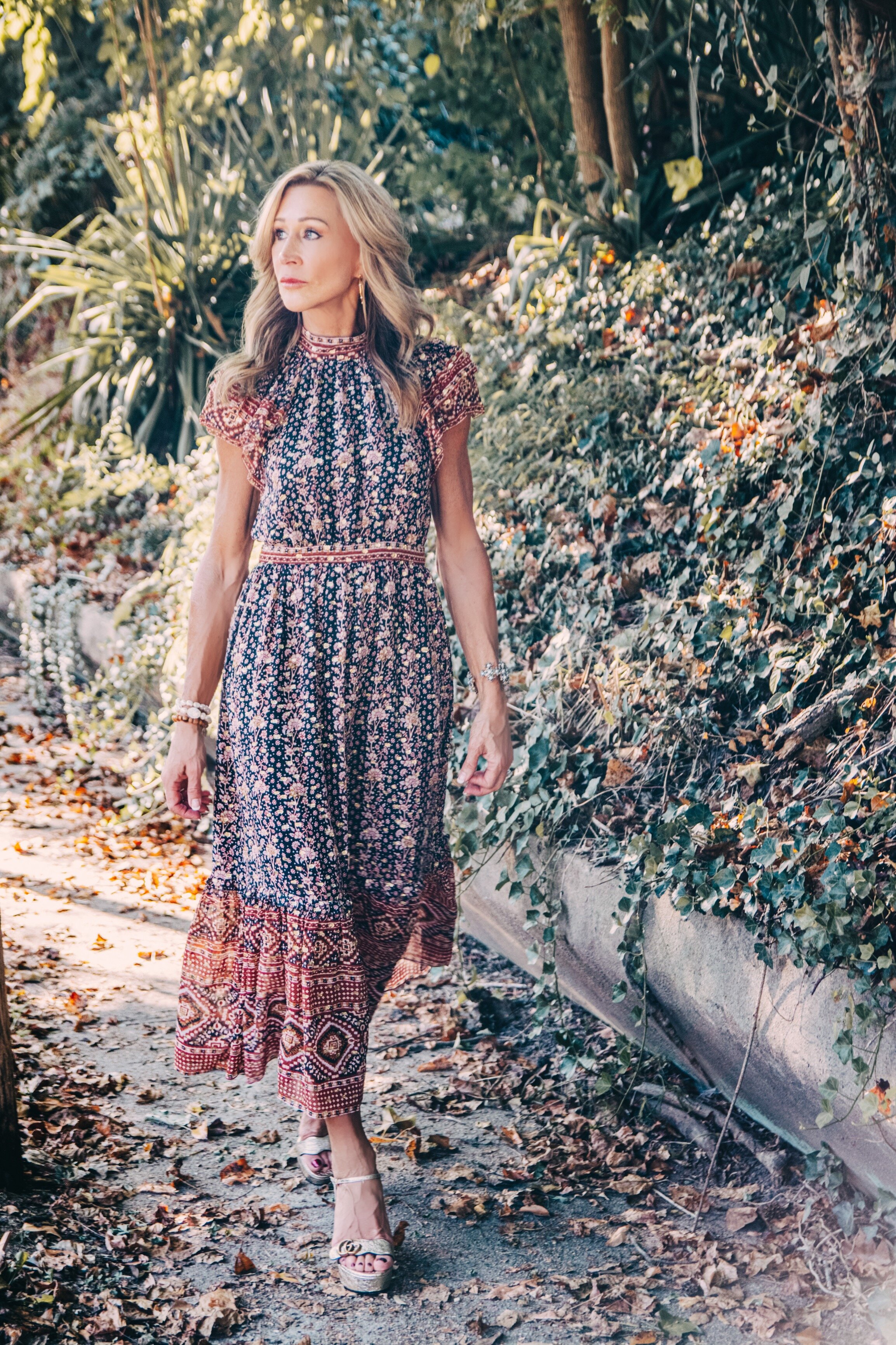 You might wonder how Iβm going to tie in this beautiful Ulla Johnson dress to what Iβm saying, but the dress truly did inspire me to talk about dreams and grand visions. When I saw it, I immediately fell in love with it and the word that came to mind was ethereal. When I looked up the definition of ethereal, it wasβ¦extremely delicate and light in a way that seems too perfect for this world! The flecks of metallic gold and the deep rich fall colors make it shimmer like the light coming through the trees on the most beautiful fall day. Itβs a vision of how I want my life to be!