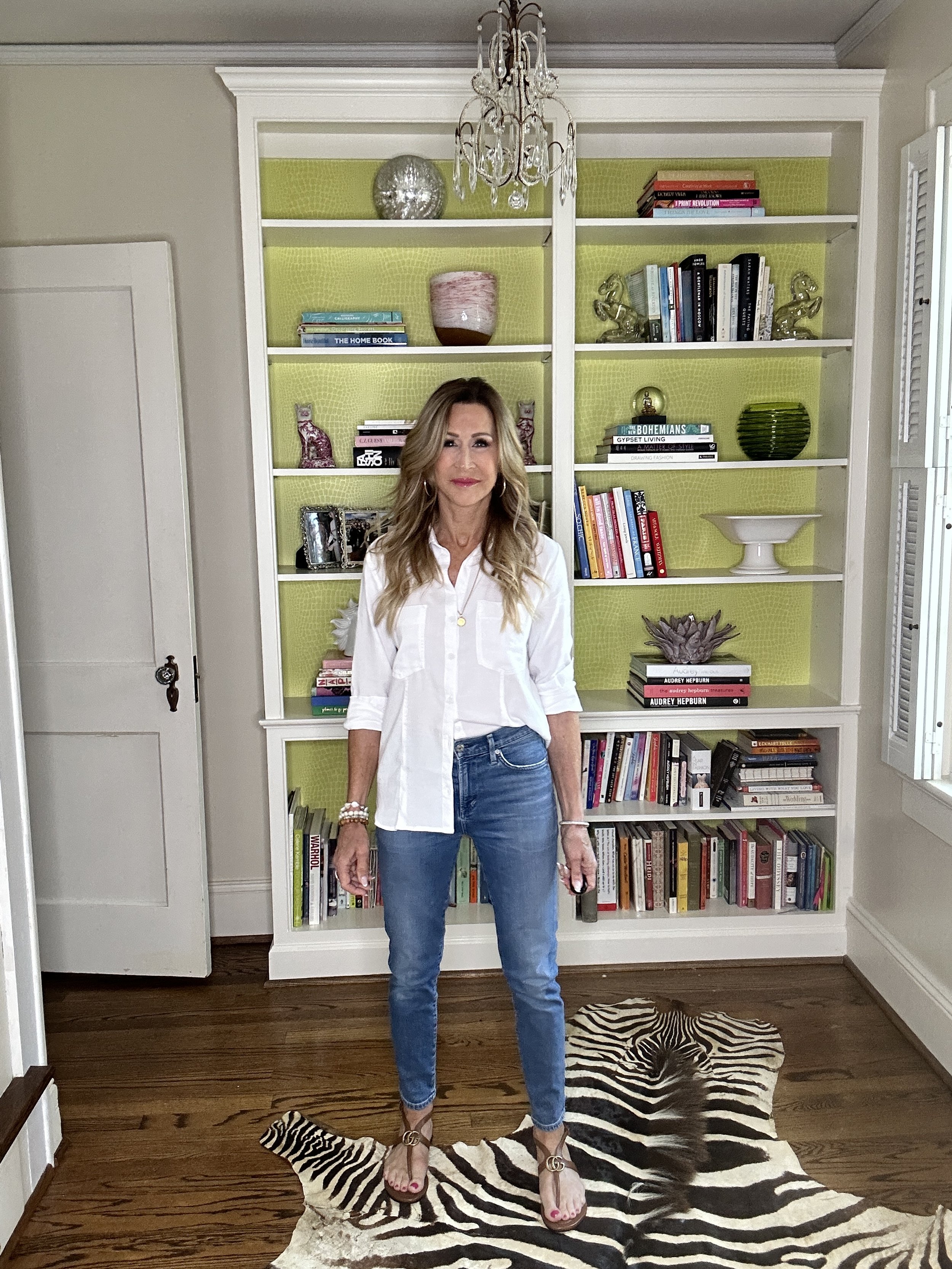 My white monochromatic look above is fresh and summery…white denim paired with a cute cotton blouse and the silver platforms. I added a bag from my closet for some bling and color (similar here)! Again, this look would be great with flat sandals like these from Tory Burch, for a more casual look!