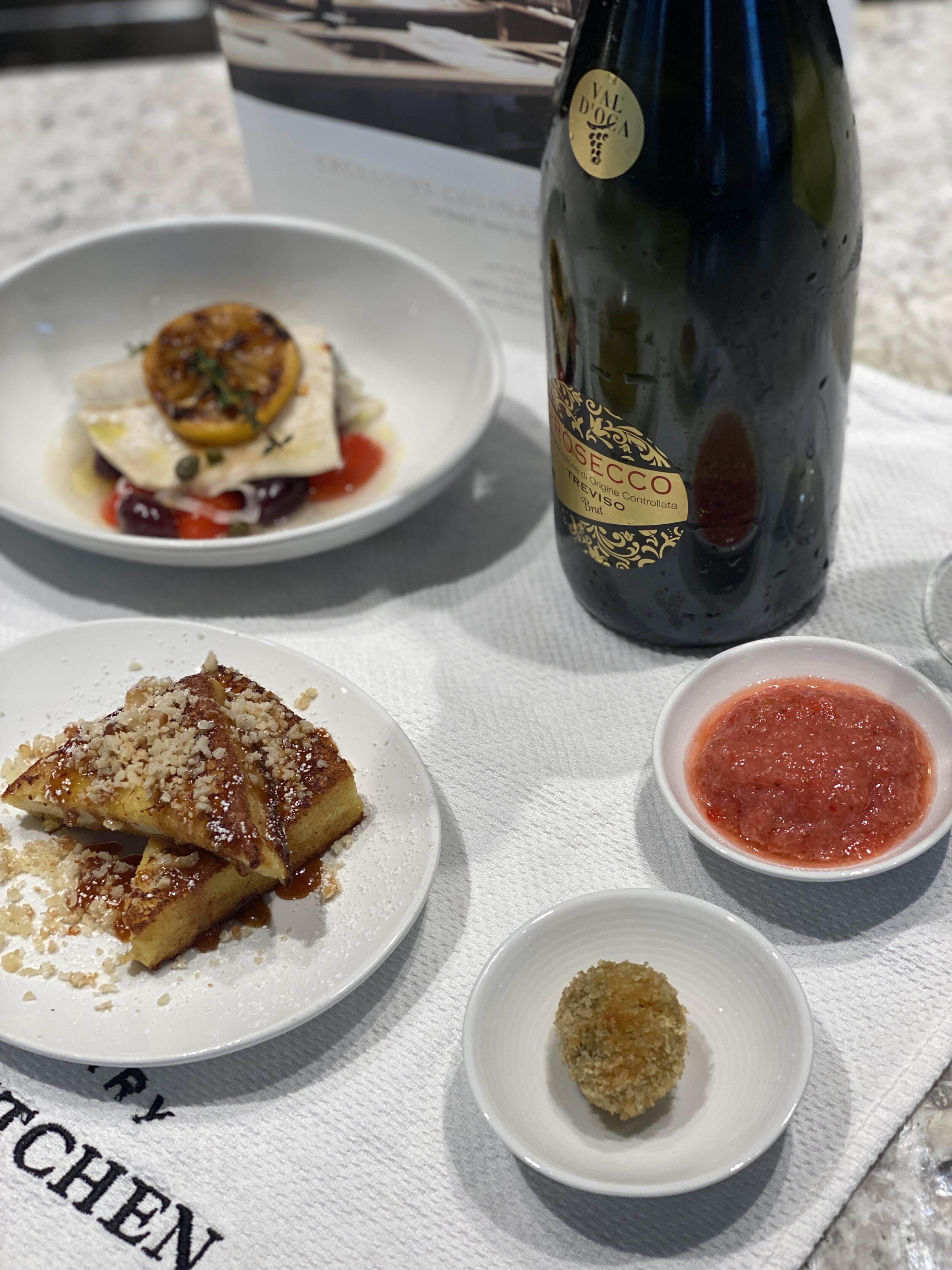 I know I keep saying βmy favorite'β, but the cooking class that we took in the Culinary Arts Kitchen was a highlight of the trip for me! I love to cook as you know and this was just so much fun! Each participant had a stovetop as well as utensils and an apron to take home. After we had a glass of bubbly and got to know each other, we made poached Branzino with olives, shallots and cherry tomatoes and a BrΓ»lΓ©ed French Toast. It was all delicious and Iβm excited to make it for Baldy now that weβre home, only who will clean up after me?!
