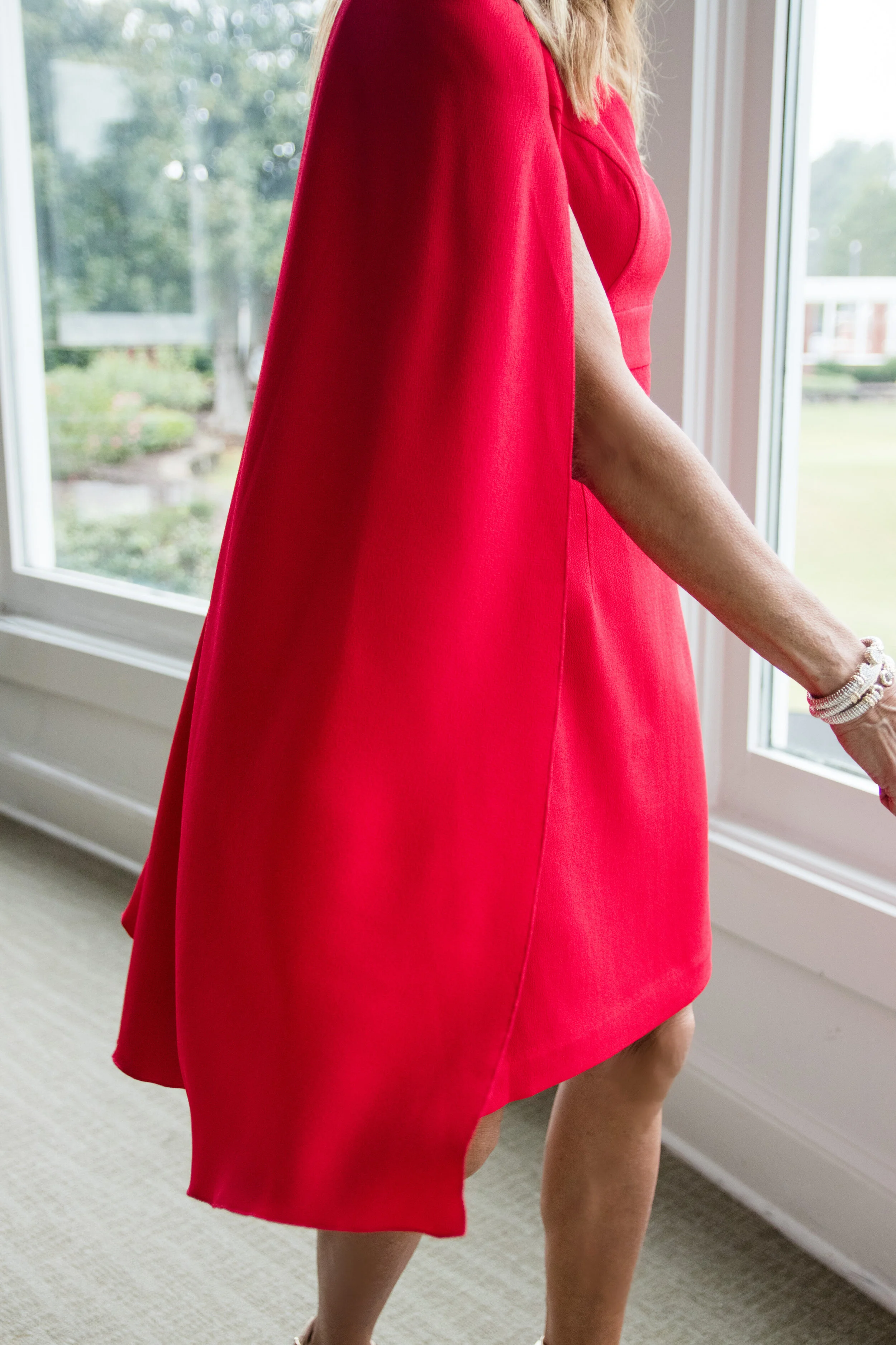 I am simply in love with this festive red dress! The color is just the right shade of red and the cape makes it feel even more special plus it adds a little bit of warmth for a chilly evening! I paired it with a pair of gold strappy sandals from Valentino and beautiful Vahan Jewelry! The dress stands on its own and doesnβt need a too much accessorizing.