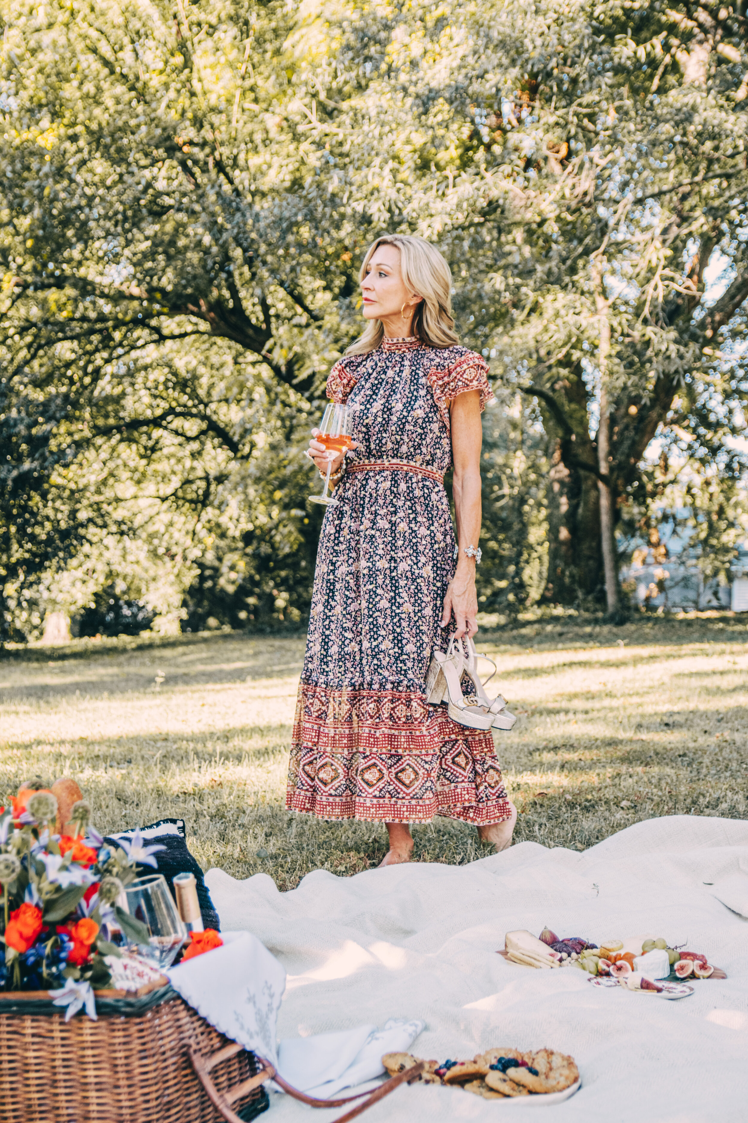 The rich color palette of this dress, including flecks of gold and autumnal colors made it the perfect choice for my picnic.