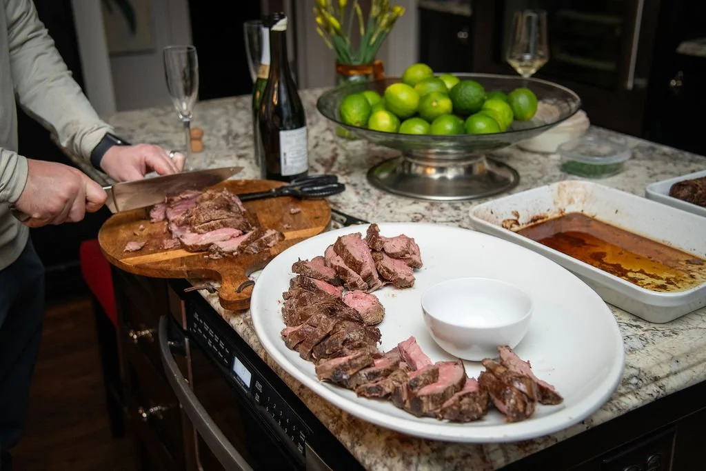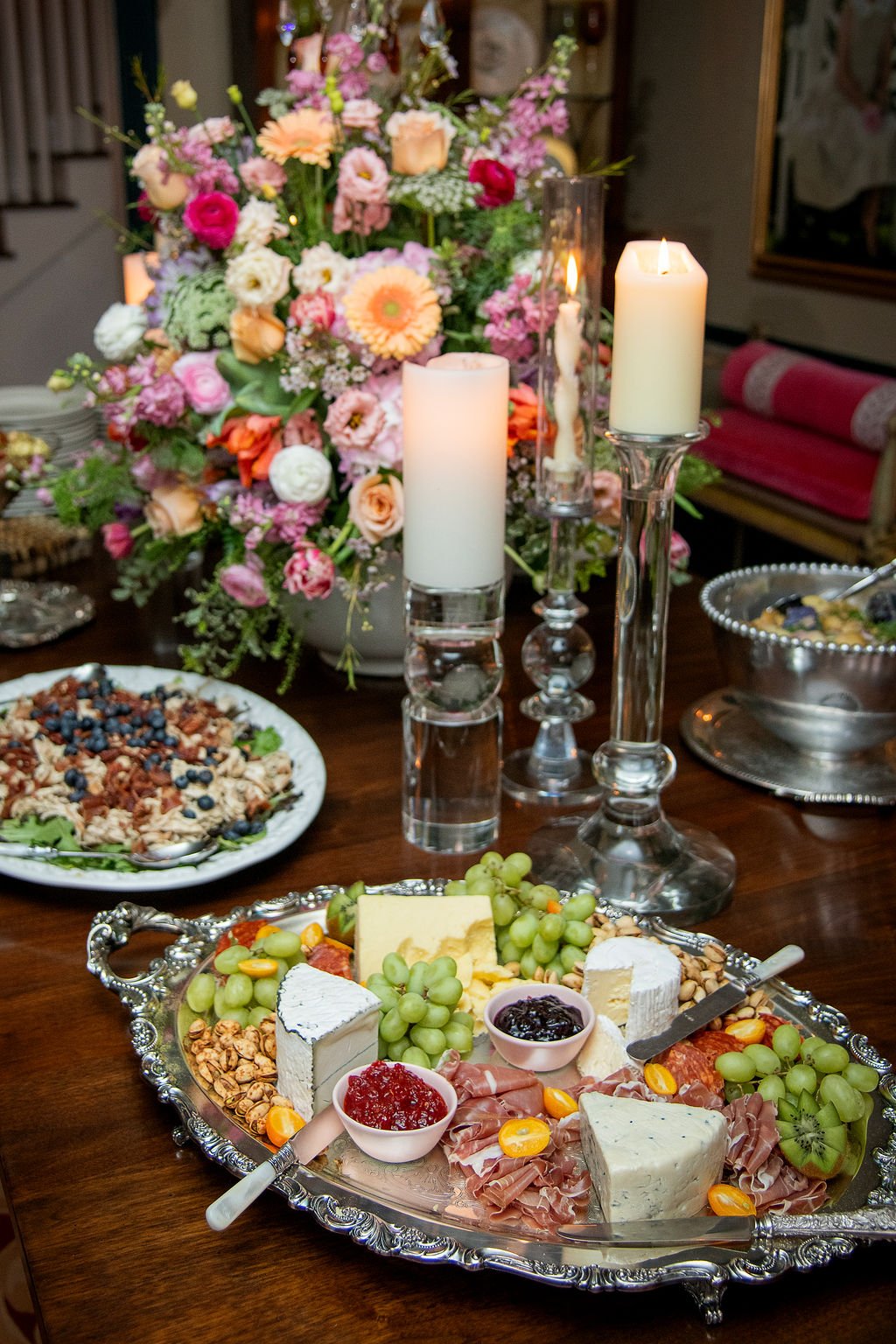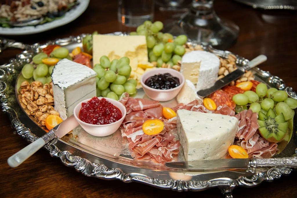 A great cheese board is an art form...and this one was no exception. Set on my vintage silver tray, it had a selection of our favorite cheeses, prosciutto, pistachios, grapes, kumquats, and a cherry jam along with a spicy one. It was the first thing people gathered around and it disappeared quickly. I've found that a beautiful board on a beautiful tray needs very little elseβ¦itβs something everyone loves!