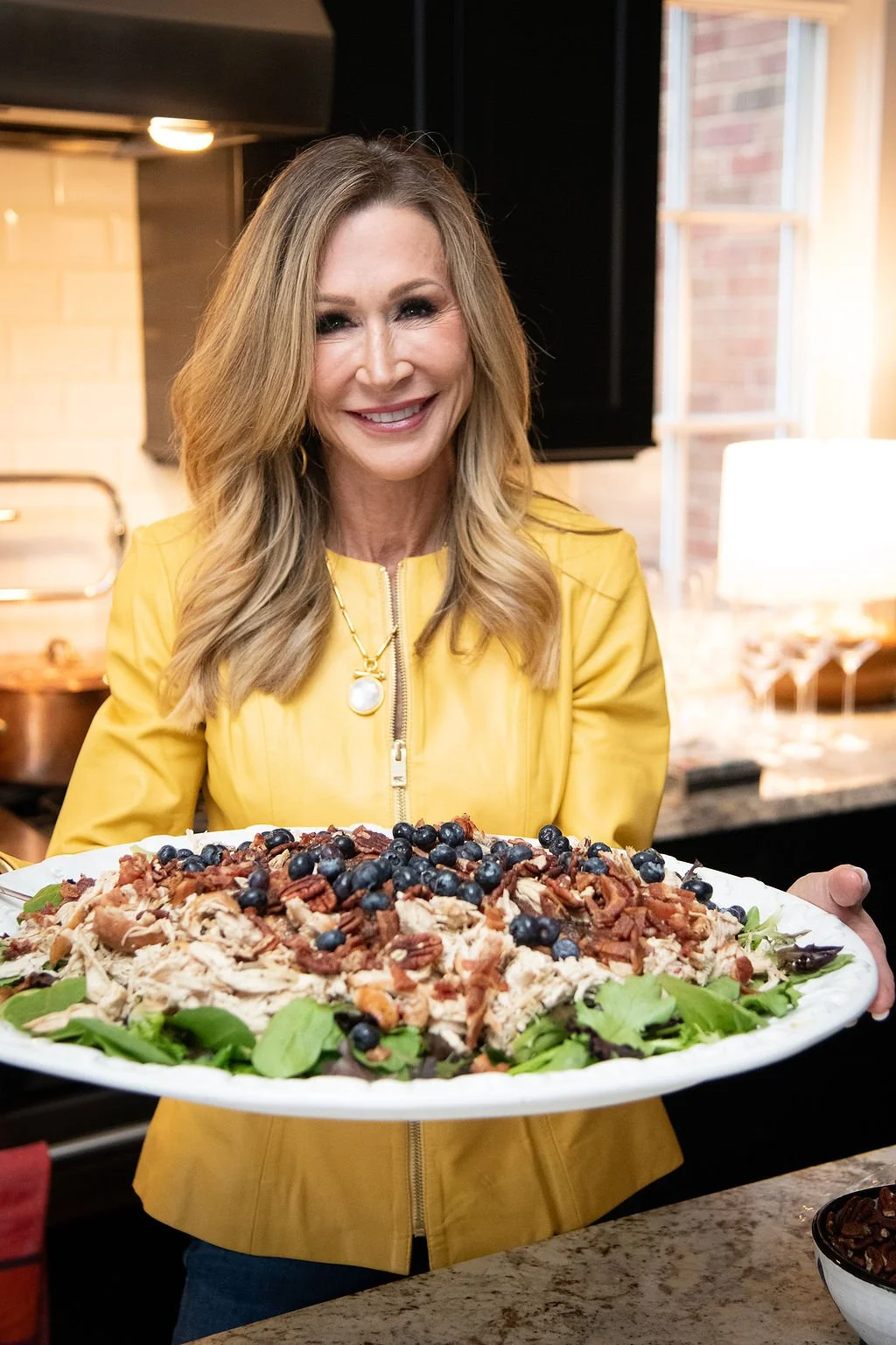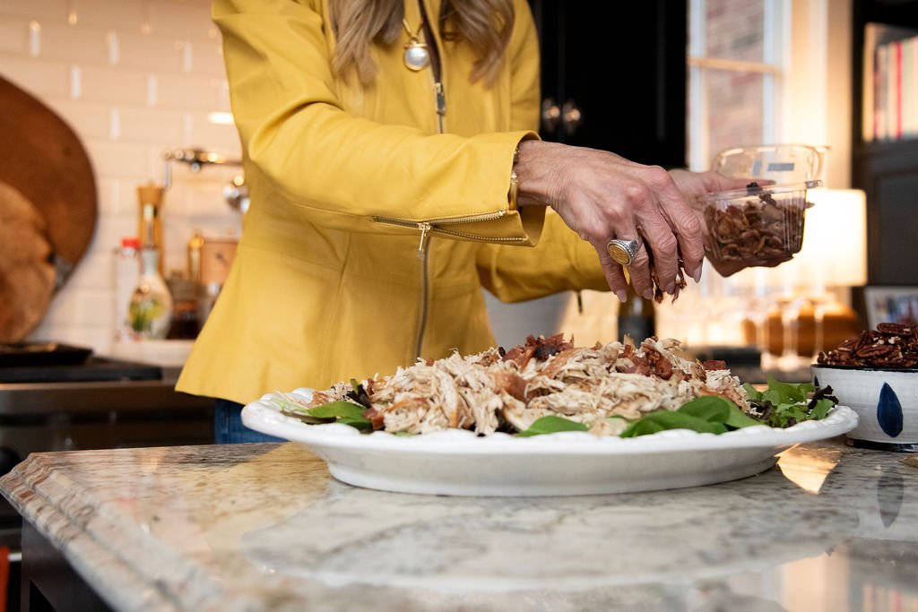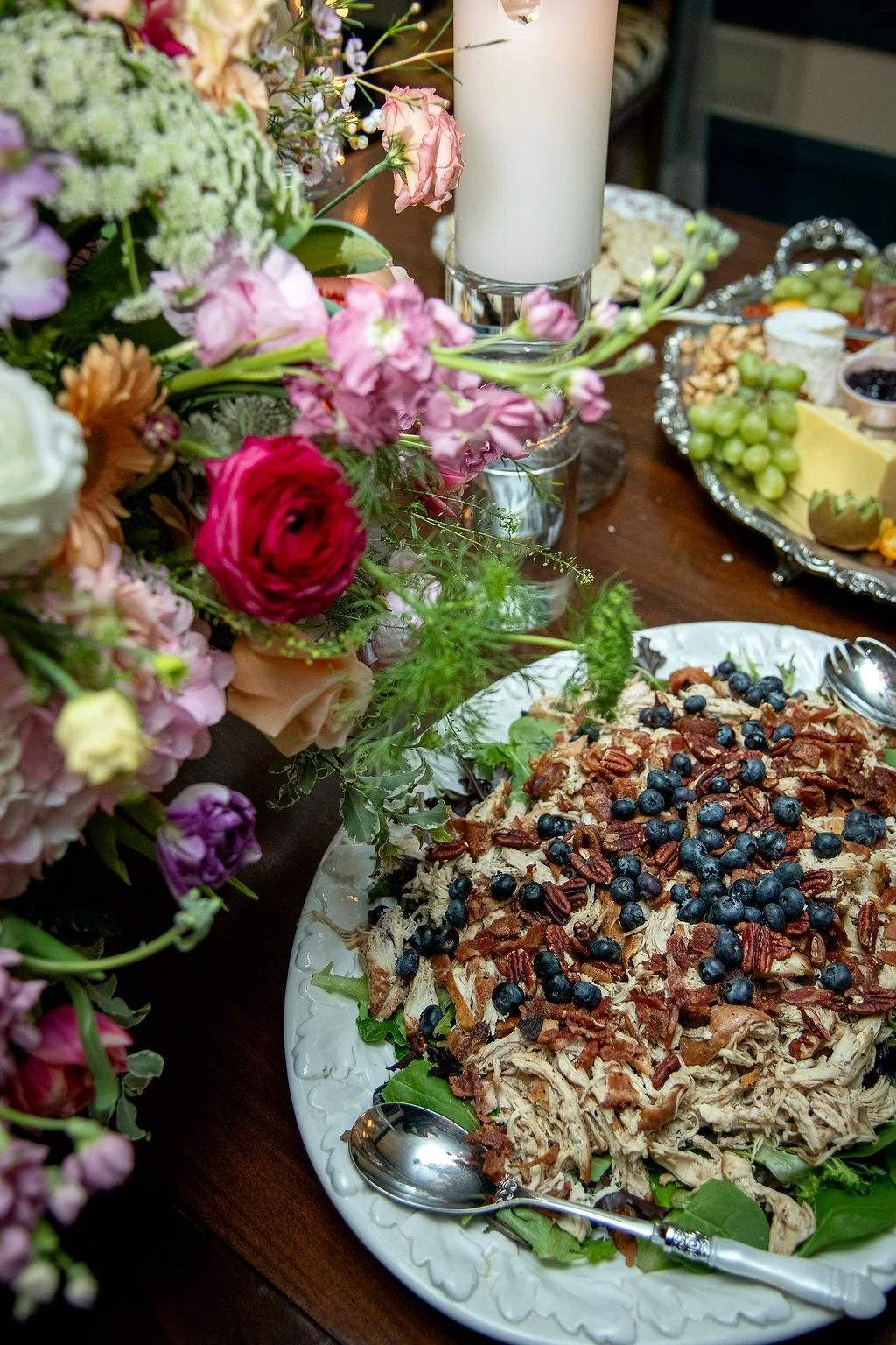 I've been cooking for this family for a long time and nothing makes me happier than feeding the people I love most. For Lauren's party I made a smoked chicken salad...smoked chicken that I smoked myself, on a bed of mixed greens, topped with crumbled bacon, fresh blueberries and toasted pecans, finished with a blueberry vinaigrette. It's as pretty as it is delicious and it feeds a crowd beautifully because the elements can be done ahead and put together at the last minute. I also made a fresh mozzarella salad with pesto...simple, bright and perfect for spring. My son-in-law brought his world famous tenderloin, which is always the moment everyone has been waiting forβ¦including me!
